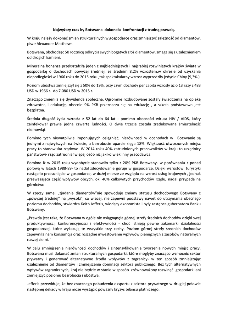 Najwyższy czas by Botswana dokonała konfrontacji z trudną prawdą. W kraju należy dokonać zmian strukturalnych w gospodarce oraz zmniejszyć zależność od diamentów, pisze Alexander Matthews. Botswana, obchodząc 50 rocznicę odkrycia swych bogatych złóż diamentów, zmaga się z uzależnieniem od drogich kamieni. Mineralna bonanza przekształciła jeden z najbiedniejszych i najsłabiej rozwiniętych krajów świata w gospodarkę o dochodach powyżej średniej, ze średnim 8,2% wzrostem,w okresie od uzyskania niepodległości w 1966 roku do 2015 roku ,tak spektakularny wzrost wyprzedziły jedynie Chiny (9,3% ). Poziom ubóstwa zmniejszył się z 50% do 19%, przy czym dochody per capita wzrosły aż o 13 razy z 483 USD w 1966 r. do 7.080 USD w 2015 r. Znacząco zmieniła się dywidenda społeczna. Ogromnie rozbudowane zostały świadczenia na opiekę zdrowotną i edukację, obecnie 9% PKB przeznacza się na edukację , a szkoła podstawowa jest bezpłatna. Średnia długość życia wzrosła z 52 lat do 64 lat - pomimo obecności wirusa HIV / AIDS, który zainfekował prawie jedną czwartą ludności. O dwie trzecie została zredukowana śmiertelność niemowląt. Pomimo tych niewatpliwie imponujących osiągnięć, nierówności w dochodach w Botswanie są jednymi z najwyższych na świecie, a bezrobocie uparcie sięga 18%. Większość utworzonych miejsc pracy to stanowiska rządowe. W 2014 roku 40% zatrudnionych pracowników w kraju to urzędnicy państwowi- rząd zatrudniał więcej osób niż jakikolwiek inny pracodawca. Pomimo iż w 2015 roku wydobycie stanowiło tylko z 20% PKB Botswany- w porównaniu z ponad połową w latach 1988-89- to nadal zdecydowanie góruje w gospodarce. Dzięki wzrostowi turystyki nastąpiło przesunięcie w gospodarce, w dużej mierze ze względu na wzrost usług krajowych , jednak przeważająca część wpływów obcych, ok. 40% całkowitych przychodów rządu, nadal przypada na górnictwo. W rzeczy samej „zjadanie diamentów”nie spowoduje zmiany statusu dochodowego Botswany z „powyżej średniej” na „wysoki”, co wiecej, nie zapewni podstawy nawet do utrzymania obecnego poziomu dochodów, stwierdza Keith Jefferis, wiodący ekonomista i były zastępca gubernatora Banku Botswany. „Prawda jest taka, że Botswana w ogóle nie osiągnąnęła górnej strefy średnich dochodów dzięki swej produktywności, konkurencyjności i efektywności - choć istnieją pewne zakamarki działalności gospodarczej, które wykazują te wszystkie trzy cechy. Poziom górnej strefy średnich dochodów zapewniła nam konsumcja oraz rosządne inwestowanie wpływów pieniężnych z zasobów naturalnych naszej ziemi. " W celu zmniejszenia nierówności dochodów i zintensyfikowania tworzenia nowych miejsc pracy, Botswana musi dokonać zmian strukturalnych gospodarki, które mogłyby znacząco wzmocnić sektor prywatny i generować alternatywne źródła wpływów z zagranicy- w ten sposób zmniejszając uzależnienie od diamentów i zmniejszenie dominacji sektora publicznego. Bez tych alternatywnych wpływów zagranicznych, kraj nie będzie w stanie w sposób zrównoważony rozwinąć gospodarki ani zmniejszyć poziomu bezrobocia i ubóstwa. Jefferis przewiduje, że bez znacznego pobudzenia eksportu z sektora prywatnego w drugiej połowie następnej dekady w kraju może wystąpić poważny kryzys bilansu płatniczego. Rząd w Botswanie próbuje wspierać dywersyfikację gospodarczą poprzez opracowywanie kolejnych planów strategicznych i zachącając do zamówień publicznych. Ta polityka jednak nie przyniosła spodziewanych i znaczących rezultatów. Jefferis twierdzi,że należaca do państwa, Botswana Development Corporation miała wprowadzać dywersyfikację, poprzez zapewnienie finansowania i kredytów dla przedsiębiorstw, ale skończyło się na konkurowaniu z sektorem prywatnym niż uzupełnianiu go, szczególnie w zakresie nieruchomości (BDC stała się jednym z największych deweloperów w kraju). Do tego dochodzi kilka wątpliwych decyzji inwestycyjnych, np. wydanie prawie pół miliarda puli (47 milionów USD)na fabrykę szkła, która została zlikwidowana jeszcze przed otwarciem. Miejmy nadzieję, ze niedawna restrukturyzacja BDC przyczyni się uważniejszego i mądrzejszego wyboru inwestycji. Korporacja nie odpowiedziała na pytania wysłane e-mailem ani na ponaglenia do udzielenia odpowiedzi. Podejmowanie działań w dolnej części łańcucha wartości (downstream) Następną strategią gospodarczą rządu jest uzyskanie większej korzyści z diamentów poprzez działania związane z obróbką- szlifowaniem i dystrybucją (downstream activities). Szczególny nacisk położono na kopalnię tytanu De Beers, która wydobywa klejnoty tego kraju poprzez Debswana- joint venture z rządem, zdecydowano o przeniesieniu ich sortowania i międzynarodowych operacji handlowych z Londynu do Gaborone. Ta zmiana spowodowała wzrost rocznych obrotów w handlu nieoszlifowanymi diamentami z 1 mld USD do 5 mld USD. Firmy ochroniarskie oraz zajmujące się pośrednictwem, szkoleniami, normami jakościowymi utworzyły centrum i od 2014 r. dwadzieścia firm zajmujących się cięciem i polerowaniem diamentów utworzyło 3700 miejsc pracy. Minusem jest to, że mimo zwiększonej aktywności gospodarczej, gospodarka nadal zależy od diamentów - i jast poniekąd na łasce wahań popytu i wartości. Według MFW, w 2015 roku utracono 1000 miejsc pracy kiedy kilka nowych firm zajmujących się cięciem i szlifowaniem diamentów, mających siedzibę w Gaborone zbankrutowało. Było to spowodowane spadkiem cen diamentów i brakiem środków finansowych po upadku, pod koniec 2014 roku, drugiego największego na świecie banku diamentowego- Antwerp Diamond Bank. Gospodarka Botswany odnotowała 0,3% zamówień w 2015 r. stając wobec słabego popytu na diamenty na całym świecie, ale w 2016 nastąopiła poprawa poprawa zarówno jeśli chodzi o popyt jak i ceny. Firma D