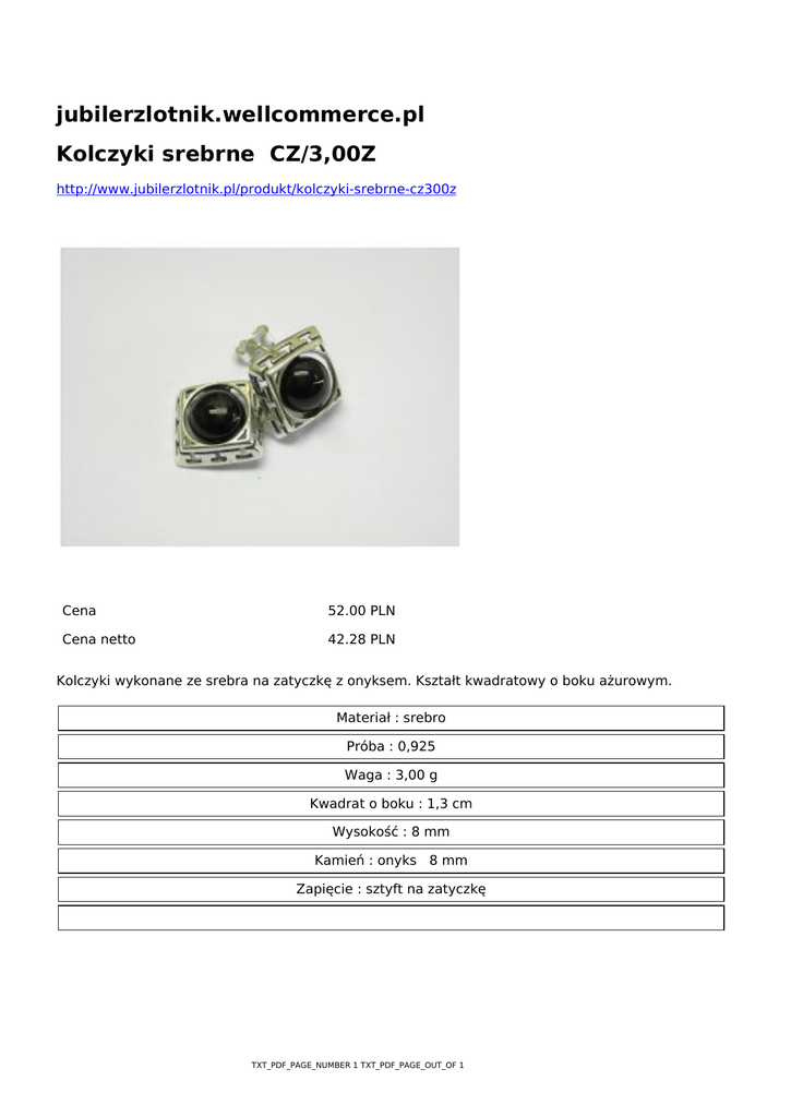 jubilerzlotnik.wellcommerce.pl Kolczyki srebrne CZ/3,00Z http://www.jubilerzlotnik.pl/produkt/kolczyki-srebrne-cz300z Cena 52.00 PLN Cena netto 42.28 PLN Kolczyki wykonane ze srebra na zatyczkę z onyksem. Kształt kwadratowy o boku ażurowym. Materiał : srebro Próba : 0,925 Waga : 3,00 g Kwadrat o boku : 1,3 cm Wysokość : 8 mm Kamień : onyks 8 mm Zapięcie : sztyft na zatyczkę TXT_PDF_PAGE_NUMBER 1 TXT_PDF_PAGE_OUT_OF 1