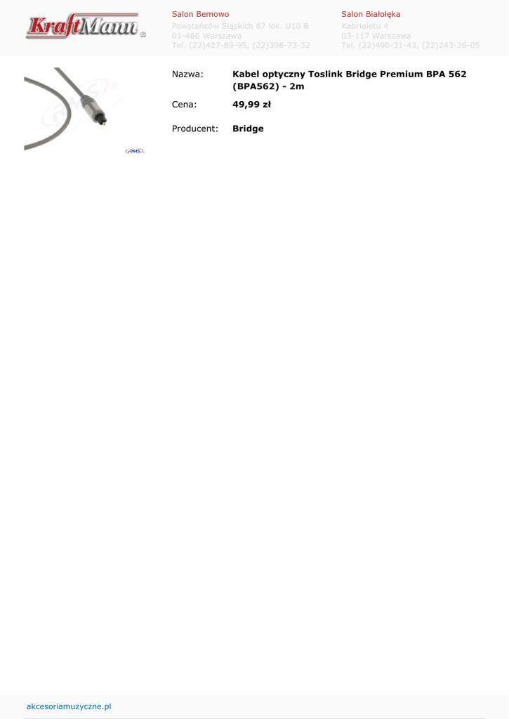 akcesoriamuzyczne.pl Salon Bemowo Salon Białołęka Powstańców Śląskich 87 lok. U10 B 01-466 Warszawa Tel. (22)427-89-95, (22)398-73-32 Kabrioletu 4 03-117 Warszawa Tel. (22)490-31-43, (22)243-36-05 Nazwa: Kabel optyczny Toslink Bridge Premium BPA 562 (BPA562) - 2m Cena: 49,99 zł Producent: Bridge