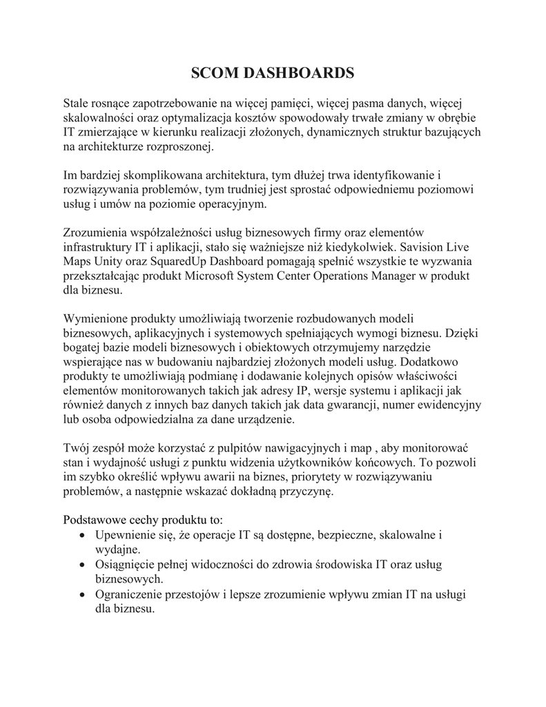 SCOM DASHBOARDS Stale rosnące zapotrzebowanie na więcej pamięci, więcej pasma danych, więcej skalowalności oraz optymalizacja kosztów spowodowały trwałe zmiany w obrębie IT zmierzające w kierunku realizacji złożonych, dynamicznych struktur bazujących na architekturze rozproszonej. Im bardziej skomplikowana architektura, tym dłużej trwa identyfikowanie i rozwiązywania problemów, tym trudniej jest sprostać odpowiedniemu poziomowi usług i umów na poziomie operacyjnym. Zrozumienia współzależności usług biznesowych firmy oraz elementów infrastruktury IT i aplikacji, stało się ważniejsze niż kiedykolwiek. Savision Live Maps Unity oraz SquaredUp Dashboard pomagają spełnić wszystkie te wyzwania przekształcając produkt Microsoft System Center Operations Manager w produkt dla biznesu. Wymienione produkty umożliwiają tworzenie rozbudowanych modeli biznesowych, aplikacyjnych i systemowych spełniających wymogi biznesu. Dzięki bogatej bazie modeli biznesowych i obiektowych otrzymujemy narzędzie wspierające nas w budowaniu najbardziej złożonych modeli usług. Dodatkowo produkty te umożliwiają podmianę i dodawanie kolejnych opisów właściwości elementów monitorowanych takich jak adresy IP, wersje systemu i aplikacji jak również danych z innych baz danych takich jak data gwarancji, numer ewidencyjny lub osoba odpowiedzialna za dane urządzenie. Twój zespół może korzystać z pulpitów nawigacyjnych i map , aby monitorować stan i wydajność usługi z punktu widzenia użytkowników końcowych. To pozwoli im szybko określić wpływu awarii na biznes, priorytety w rozwiązywaniu problemów, a następnie wskazać dokładną przyczynę. Podstawowe cechy produktu to: • Upewnienie się, że operacje IT są dostępne, bezpieczne, skalowalne i wydajne. • Osiągnięcie pełnej widoczności do zdrowia środowiska IT oraz usług biznesowych. • Ograniczenie przestojów i lepsze zrozumienie wpływu zmian IT na usługi dla biznesu. • Szybko koreluje zakłóceń w usługach biznesowych z problemami aplikacji / infrastruktury. • Skraca czas reakcji na problemy klientów (wewnętrznych i zewnętrznych). • Upewnienie się, że odpowiednie osoby otrzymują właściwe informacje, bez względu na czas, miejsce i urządzenie. • Import danych w formacie JSON umożliwiający szybką automatyzację tworzenia modelu aplikacji. SQUARED UP DASHBOARD – http://demo.squaredup.com/SquaredUp/grid/index/app360 SAVISION LIVE MAP UNITY – https://www.savision.com/products/live-maps-unity-business-service-managementmicrosoft-system-center Zakres funkcjonalności oferowany przez prezentowane rozwiązania i nie obsługiwany przez Microsoft System Center Operations Manager: • Produkt Microsoft System Center Operation Manager, będący składnikiem pakietu System Center Data Center, nie posiada gotowej biblioteki modeli logicznych koniecznych do definiowania struktury usług i aplikacji. Dodanie i modyfikacji modeli bezpośrednio przy pomocy konsoli administratora nie jest również możliwa. Nie ma możliwości graficznego budowania złożonych modeli aplikacji. • Produkt System Center Operations Manager nie umożliwia dodawania dowolnych atrybutów wraz z możliwością interaktywnej (graficznej) edycji wartości tych atrybutów. Modele aplikacji rozproszonej używane przez system SCOM są statyczne. Widoki w systemie SCOM nie umożliwiają wyboru odpowiednich własności klas i pokazywania wybranych z nich na ekranie. • Produkt System Center Operations Manager nie wspiera formatu plików JSON. Nie ma możliwości importu ani eksportu danych w tym formacie przy pomocy konsoli SCOM.