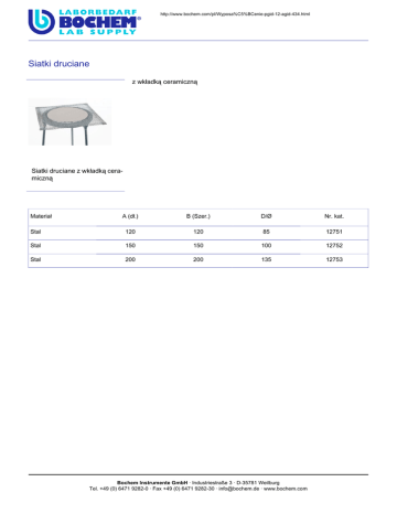 http://www.bochem.com/pl/Wyposa%C5%BCenie-pgid-12-agid-434.html Siatki�druciane z�wkładką�ceramiczną Siatki�druciane�z�wkładką�ceramiczną Materiał A�(dł.) B�(Szer.) D/Ø Nr.�kat. Stal 120 120 85 12751 Stal 150 150 100 12752 Stal 200 200 135 12753 Bochem Instrumente GmbH · Industriestraße 3 · D-35781 Weilburg Tel. +49 (0) 6471 9282-0 · Fax +49 (0) 6471 9282-30 · [email protected] · www.bochem.com
