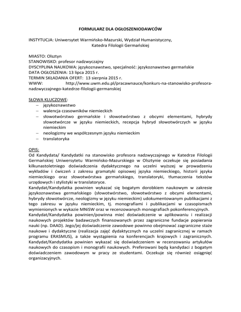 FORMULARZ DLA OGŁOSZENIODAWCÓW INSTYTUCJA: Uniwersytet Warmińsko-Mazurski, Wydział Humanistyczny, Katedra Filologii Germańskiej MIASTO: Olsztyn STANOWISKO: profesor nadzwyczajny DYSCYPLINA NAUKOWA: językoznawstwo, specjalność: językoznawstwo germańskie DATA OGŁOSZENIA: 13 lipca 2015 r. TERMIN SKŁADANIA OFERT: 13 sierpnia 2015 r. WWW: http://www.uwm.edu.pl/pracawnauce/konkurs-na-stanowisko-profesoranadzwyczajnego-katedrze-filologii-germanskiej SŁOWA KLUCZOWE: językoznawstwo walencja czasowników niemieckich słowotwórstwo germańskie i słowotwórstwo z obcymi elementami, hybrydy słowotwórcze w języku niemieckich, recepcja hybryd słowotwórczych w języku niemieckim neologizmy we współczesnym języku niemieckim translatoryka OPIS: Od Kandydata/ Kandydatki na stanowisko profesora nadzwyczajnego w Katedrze Filologii Germańskiej Uniwersytetu Warmińsko-Mazurskiego w Olsztynie oczekuje się posiadania kilkunastoletniego doświadczenia dydaktycznego na uczelni wyższej w prowadzeniu wykładów i ćwiczeń z zakresu gramatyki opisowej języka niemieckiego, historii języka niemieckiego oraz słowotwórstwa germańskiego, translatoryki, tłumaczenia tekstów urzędowych i stylistyki w translatoryce. Kandydat/Kandydatka powinien wykazać się bogatym dorobkiem naukowym w zakresie językoznawstwa germańskiego (słowotwórstwo, słowotwórstwo z obcymi elementami, hybrydy słowotwórcze, neologizmy w języku niemieckim) udokumentowanym publikacjami z tego zakresu w języku niemieckim, tj. monografiami i publikacjami w czasopismach wymienionych w wykazie MNiSW oraz w recenzowanych monografiach pokonferencyjnych. Kandydat/Kandydatka powinien/powinna mieć doświadczenie w aplikowaniu i realizacji naukowych projektów badawczych finansowanych przez zagraniczne fundacje popierania nauki (np. DAAD). Jego/jej doświadczenie zawodowe powinno obejmować zagraniczne staże naukowe i dydaktyczne (realizacja zajęć dydaktycznych na uczelni zagranicznej w ramach programu ERASMUS), a także wystąpienia na konferencjach krajowych i zagranicznych. Kandydat/Kandydatka powinien wykazać się doświadczeniem w recenzowaniu artykułów naukowych do czasopism i monografii naukowych. Preferowani będą kandydaci z bogatym doświadczeniem zawodowym w pracy ze studentami. Oczekuje się również osiągnięć organizacyjnych.