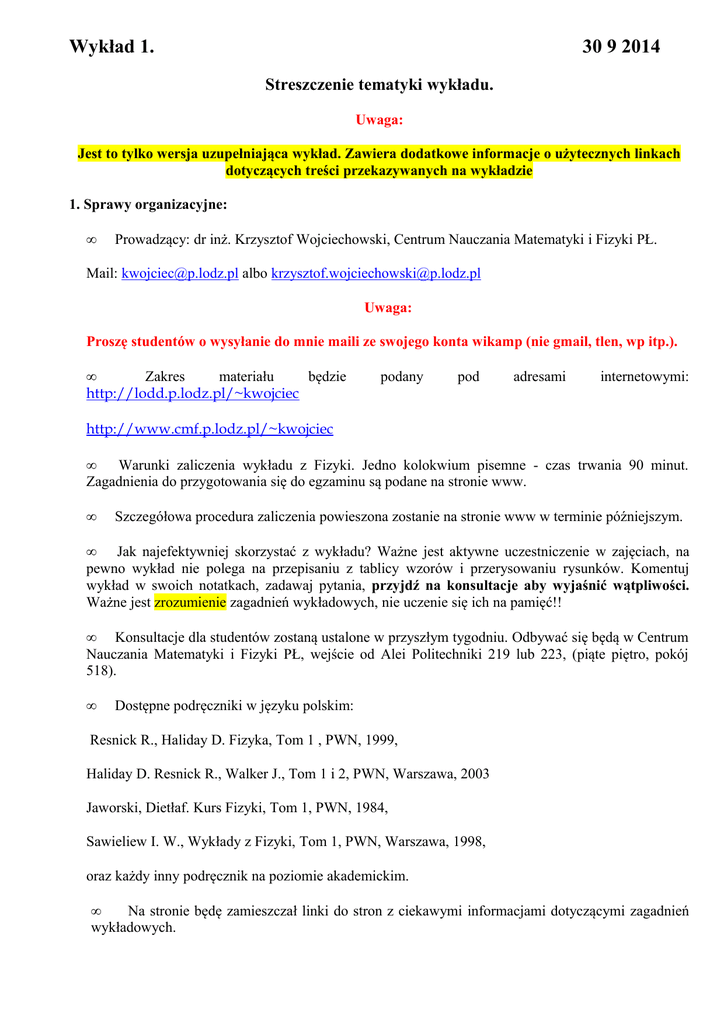 Wykład 1. 30 9 2014 Streszczenie tematyki wykładu. Uwaga: Jest to tylko wersja uzupełniająca wykład. Zawiera dodatkowe informacje o użytecznych linkach dotyczących treści przekazywanych na wykładzie 1. Sprawy organizacyjne: • Prowadzący: dr inż. Krzysztof Wojciechowski, Centrum Nauczania Matematyki i Fizyki PŁ. Mail: [email protected] albo [email protected] Uwaga: Proszę studentów o wysyłanie do mnie maili ze swojego konta wikamp (nie gmail, tlen, wp itp.). • Zakres materiału będzie http://lodd.p.lodz.pl/~kwojciec podany pod adresami internetowymi: http://www.cmf.p.lodz.pl/~kwojciec • Warunki zaliczenia wykładu z Fizyki. Jedno kolokwium pisemne - czas trwania 90 minut. Zagadnienia do przygotowania się do egzaminu są podane na stronie www. • Szczegółowa procedura zaliczenia powieszona zostanie na stronie www w terminie późniejszym. • Jak najefektywniej skorzystać z wykładu? Ważne jest aktywne uczestniczenie w zajęciach, na pewno wykład nie polega na przepisaniu z tablicy wzorów i przerysowaniu rysunków. Komentuj wykład w swoich notatkach, zadawaj pytania, przyjdź na konsultacje aby wyjaśnić wątpliwości. Ważne jest zrozumienie zagadnień wykładowych, nie uczenie się ich na pamięć!! • Konsultacje dla studentów zostaną ustalone w przyszłym tygodniu. Odbywać się będą w Centrum Nauczania Matematyki i Fizyki PŁ, wejście od Alei Politechniki 219 lub 223, (piąte piętro, pokój 518). • Dostępne podręczniki w języku polskim: Resnick R., Haliday D. Fizyka, Tom 1 , PWN, 1999, Haliday D. Resnick R., Walker J., Tom 1 i 2, PWN, Warszawa, 2003 Jaworski, Dietłaf. Kurs Fizyki, Tom 1, PWN, 1984, Sawieliew I. W., Wykłady z Fizyki, Tom 1, PWN, Warszawa, 1998, oraz każdy inny podręcznik na poziomie akademickim. • Na stronie będę zamieszczał linki do stron z ciekawymi informacjami dotyczącymi zagadnień wykładowych. 2. Krótki przegląd zagadnień wstępnych. • Zakres zainteresowań fizyki to ogólnie pojęta filozofia przyrody. • Zakres rozmiarów obserwowanego świata według rzędów wielkości: 10-15m to rozmiar protonu, 1026m to widzialny Wszechświat. Uważamy, że Prawa Fizyki są uniwersalne i obowiązują także w tych ekstremalnych obszarach. Uwaga: Dostosuj zawsze wielkości porównywane do rozmiarów dostępnych naszym zmysłom poprzez zastosowanie modelu w odpowiedniej skali. Wielkie i bardzo małe liczby w fizyce. Czy to dużo 1010 ? Niby tak, ale jak dużo? Wyobraź sobie, że każdy mieszkaniec Ziemi wpłaca na Twoje konto 1 grosz. Okazuje się, że prawdopodobnie nie studiujesz już Elektroniki. Masz na koncie około 6.109groszy czyli 60 milionów złotych! Teraz ta liczba 10 10 nam jakby więcej mówi. Co więc powiedzieć o liczbie 1026m, która w metrach wyraża rozmiar widzialnego Wszechświata? Wielkości bardzo małe również są niewyobrażalne. 10-15m, czyli rozmiar protonu to problem niezwykle małej wielkości. Pojęcie rzędu wielkości. Wartość 1m to typowy rząd wielkości określający wzrost ludzi. To znaczy, że jeśli ktoś ma 1,78m albo 2,05m to ciągle mówimy, że ma wzrost rzędu 1m. Zajmijmy się atomem wodoru o rozmiarach rzędu 10 -10 m. To też niezmiernie mało. Problem powstaje, gdy chcemy sobie zestawić razem te dwie malutkie wielkości 10 -15 m oraz 10-10 m. Jak najprościej sobie uświadomić ich wzajemną skalę. Wprawny fizyk po prostu podzieli większą wielkość przez mniejszą i otrzyma wartość mówiącą ile razy atom wodoru jest większy od protonu. Odpowiedź brzmi 105 razy czyli 100000 razy. Aby to jeszcze plastyczniej sobie uświadomić zbudujmy "pomnik" atomu wodoru powiększony 1015 razy. Proton ma w tej skali rozmiar 1m. Umieśćmy go na pomniku Kościuszki na placu Wolności w Łodzi. Odpowiedzmy szybko, gdzie w naszym pomniku atomu będzie elektron. Średnica atomu wodoru w tym modelu ma 10 5m, czyli 100 km. Widać, że atom sięga rozmiarami daleko poza Zgierz i Pabianice! Przedrostki w fizyce. Ten przykład pokazuje potrzebę uważnego używania przedrostków wielkości fizycznych. Jeden litr piwa to porcja akceptowalna (?) do jednorazowego spożycia jeśli nie planujemy żadnej dalszej pracy na przykład w piątkowy wieczór. A jeśli to będzie hektolitr? To jest problem bo mamy 100 litrów i raczej jest to ilość do spożycia raczej dla całego kierunku Elektroniki a nie jednostki! Wnioski wynikające z tych przykładów: Naucz się szacować rząd wielkości analizowanych pomiarów. Zawsze sprawdź czy są sensowne. Bardzo często wyniki obliczeń z powodu przeoczenia, pomyłki itp. różnią się od spodziewanych o wiele rzędów wielkości. Stosuj zapis z wynikiem liczbowym i mianem odpowiedniej wielkości fizycznej. Otrzymywałem już wyniki pomiarów laboratoryjnych z prądami 100A zamiast 100µA (czyli mikroamperów). Przepłynięcie prądu 100A przez typowy miedziany przewód laboratoryjny (taki z bananowymi wtyczkami) spowodowałby prawdopodobnie odparowanie metalu w ułamku sekundy z uwagi na wydzielone ciepło. 3. Wprowadzenie do zagadnień metodologii fizyki. Wyobraźmy sobie taką sekwencję zdarzeń: obserwacja zjawiska - budowa modelu matematycznego - weryfikacja eksperymentalna oraz teoretyczna - akceptacja przyjętych założeń oraz zbudowanego modelu albo poprawienie modelu poprzez uzupełnienie go o nowe dane. Fizyka systematyzuje obserwowane zjawiska. Budujemy w oparciu o obserwacje model. Jest on najczęściej uproszczonym opisem rzeczywistego zjawiska. Potem poddajemy go procedurze weryfikacji czyli sprawdzamy jego poprawność i albo akceptujemy, albo wprowadzamy poprawki aby uwzględnić kolejne elementy zjawiska. Model się komplikuje ale za to lepiej przewiduje zachowanie się naszego układu. Przykład. Interesuje nas opis zjawiska ruchu pociągu relacji Łódź Fabryczna Warszawa Wschodnia. Budujemy pierwszy model. Pociąg jako punkt przemieszcza się wzdłuż linii kolejowej do Warszawy. Możemy obliczyć i narysować szybko