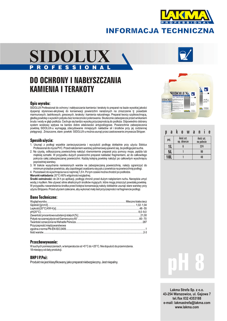 INFORMACJA TECHNICZNA SIDOLUX P R O F E S S I O N A L DO OCHRONY I NABŁYSZCZANIA KAMIENIA I TERAKOTY Opis wyrobu: SIDOLUX Professional do ochrony i nabłyszczania kamienia i terakoty to preparat na bazie wysokiej jakości dyspersji styrenowo-akrylowej do konserwacji powierzchni narażonych na zniszczenie tj: posadzek marmurowych, lastrikowych, gresowych, terakoty i kamienia naturalnego. Preparat tworzy szybkoschnącą, gładką powłokę o wysokim połysku bez konieczności polerowania. Skutecznie zabezpiecza przed wnikaniem brudu i wody w głąb podłoża. Cechuje się bardzo wysoką przyczepnością do podłoża. Odpowiednio dobrany system woskowy wpływa na bardzo dobre właściwości antypoślizgowe. Powierzchnie zabezpieczona powłoką SIDOLUX-u wymagają zdecydowanie mniejszych nakładów sił i środków przy jej codziennej pielęgnacji. Zniszczone, stare powłoki SIDOLUX-u można usunąć przez zastosowanie zmywacza Stripper. Sposób użycia: 1. Usunąć z podłogi wszelkie zanieczyszczenia i wyczyścić podłogę dokładnie przy użyciu Sidolux Professional do mycia PVC. Przed nałożeniem warstwy polimerowej upewnić się, że podłoga jest sucha. 2. Na czystą, odtłuszczoną powierzchnię nałożyć równomiernie preparat przy pomocy mopa, pędzla lub miękkiej szmatki. W przypadku dużych powierzchni preparat nakładać fragmentami, aż do całkowitego pokrycia całej zabezpieczanej powierzchni. Każdą kolejną powłokę nałożyć po całkowitym wyschnięciu poprzedniej warstwy. 3. W trakcie wysychania naniesionych warstw na zabezpieczaną powierzchnię, należy ograniczyć do minimum przepływ powietrza, aby zapobiegać osadzaniu się pyłu z powietrza na powierzchnię podłogi. 4. Pozostawić do wyschnięcia na co najmniej 1,5 h. Po tym czasie można chodzić po podłodze. Warunki nakładania: 20°C i 60% wilgotności względnej. Środki ostrożność: do 24 h po aplikacji, podłogę chronić przed dużym natężeniem ruchu. Narzędzia umyć wodą z mydłem. Nie używać silnie alkalicznych środków myjących, które mogą zniszczyć powstałą powłokę. W przypadku nawarstwienia środka przed kolejna konserwacją należy dokładnie usunąć stare warstwy przy użyciu Strippera. Przed użyciem zalecane, aby wykonać mały test przyczepności na fragmencie podłogi. p a k o w a n i e poj. 1L 5L 10L ilość szt. op. zbiorcze 6 ilość szt. na palecie 324 1 90 1 40 Dane Techniczne: Wygląd wyrobu................................................................................................................... Mleczno biała ciecz Gęstość [g/cm3]................................................................................................................................ 1,02- 1,04 Lepkość(20°C) KW 4 [s]..........................................................................................................................48 - 55 pH(20°C).............................................................................................................................................. 8,0- 9,0 Zawartość procentowa substancji stałych [%]...........................................................................................21,00 Połysk na czarnej płycie wd Garnera przy 60˚..........................................................................................60 - 70 Twardość oznaczona na Wahadle Persoza................................................................................................. 287 Przyczepność międzywarstwowa zgodna z norma PN-EN ISO 2409....................................................................................................................1 Ilość warstw..................................................................................................................................................2-3 Przechowywanie: W suchych pomieszczeniach, w temperaturze od +5°C do +25°C. Nie dopuścić do przemrożenia. 18 miesięcy od daty produkcji. BHP I P.Poż: Produkt nie jest klasyfikowany jako preparat niebezpieczny. Jest niepalny. pH 8 Lakma Strefa Sp. z o.o. 43-254 Warszowice, ul. Gajowa 7 tel./fax 032 4353188 e-mail: [email protected] www.lakma.com