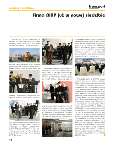 maszyny i urz¹dzenia Firma BIAP ju¿ w nowej siedzibie Dnia 26.10.2007 roku o godzinie 10 odbyło się uroczyste otwarcie nowej siedziby firmy BIAP Sp. z o.o. przy ul. Muchoborskiej 16 we Wrocławiu. Licznie zgromadzonych gości powitał prezes Leszek Sztyliński, który przed− stawił historię firmy, kolejne etapy jej automatyka, dokonał uroczystego po− święcenia nowej siedziby. Przy dźwię− kach muzyki właściciele przyjmowali gratulacje i życzenia oraz okoliczno− ściowe prezenty od gości uczestniczą− cych w tej uroczystości. Ciekawe były rozmowy kuluarowe, które toczyły się przy szwedzkim stole i akompaniującej jazzującej kapeli muzycznej. Momentem symbolicznym było po− danie sobie rąk przez czterech właści− cieli firmy: Andrzeja Morawskiego, Leszka Sztylińskiego, Michała Lewan− dowskiego i Marka Włodarczyka (stoją od lewej), którzy następnie poprzez rozwoju i podstawowe osiągnięcia. Na− stępnie profesor Jan Koch z Politech− wspólne przecięcie wstęgi dokonali ofi− cjalnego otwarcia nowego biurowca. Już w budynku ks. dr Jerzy Witczak, wykładowca Papieskiego Fakultetu Teologicznego we Wrocławiu, notabe− ne mgr inż. elektryk ze specjalnością niki Wrocławskiej omówił ideę powsta− nia Wrocławskiego Parku Technolo− gicznego, a następnie prezes WPT profesor Maciej Chorowski w kilku sło− wach podsumował kontakty z Biurem Inżynierskim Automatyki Przemysłowej BIAP Sp. z o.o. 70 Większość gości z BIAPEM łączyły kontakty biznesowe, wszyscy podkre− ślali wysoki profesjonalizm pracowników firmy. Wielu wymieniało się własnymi doświadczeniami ze współpracy z firmą i było pod wrażeniem sukcesów BIAPU. Następnie wszyscy goście mieli możli− wość zwiedzić cały obiekt w małych grupkach, które oprowadzali pracowni− cy firmy. Mimo pory roku pogoda dopi− sała i cała uroczystość odbywała się w promieniach słońca. Warto szczególnie w dzisiejszych czasach przypomnieć historię powstania BIAPU w 1990 roku. Wiedza plus energia do działania i wiele samozaparcia, mimo braku pieniędzy na starcie, zaowocowały sporymi suk− cesami. Czyli własną pracą w ciągu kil− kunastu lat można dojść całkiem legal− nie do zakładanych celów, zadając kłam sugestiom niektórych polityków, którzy sami nic nie osiągnęli. Obecnie firma zatrudnia 45 osób, w tym 32 inżynierów. Firma BIAP jest świetną wizytówką polskiej myśli technicznej i wiedzy na bardzo wysokim poziomie. Obecni byli przedstawiciele wielu firm, m.in. z KGHM, VOLVO, Jase. ■