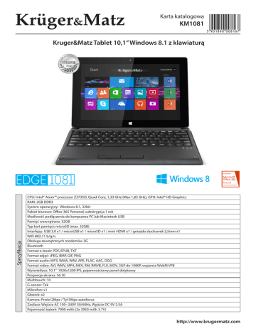 Karta katalogowa KM1081 Kruger&Matz Tablet 10,1” Windows 8.1 z klawiaturą Specyfikacja EDGE 1081 CPU: Intel® Atom™ processor Z3735D, Quad-Core, 1,33 GHz (Max 1,83 GHz), GPU: Intel® HD Graphics RAM: 2GB DDR3 System operacyjny: Windows 8.1, 32bit Pakiet biurowe: Office 365 Personal, subskrypcja 1 rok Możliwość podłączenia do komputera PC lub Macintosh USB Pamięć wewnętrzna: 32GB Typ kart pamięci: microSD (max. 32GB) Interfejsy: USB 3.0 x1 / microUSB x1 / microSD x1 / mini HDMI x1 / gniazdo słuchawek 3,5mm x1 WiFi 802.11 b/g/n Obsługa zewnętrznych modemów 3G Bluetooth Format e-book: PDF, EPUB, TXT Format zdjęć: JPEG, BMP, GIF, PNG Format audio: MP3, WMA, WAV, APE, FLAC, AAC, OGG Format video: AVI, WMV, MP4, MKV, RM, RMVB, FLV, MOV, 3GP do 1080P, wsparcie WebM VP8 Wyświetlacz: 10.1” 1920x1200 IPS, pojemnościowy panel dotykowy Proporcje ekranu: 16:10 Multitouch: 10 G-sensor: Tak Mikrofon: x1 Głośnik: x2 Kamera: Przód 2Mpx / Tył 5Mpx autofocus Zasilacz: Wejście AC 100~240V 50/60Hz, Wyjście DC 9V 2.5A Pojemność baterii: 7900 mAh (2x 3950 mAh 3.7V) http://www.krugermatz.com