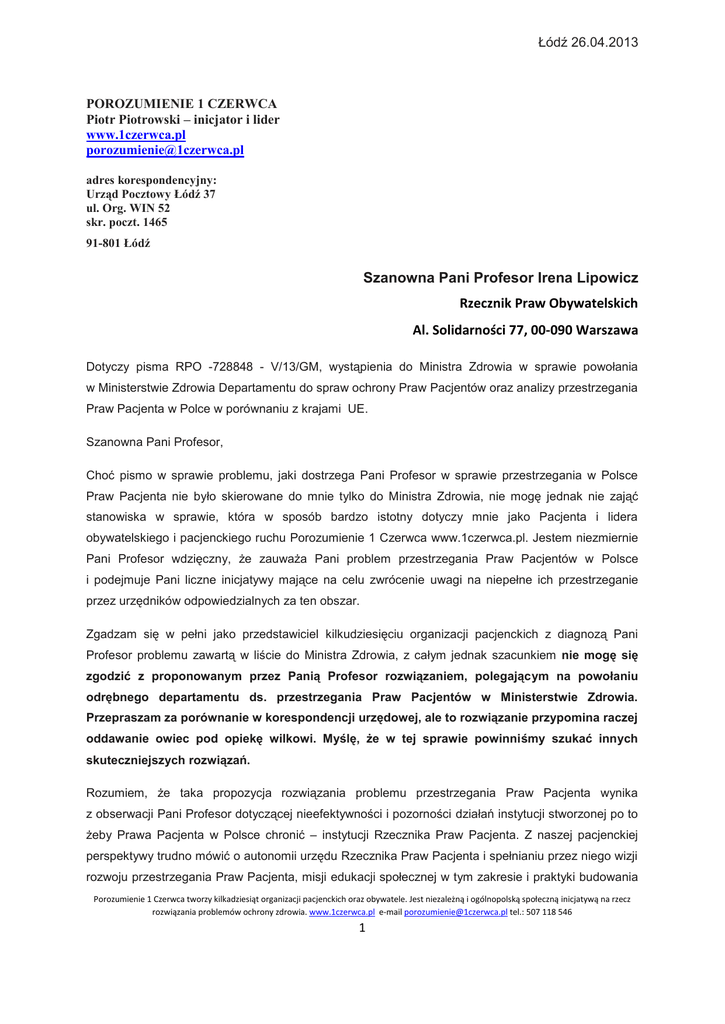 Łódź 26.04.2013 POROZUMIENIE 1 CZERWCA Piotr Piotrowski – inicjator i lider www.1czerwca.pl [email protected] adres korespondencyjny: Urząd Pocztowy Łódź 37 ul. Org. WIN 52 skr. poczt. 1465 91-801 Łódź Szanowna Pani Profesor Irena Lipowicz Rzecznik Praw Obywatelskich Al. Solidarności 77, 00-090 Warszawa Dotyczy pisma RPO -728848 - V/13/GM, wystąpienia do Ministra Zdrowia w sprawie powołania w Ministerstwie Zdrowia Departamentu do spraw ochrony Praw Pacjentów oraz analizy przestrzegania Praw Pacjenta w Polce w porównaniu z krajami UE. Szanowna Pani Profesor, Choć pismo w sprawie problemu, jaki dostrzega Pani Profesor w sprawie przestrzegania w Polsce Praw Pacjenta nie było skierowane do mnie tylko do Ministra Zdrowia, nie mogę jednak nie zająć stanowiska w sprawie, która w sposób bardzo istotny dotyczy mnie jako Pacjenta i lidera obywatelskiego i pacjenckiego ruchu Porozumienie 1 Czerwca www.1czerwca.pl. Jestem niezmiernie Pani Profesor wdzięczny, że zauważa Pani problem przestrzegania Praw Pacjentów w Polsce i podejmuje Pani liczne inicjatywy mające na celu zwrócenie uwagi na niepełne ich przestrzeganie przez urzędników odpowiedzialnych za ten obszar. Zgadzam się w pełni jako przedstawiciel kilkudziesięciu organizacji pacjenckich z diagnozą Pani Profesor problemu zawartą w liście do Ministra Zdrowia, z całym jednak szacunkiem nie mogę się zgodzić z proponowanym przez Panią Profesor rozwiązaniem, polegającym na powołaniu odrębnego departamentu ds. przestrzegania Praw Pacjentów w Ministerstwie Zdrowia. Przepraszam za porównanie w korespondencji urzędowej, ale to rozwiązanie przypomina raczej oddawanie owiec pod opiekę wilkowi. Myślę, że w tej sprawie powinniśmy szukać innych skuteczniejszych rozwiązań. Rozumiem, że taka propozycja rozwiązania problemu przestrzegania Praw Pacjenta wynika z obserwacji Pani Profesor dotyczącej nieefektywności i pozorności działań instytucji stworzonej po to żeby Prawa Pacjenta w Polsce chronić – instytucji Rzecznika Praw Pacjenta. Z naszej pacjenckiej perspektywy trudno mówić o autonomii urzędu Rzecznika Praw Pacjenta i spełnianiu przez niego wizji rozwoju przestrzegania Praw Pacjenta, misji edukacji społecznej w tym zakresie i praktyki budowania Porozumienie 1 Czerwca tworzy kilkadziesiąt organizacji pacjenckich oraz obywatele. Jest niezależną i ogólnopolską społeczną inicjatywą na rzecz rozwiązania problemów ochrony zdrowia. www.1czerwca.pl e-mail [email protected] tel.: 507 118 546 1 relacji ze środowiskiem pacjenckim. Widzimy raczej urząd skupiający się na własnym trwaniu i realizujący niezbędne minimum monitorowania zjawisk patologii w ochronie zdrowia, nie budujący relacji i nie wywierający wpływu rozwijającego i jednoczącego organizacje pacjencie. Urząd Ignorujący problemy systemowe. Trudno mówić, że urząd RPP reprezentuje organizacje pacjenckie wobec administracji rządowej. My pacjenci mamy często wrażenie, że jest odwrotnie – chroni i reprezentuje urzędników wobec pacjentów i obywateli. Widzimy brak zainteresowania i wiedzy na temat problemów Pacjentów i organizacji zrzeszających chorych, brak wsparcia w dbaniu o interesy grup pacjenckich, brak wsparcia w rozwijaniu i promowaniu dialogu społecznego i partycypacji pacjentów w procesie podejmowania decyzji w ochronie zdrowia. Urząd wprawdzie jest i trwa, ale jest pozbawiony szerszej wizji i misji. Umocowanie RPP nie zapewnia mu autonomii działań. Odnosimy wrażenie, że częściej jest to rzecznik Praw Ministra niż Praw Pacjenta. W ocenie Pacjentów urząd ten nie wnosi wiele więcej w rozwój przestrzegania Praw Pacjenta niż wnosili kiedyś rzecznicy Praw Pacjenta przy oddziałach płatnika. Należy poważnie rozważyć zasadność wydawania publicznych pieniędzy na instytucję RPP w takim kształcie. Nie mamy wątpliwości, że pacjentom brak wsparcia instytucjonalnego. Pacjenci borykają się z chorobą i z walką z administracją publiczną jednocześnie. Z uwagi na brak dialogu pomiędzy organizacjami pacjenckimi, pacjentami i administracją publiczną rozwija się praktyka rozstrzygania na płaszczyźnie sądowej sporów między stronami walczącymi o swoje prawa. W walkę o prawo Pacjentów do leczenia zaangażowane są sądy. Pani Dorota Zielińska walczy o prawo do leczenia zgodnego ze standardami, liczni pacjenci onkologiczni podejmujący walkę o prawo do leczenia w sądzie nie dożywają wyroków sądów we własnej sprawie, podobnie jak nie mogą doczekać się leczenia w systemie długich kolejek. Wieloletnie ignorowanie opinii i postulatów grup pacjenckich walczących o poprawę dostępu do zgodnego ze standardami leczenia wirusowego zapalenia wątroby typu B zakończyło się złożeniem donosu do prokuratury na Ministra Zdrowia. Rozwija się praktyka nieodpowiadania na listy Pacjentów i organizacji pacjenckich kierowane do urzędników. Praktycznie poza ułomnym forum „Dialogu dla Zdrowia” nie ma możliwości spotkania Pacjentów z urzędnikami. Minister Zdrowia z pacjentami spotyka się na forum publicznym tylko raz do roku – jest dostępny podczas publicznej debaty prowadzonej przez Instytut Praw Pacjenta z okazji Dnia Chorego. Poza tym dniem jest dla Pacjentów praktycznie nieosiągalny. Postawa ministra przenosi się na urzędników i rozwija się kultura ograniczania dostępu do urzędu podobnie jak kultura ograniczania dostępu do leczenia w systemie ochrony zdrowia. W Ministerstwie istnieje Departament Dialogu Społecznego, pracują tam nawet mili i kompetentni ludzie, nastawieni na współpracę i pomocni, jednak ich wpływ na kreowanie dialogu z pacjentami jest najprawdopodobniej niewielki. Podobnie jak system ochrony zdrowia który broni się przed pacjentami, zachowują się również urzędy. Porozumienie 1 Czerwca tworzy kilkadziesiąt organizacji pacjenckich oraz obywatele. Jest niezależną i ogólnopolską społeczną inicjatywą na rzecz r