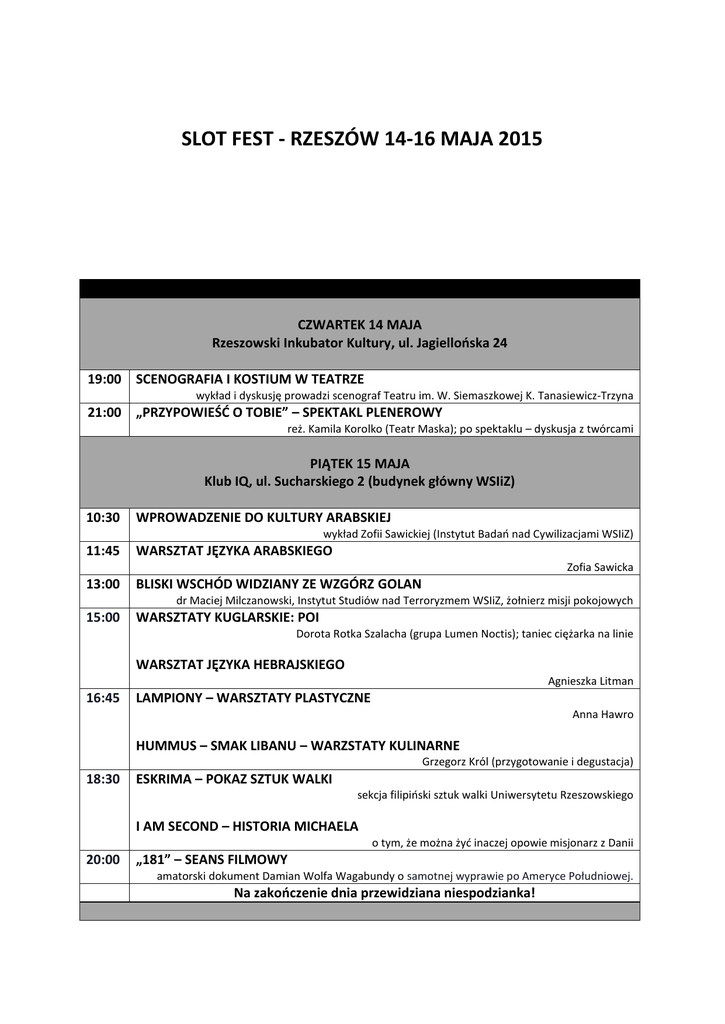 SLOT FEST - RZESZÓW 14-16 MAJA 2015 CZWARTEK 14 MAJA Rzeszowski Inkubator Kultury, ul. Jagiellońska 24 19:00 SCENOGRAFIA I KOSTIUM W TEATRZE 21:00 „PRZYPOWIEŚĆ O TOBIE” – SPEKTAKL PLENEROWY wykład i dyskusję prowadzi scenograf Teatru im. W. Siemaszkowej K. Tanasiewicz-Trzyna reż. Kamila Korolko (Teatr Maska); po spektaklu – dyskusja z twórcami PIĄTEK 15 MAJA Klub IQ, ul. Sucharskiego 2 (budynek główny WSIiZ) 10:30 WPROWADZENIE DO KULTURY ARABSKIEJ wykład Zofii Sawickiej (Instytut Badań nad Cywilizacjami WSIiZ) 11:45 WARSZTAT JĘZYKA ARABSKIEGO Zofia Sawicka 13:00 BLISKI WSCHÓD WIDZIANY ZE WZGÓRZ GOLAN 15:00 WARSZTATY KUGLARSKIE: POI dr Maciej Milczanowski, Instytut Studiów nad Terroryzmem WSIiZ, żołnierz misji pokojowych Dorota Rotka Szalacha (grupa Lumen Noctis); taniec ciężarka na linie WARSZTAT JĘZYKA HEBRAJSKIEGO Agnieszka Litman 16:45 LAMPIONY – WARSZTATY PLASTYCZNE Anna Hawro HUMMUS – SMAK LIBANU – WARZSTATY KULINARNE Grzegorz Król (przygotowanie i degustacja) 18:30 ESKRIMA – POKAZ SZTUK WALKI sekcja filipiński sztuk walki Uniwersytetu Rzeszowskiego I AM SECOND – HISTORIA MICHAELA o tym, że można żyć inaczej opowie misjonarz z Danii 20:00 „181” – SEANS FILMOWY amatorski dokument Damian Wolfa Wagabundy o samotnej wyprawie po Ameryce Południowej. Na zakończenie dnia przewidziana niespodzianka! SOBOTA 16 MAJA Klub IQ, ul. Sucharskiego 2 (budynek główny WSIiZ) 13:00 „TOŻSAMOŚĆ ŻYDOWSKA, A POLITYKA IMIGRACYJNA IZRAELA” spotkanie z Anną Dudzińską (WSIiZ), autorką książki SLAJDOWISKO Z FILIPIN I POKAZ AZJATYCKIEGO KROJENIA OWOCÓW podróżnicy Marta i Andrzej Patyra 14:00 WARSZTATY TAŃCA ŻYDOWSKIEGO Dorota Herok MROŻONA HERBATA – WARSZTATY KULINARNE Sara Jagiełło (jak zrobić zdrową i pyszna herbatę mrożoną, Yerba Mate w tykwie i z bombillą) 15:00 radioeter.fm – WARSZTATY RADIOWE Katarzyna Mieszawska, Maciej Kisała, studenci WSIiZ, dziennikarze radioeter.fm 15:45 IZRAEL - ZIEMIA OBIECANA – SLAJDOWISKO Dorota i Kuba Herok KORONKOWE BRANSOLETKI – WARSZTATY PLASTYCZNE Anna Hawro 17:45 OPOWIEŚCI Z LIBANU – SLAJDOWISKO Filip Pasek, misjonarz o swoich podróżach i pracy wśród Libańczyków WARKOCZYKI – WARSZTAY PLASTYCZNE Izabela Porazińska – Cygan 19:30 I AM SECOND – HISTORIA MICHAŁA o tym, że można żyć inaczej 20:00 ULA PŁONKA – TANIEC (MONO DESIRE) solowa choreografia o kompozycji Manu Delago na hang drum 20:30 MELANIA & MICHAŁ – KONCERT młode małżeństwo muzyków w klimatycznych piosenkach o miłości