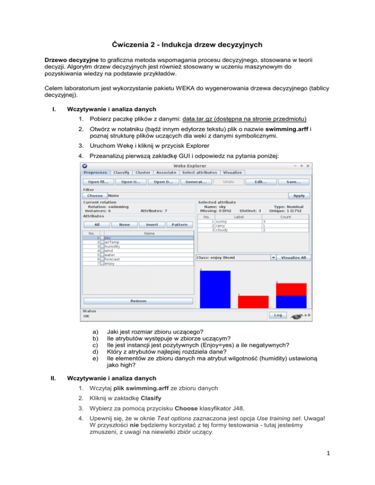 Ćwiczenia 2 - Indukcja drzew decyzyjnych Drzewo decyzyjne to graficzna metoda wspomagania procesu decyzyjnego, stosowana w teorii decyzji. Algorytm drzew decyzyjnych jest również stosowany w uczeniu maszynowym do pozyskiwania wiedzy na podstawie przykładów. Celem laboratorium jest wykorzystanie pakietu WEKA do wygenerowania drzewa decyzyjnego (tablicy decyzyjnej). I. Wczytywanie i analiza danych 1. Pobierz paczkę plików z danymi: data.tar.gz (dostępna na stronie przedmiotu) 2. Otwórz w notatniku (bądź innym edytorze tekstu) plik o nazwie swimming.arff i poznaj strukturę plików uczących dla weki z danymi symbolicznymi. 3. Uruchom Wekę i kliknij w przycisk Explorer 4. Przeanalizuj pierwszą zakładkę GUI i odpowiedz na pytania poniżej: a) b) c) d) e) II. Jaki jest rozmiar zbioru uczącego? Ile atrybutów występuje w zbiorze uczącym? Ile jest instancji jest pozytywnych (Enjoy=yes) a ile negatywnych? Który z atrybutów najlepiej rozdziela dane? Ile elementów ze zbioru danych ma atrybut wilgotność (humidity) ustawioną jako high? Wczytywanie i analiza danych 1. Wczytaj plik swimming.arff ze zbioru danych 2. Kliknij w zakładkę Clasify 3. Wybierz za pomocą przycisku Choose klasyfikator J48. 4. Upewnij się, że w oknie Test options zaznaczona jest opcja Use training set. Uwaga! W przyszłości nie będziemy korzystać z tej formy testowania - tutaj jesteśmy zmuszeni, z uwagi na niewielki zbiór uczący. 1 5. Kliknij w przycisk Start. Przyjrzyj się rezultatowi. Co oznaczają wyniki? 6. Wybierz za pomocą przycisku Choose klasyfikator J48 i kliknij Start, następnie zwizualizuj drzewo tak jak to pokazano poniżej: 2 7. Czy drzewo wygląda tak jak poniżej? III. Poprawność klasyfikacji 1. Załaduj plik credit-g.arff do Weki. Zawiera on dane uczące dla systemu, który na podstawie atrybutów zawartych w pliku powinien określać czy dany zestaw wartości atrybutów wskazuje na wiarygodnego klienta banku, czy też nie - czy można przyznać mu kredyt, czy jest to ryzykowne. 2. Przejdź do zakładki Classify i wybierz algorytm J48. 3. W obszarze Test options wybierz opcje Percentage split z wartością 66% Oznacza to, ze 66% danych posłuży do uczenia, a 34% do walidacji. Jakie to ma znaczenie? 4. Uruchom algorytm. Ile procent przypadków zostało poprawnie zaklasyfikowanych? Czy to dobry wynik? 5. Zmień klasyfikator na ZeroR z gałęzi rules. Jakie są wyniki? 6. Wypróbuj inne klasyfikatory. Jakie dają wyniki? 7. Przejdź do zakładki Preprocess i zobacz jak wygląda rozkład atrybutu określającego czy danych zestaw jest dobry czy zły. Jaka byłaby skuteczność algorytmu który niezależnie od wartości atrybutów „strzelałby” że użytkownik jest wiarygodny? 8. Dlaczego przed przystąpieniem do klasyfikacji, warto wcześniej przyjrzeć się danym? Zadanie do samodzielnego wykonania (Sprawozdanie max. 4 strony A4) 1. Pobrać zbiory weather i iris (oba dołączone w pakiecie WEKA). 2. Przygotować dane do wczytania w WEKA. 3. Uruchom WEKA i skorzystaj z algorytmu generującego: a. drzewo decyzyjne – RandomTree, b. drzewo decyzyjne - j48, c. drzewo decyzyjne - REPTree, d. oraz tablicę decyzyjną. 3 4. Zmieniając parametry klasyfikatorów utwórz zadowalające drzewo decyzyjne analizująć macierz pomyłek (ang. Confusion Matrix) oraz obliczając i porównująć takie parametry jak: a. Dokładność (ang. Accuracy) b. Wrażliwość / czułość (ang. Sensitivity) c. Specyficzność (ang. Specificity) – Jak w WEKA nazywa się ten parametr? d. Odsetek wyników fałszywie dodatnich (ang. False-positive rate) 5. Analizując powyższe parametry oraz krzywą ROC (ang. Receiver Operating Characteristic) porównaj utworzone algorytmy i posortuj je w kolejności od najlepszego do najgorszego. 6. Wykonaj sprawozdanie z zadania zawierając: a. Cześć z opisem zasady działanie algorytm (skorzystaj z dokumentacji WEKA oraz materiałów ndostępnych online) b. Opisz zbiorów danych (ile/jakie są atrybuty, czego dotyczy zbiór, różnorodność danych oraz inne dane o ile autor uzna je za istotne). c. Wyniki z klasyfikacji prezentując drzewa decyzyjne/tablice decyzyjne dla zbiorów danych d. Wnioski i podsumowanie eksperymentu Sprawozdanie należy przesłać w pliku pdf imie_nazwisko.pdf. Mail z wynikami należy wysłać na adres mailowy prowadzącego i zatytułować DM_CW2_Drzewa Decyzyjne. 4