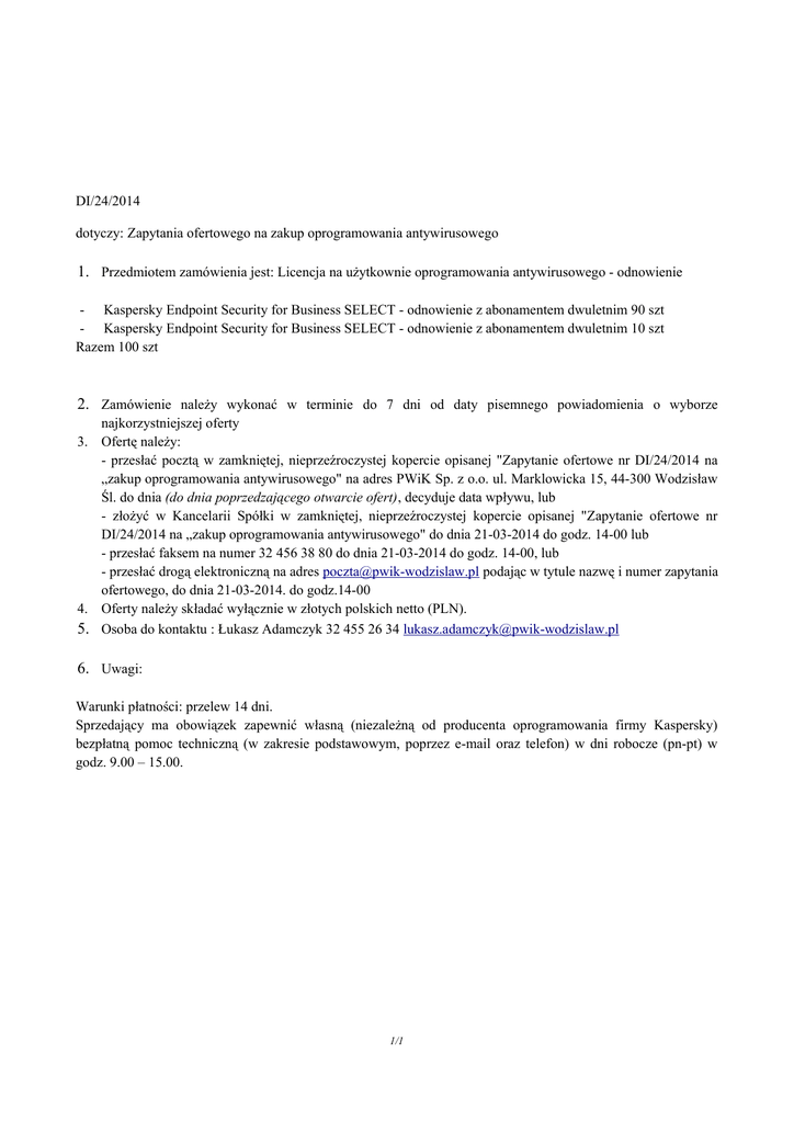 DI/24/2014 dotyczy: Zapytania ofertowego na zakup oprogramowania antywirusowego 1. Przedmiotem zamówienia jest: Licencja na użytkownie oprogramowania antywirusowego - odnowienie - Kaspersky Endpoint Security for Business SELECT - odnowienie z abonamentem dwuletnim 90 szt - Kaspersky Endpoint Security for Business SELECT - odnowienie z abonamentem dwuletnim 10 szt Razem 100 szt 2. Zamówienie należy wykonać w terminie do 7 dni od daty pisemnego powiadomienia o wyborze najkorzystniejszej oferty 3. Ofertę należy: - przesłać pocztą w zamkniętej, nieprzeźroczystej kopercie opisanej "Zapytanie ofertowe nr DI/24/2014 na „zakup oprogramowania antywirusowego" na adres PWiK Sp. z o.o. ul. Marklowicka 15, 44-300 Wodzisław Śl. do dnia (do dnia poprzedzającego otwarcie ofert), decyduje data wpływu, lub - złożyć w Kancelarii Spółki w zamkniętej, nieprzeźroczystej kopercie opisanej "Zapytanie ofertowe nr DI/24/2014 na „zakup oprogramowania antywirusowego" do dnia 21-03-2014 do godz. 14-00 lub - przesłać faksem na numer 32 456 38 80 do dnia 21-03-2014 do godz. 14-00, lub - przesłać drogą elektroniczną na adres [email protected] podając w tytule nazwę i numer zapytania ofertowego, do dnia 21-03-2014. do godz.14-00 4. Oferty należy składać wyłącznie w złotych polskich netto (PLN). 5. Osoba do kontaktu : Łukasz Adamczyk 32 455 26 34 [email protected] 6. Uwagi: Warunki płatności: przelew 14 dni. Sprzedający ma obowiązek zapewnić własną (niezależną od producenta oprogramowania firmy Kaspersky) bezpłatną pomoc techniczną (w zakresie podstawowym, poprzez e-mail oraz telefon) w dni robocze (pn-pt) w godz. 9.00 – 15.00. 1/1
