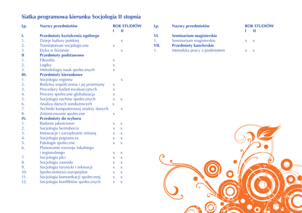 Siatka programowa kierunku Socjologia II stopnia Lp. Nazwy przedmiotów ROK STUDIÓW I II Przedmioty kształcenia ogólnego I. 1. Dzieje kultury polskiej x Translatorium socjologiczne x 2. 3. Etyka w biznesie x II Przedmioty podstawowe 1. Filozofia x 2. Logika x 3. Metodologia nauk społecznych x III. Przedmioty kierunkowe 1. Socjologia regionu x Rodzina współczesna i jej przemiany x 2. 3. Procedury badań ewaluacyjnych x 4. Procesy społeczne-globalizacja x 5. Socjologia ruchów społecznych x x 6. Analiza danych sondażowych x 7. Techniki komputerowej analizy danych x 8. Zróżnicowanie społeczne x IV. Przedmioty do wyboru 1. Badania jakościowe x x 2. Socjologia bezrobocia x x 3. Innowacje i zarządzanie zmianą x x 4. Socjologia pogranicza x x 5. Patologie społeczne x x 6. Planowanie rozwoju lokalnego i regionalnego x x 7. Socjologia płci x x 8. Socjologia zawodu x x 9. Socjologia turystyki i rekreacji x x 10. Społeczeństwo europejskie x x 11. Socjologia komunikacji społecznej x x 12. Socjologia konfliktów społecznych x x Lp. Nazwy przedmiotów Seminarium magisterskie VI. 1. Seminarium magisterskie Przedmioty kanclerskie VII. 1. Metodyka pracy z podmiotem ROK STUDIÓW I II x x x x