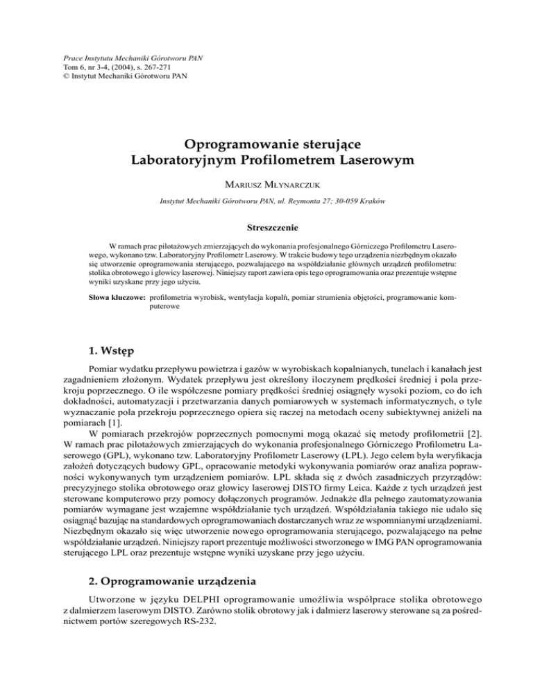 267 Prace Instytutu Mechaniki Górotworu PAN Tom 6, nr 3-4, (2004), s. 267-271 © Instytut Mechaniki Górotworu PAN Oprogramowanie sterujące Laboratoryjnym Profilometrem Laserowym MARIUSZ MŁYNARCZUK Instytut Mechaniki Górotworu PAN, ul. Reymonta 27; 30-059 Kraków Streszczenie W ramach prac pilotażowych zmierzających do wykonania profesjonalnego Górniczego Profilometru Laserowego, wykonano tzw. Laboratoryjny Profilometr Laserowy. W trakcie budowy tego urządzenia niezbędnym okazało się utworzenie oprogramowania sterującego, pozwalającego na współdziałanie głównych urządzeń profilometru: stolika obrotowego i głowicy laserowej. Niniejszy raport zawiera opis tego oprogramowania oraz prezentuje wstępne wyniki uzyskane przy jego użyciu. Słowa kluczowe: profilometria wyrobisk, wentylacja kopalń, pomiar strumienia objętości, programowanie komputerowe 1. Wstęp Pomiar wydatku przepływu powietrza i gazów w wyrobiskach kopalnianych, tunelach i kanałach jest zagadnieniem złożonym. Wydatek przepływu jest określony iloczynem prędkości średniej i pola przekroju poprzecznego. O ile współczesne pomiary prędkości średniej osiągnęły wysoki poziom, co do ich dokładności, automatyzacji i przetwarzania danych pomiarowych w systemach informatycznych, o tyle wyznaczanie pola przekroju poprzecznego opiera się raczej na metodach oceny subiektywnej aniżeli na pomiarach [1]. W pomiarach przekrojów poprzecznych pomocnymi mogą okazać się metody profilometrii [2]. W ramach prac pilotażowych zmierzających do wykonania profesjonalnego Górniczego Profilometru Laserowego (GPL), wykonano tzw. Laboratoryjny Profilometr Laserowy (LPL). Jego celem była weryfikacja założeń dotyczących budowy GPL, opracowanie metodyki wykonywania pomiarów oraz analiza poprawności wykonywanych tym urządzeniem pomiarów. LPL składa się z dwóch zasadniczych przyrządów: precyzyjnego stolika obrotowego oraz głowicy laserowej DISTO firmy Leica. Każde z tych urządzeń jest sterowane komputerowo przy pomocy dołączonych programów. Jednakże dla pełnego zautomatyzowania pomiarów wymagane jest wzajemne współdziałanie tych urządzeń. Współdziałania takiego nie udało się osiągnąć bazując na standardowych oprogramowaniach dostarczanych wraz ze wspomnianymi urządzeniami. Niezbędnym okazało się więc utworzenie nowego oprogramowania sterującego, pozwalającego na pełne współdziałanie urządzeń. Niniejszy raport prezentuje możliwości stworzonego w IMG PAN oprogramowania sterującego LPL oraz prezentuje wstępne wyniki uzyskane przy jego użyciu. 2. Oprogramowanie urządzenia Utworzone w języku DELPHI oprogramowanie umożliwia współprace stolika obrotowego z dalmierzem laserowym DISTO. Zarówno stolik obrotowy jak i dalmierz laserowy sterowane są za pośrednictwem portów szeregowych RS-232. 268 Mariusz Młynarczuk Zasadnicza część programu przeznaczona jest do obsługi stolika obrotowego. W programie tym istnieje możliwość wyboru (patrz rys. 1): − kierunku obrotu stolika (lewo, prawo); − wielkości kąta obrotu stolika (rozumianego jako ilość minimalnych kroków stolika obrotowego, przy czym 1 krok silnika odpowiada 0,02°); − ilości wykonywanych pomiarów. Dodatkowo program umożliwia ustawienie parametrów opóźnienia kroków stolika i opóźnienia pomiaru po zatrzymaniu stolika. Opcje te mają na celu przyspieszenie lub opóźnienie pomiarów z jednoczesnym wyeliminowaniem drgań stoiska pomiarowego spowodowanego zbyt gwałtownymi ruchami stolika obrotowego. Rys. 1. Interfejs programu obsługi LPL Program posiada również opcje jednorazowego pomiaru odległości (bez zapisu wyniku do pamięci komputera) oraz sprawdzenia stanu baterii w głowicy DISTO [3]. W programie zaimplementowano rozbudowaną kontrolę transmisji poprzez porty RS-232, zarówno stolika obrotowego jak i lasera. Zasadnicze działanie programu (patrz rys. 2) polega na tym, że każdorazowo, po wykonaniu przez stolik zadanego kroku pomiarowego, następuje jego chwilowe zatrzymanie. W tym czasie program komunikuje się z głowicą pomiarową DISTO i następuje odczyt jej wskazań. Następnie stolik rozpoczyna kolejny krok pomiarowy. Informacje o położeniu stolika i odczytanych odległościach podawane są na bieżąco w oknie kontrolnym. Po zakończeniu pomiarów istnieje możliwość zapisu wyników pomiaru na dysk. Wynik ten ma formę pliku tekstowego składającego się z 3 kolumn: 1 – numeru pomiaru, 2 – położenia stolika obrotowego, 3 – wyniku pomiaru odległości [mm]. W przypadku, gdy dalmierz nie potrafi zmierzyć odległości, w kolumnę 3 wpisywana jest wartość 0 mm. Program posiada możliwość przerwania i (następnie) rozpoczęcia pomiarów w dowolnym momencie, bez utraty danych pomiarowych. Posiada również możliwość wykonywania pojedynczych pomiarów (niezależnie od współpracy ze stolikiem). Opisywane oprogramowanie może działać na każdym komputerze, który wyposażony jest w minimum dwa porty RS-232, oraz system operacyjny Windows. Istnieje również możliwość uruchomienia tego programu na komputerze wyposażonym w porty USB (np. nowsze typy laptopów) oraz w „adaptery” USB – RS232. W celu umożliwienia współpracy programu z ultradźwiękową głowicą pomiarową BOSH, utworzono jego drugą, zmodyfikowaną wersję. Konieczność jego wykonania spowodowana była brakiem możliwości komunikowania się komputera z głowicą ultradźwiękową. Wspomniana modyfikacja polegała na tym, że w momentach, gdy pierwotna wersja programu komunikuje się z głowica laserową, następuje wstrzymanie pomiarów i program oczekuje na ręczne wprowadzenie, odczytanej z głowicy ultradźwiękowej, wartości. Poza tą jedna zmianą, program działa identycznie jak wcześniej opisywany (te same parametry ustawienia stolika i ten sam format pliku danych pomiarowych). Oprogramowanie sterujące Laboratoryjnym Profilometrem Laserowym 269 Ustawienie