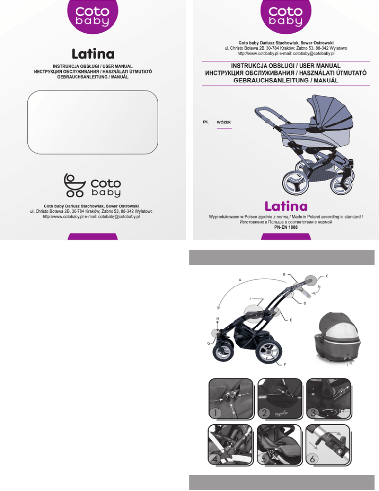 Latina Latina B C A I D H E G II F I PL A - kierunek składania B - regulacja wysokości prowadnicy C - prowadnica D - cięgno składania wózka E - zatrzask boczny F - przycisk demontażu kół tylnych G - dźwignia blokady do jazdy na wprost H - przycisk demontażu kół przednich I - listwa boczna z systemem ClickN’Go LATINA I, II - Regulacja wysokości oparcia gondoli 1 2 3 4 5 6 - Regulacja oparcia spacerówki Przycisk składania daszka gondoli ClickN’Go/demontaż fotelika Demontaż barierki ochronnej Przycisk regulacji podnóżka Mechanizm składania wózka PRZYGOTOWANIE WÓZKA DO EKSPLOATACJI Wózek ułożyć kołami na podłożu, następnie trzymając prowadnicę, pociągnąć ją do góry dociskając jednocześnie nogą hamulec kół tylnych do momentu zatrzaśnięcia się zamknięć bocznych, a następnie odblokować hamulec. Przed przystąpieniem do obsługi wózka należy upewnić się, czy dziecko znajduje się w bezpiecznej odległości. Przed przystąpieniem do dalszego montażu należy nacisnąć na prowadnicę w celu sprawdzenia prawidłowego zatrzaśnięcia zamknięć bocznych. REGULACJA WYSOKOŚCI PROWADNICY Aby ustawić prowadnicę na żądanej wysokości należy jednocześnie nacisnąć przyciski znajdujące się po obu stronach prowadnicy. OBSŁUGA PRZEDNICH KÓŁ SKRĘTNYCH W celu zablokowania kół przednich do jazdy na wprost należy przestawić położenie pokrętła obrotnicy. 2 LATINA PL OBSŁUGA GONDOLI Gondola przeznaczona jest do przewożenia dziecka o wadze nie przekraczającej 8 kg. - Aby rozłożyć gondolę należy napiąć dwa rozpieracze znajdujące się pod wyściółką gondoli. - Aby zamocować gondolę w stelażu należy wsunąć w gniazda listw bocznych stelażu, a następnie energicznym ruchem zatrzasnąć je. - Regulacja kąta pochylenia budki dokonuje się poprzez wciśnięcie przycisków (rys. 2) i jednoczesne ustawienie do żądanej pozycji. - Pokrowiec gondoli należy połączyć z budką zapinając odpowiednie zatrzaski. - W celu demontażu należy wcisnąć przycisk ClickN’Go i pociągnąć do góry za uchwyt gondoli. - Regulację oparcia gondoli uzyskujemy poprzez obracanie pokrętła z tyłu gondoli po uprzednim jego wysunięciu. OBSŁUGA SIEDZISKA Montaż oraz demontaż siedziska przebiega w sposób analogiczny do montażu gondoli. Przed zamontowaniem należy ustawić podnóżek w pozycji poziomej. Siedzisko przeznaczone jest do przewożenia dziecka w wieku powyżej 12 miesięcy i o wadze do 15 kg. REGULACJA POŁOŻENIA PODNÓŻKA ORAZ OPARCIA W celu zmiany kąta pochylenia podnóżka należy jednocześnie nacisnąć przyciski znajdujące się po obu stronach siedziska (rys. 5) i ustawić go w żądanej pozycji. Zmianę położenia oparcia siedziska umożliwia pasek spięty klamerką regulacyjną (rys. 1). OBSŁUGA FOTELIKA PODRÓŻNEGO Fotelik przeznaczony jest dla dziecka o wadze nie przekraczającej 10kg. Aby zamontować fotelik w stelażu wózka należy wsunąć adaptery w gniazda listw bocznych, następnie wsunąć w nie fotelik. Należy upewnić się, czy adaptery oraz fotelik zostały prawidłowo zatrzaśnięte! 3 PL PL SKŁADANIE WÓZKA Gondola, siedzisko lub fotelik muszą zostać wypięte przed złożeniem wózka! Aby przygotować wózek do złożenia należy odblokować przednie koła skrętne oraz zabezpieczenie znajdujące się po prawej stronie prowadnicy wózka (rys. 6), następnie przesunąć do góry suwaki i jednocześnie kierując prowadnicę do przodu wózka złożyć stelaż. W celu zapewnienia Państwu pełnej satysfakcji z korzystania z naszych produktów, firma Coto baby zastrzega sobie prawo do wprowadzania zmian w projektach wózków bez obowiązku informowania o tym kupujących. RADY I OSTRZEŻENIA - Przechowywać opakowanie foliowe wózka poza zasięgiem dziecka, aby zapobiec przypadkowemu uduszeniu. - Przed użyciem wózka należy upewnić się, czy mechanizmy blokujące konstrukcje wózka zostały zablokowane oraz sprawdzić prawidłowość zamocowania gondoli, siedziska lub fotelika z adapterami. - W wózku może znajdować się tylko jedno dziecko. - Zawsze używać szelek zabezpieczających dziecko przed wypadnięciem. - Nigdy nie zostawiaj dziecka bez opieki w wózku. - Przenoszenie wózka z dzieckiem będącym w środku grozi jego wypadnięciem. - Zawsze, gdy nie używasz wózka, pozostawiaj go zahamowanym. - Dopuszczalne obciążenie bagażnika max. 3kg. - Każde obciążenie wózka zawieszone na prowadnicy narusza jego stateczność. - Nigdy nie używaj wózka do jazdy po schodach. - Optymalne ciśnienie w oponach wynosi 0,8 bar. UWAGA - Odchylenie toru jazdy wózka z przednimi kołami zablokowanymi do jazdy na wprost, nie jest wadą produktu i jest określone zgodnie z normą PN-EN 1888 i może wynosić 0,5 m na drodze 5 m. 4 5