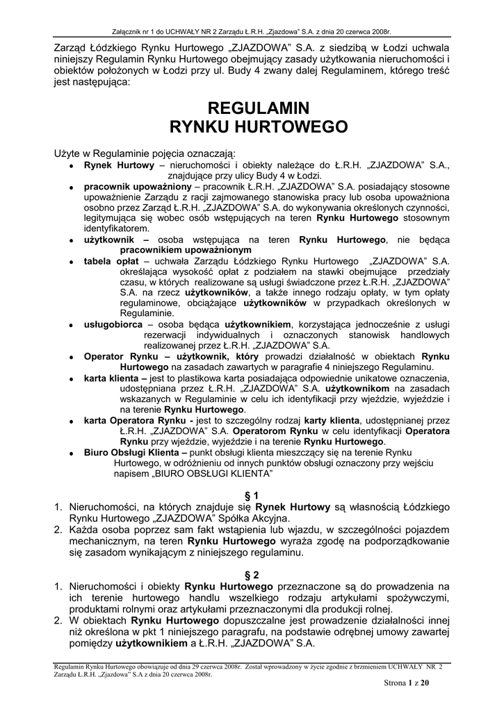 Załącznik nr 1 do UCHWAŁY NR 2 Zarządu Ł.R.H. „Zjazdowa” S.A. z dnia 20 czerwca 2008r. Zarząd Łódzkiego Rynku Hurtowego „ZJAZDOWA” S.A. z siedzibą w Łodzi uchwala niniejszy Regulamin Rynku Hurtowego obejmujący zasady użytkowania nieruchomości i obiektów położonych w Łodzi przy ul. Budy 4 zwany dalej Regulaminem, którego treść jest następująca: REGULAMIN RYNKU HURTOWEGO Użyte w Regulaminie pojęcia oznaczają: Rynek Hurtowy – nieruchomości i obiekty należące do Ł.R.H. „ZJAZDOWA” S.A., znajdujące przy ulicy Budy 4 w Łodzi. pracownik upoważniony – pracownik Ł.R.H. „ZJAZDOWA” S.A. posiadający stosowne upoważnienie Zarządu z racji zajmowanego stanowiska pracy lub osoba upoważniona osobno przez Zarząd Ł.R.H. „ZJAZDOWA” S.A. do wykonywania określonych czynności, legitymująca się wobec osób wstępujących na teren Rynku Hurtowego stosownym identyfikatorem. użytkownik – osoba wstępująca na teren Rynku Hurtowego, nie będąca pracownikiem upoważnionym tabela opłat – uchwała Zarządu Łódzkiego Rynku Hurtowego „ZJAZDOWA” S.A. określająca wysokość opłat z podziałem na stawki obejmujące przedziały czasu, w których realizowane są usługi świadczone przez Ł.R.H. „ZJAZDOWA” S.A. na rzecz użytkowników, a także innego rodzaju opłaty, w tym opłaty regulaminowe, obciążające użytkowników w przypadkach określonych w Regulaminie. usługobiorca – osoba będąca użytkownikiem, korzystająca jednocześnie z usługi rezerwacji indywidualnych i oznaczonych stanowisk handlowych realizowanej przez Ł.R.H. „ZJAZDOWA” S.A. Operator Rynku – użytkownik, który prowadzi działalność w obiektach Rynku Hurtowego na zasadach zawartych w paragrafie 4 niniejszego Regulaminu. karta klienta – jest to plastikowa karta posiadająca odpowiednie unikatowe oznaczenia, udostępniana przez Ł.R.H. „ZJAZDOWA” S.A. użytkownikom na zasadach wskazanych w Regulaminie w celu ich identyfikacji przy wjeździe, wyjeździe i na terenie Rynku Hurtowego. karta Operatora Rynku - jest to szczególny rodzaj karty klienta, udostępnianej przez Ł.R.H. „ZJAZDOWA” S.A. Operatorom Rynku w celu identyfikacji Operatora Rynku przy wjeździe, wyjeździe i na terenie Rynku Hurtowego. Biuro Obsługi Klienta – punkt obsługi klienta mieszczący się na terenie Rynku Hurtowego, w odróżnieniu od innych punktów obsługi oznaczony przy wejściu napisem „BIURO OBSŁUGI KLIENTA” §1 1. Nieruchomości, na których znajduje się Rynek Hurtowy są własnością Łódzkiego Rynku Hurtowego „ZJAZDOWA” Spółka Akcyjna. 2. Każda osoba poprzez sam fakt wstąpienia lub wjazdu, w szczególności pojazdem mechanicznym, na teren Rynku Hurtowego wyraża zgodę na podporządkowanie się zasadom wynikającym z niniejszego regulaminu. §2 1. Nieruchomości i obiekty Rynku Hurtowego przeznaczone są do prowadzenia na ich terenie hurtowego handlu wszelkiego rodzaju artykułami spożywczymi, produktami rolnymi oraz artykułami przeznaczonymi dla produkcji rolnej. 2. W obiektach Rynku Hurtowego dopuszczalne jest prowadzenie działalności innej niż określona w pkt 1 niniejszego paragrafu, na podstawie odrębnej umowy zawartej pomiędzy użytkownikiem a Ł.R.H. „ZJAZDOWA” S.A. Regulamin Rynku Hurtowego obowiązuje od dnia 29 czerwca 2008r. Został wprowadzony w życie zgodnie z brzmieniem UCHWAŁY NR 2 Zarządu Ł.R.H. „Zjazdowa” S.A z dnia 20 czerwca 2008r. Strona 1 z 20 Załącznik nr 1 do UCHWAŁY NR 2 Zarządu Ł.R.H. „Zjazdowa” S.A. z dnia 20 czerwca 2008r. §3 1. Na terenie Rynku Hurtowego handel odbywać się może wyłącznie w wyznaczonych do tego miejscach. 2. Miejsca przeznaczone do prowadzenia handlu, o których mowa w punkcie poprzednim to: a) Hale handlowe oznaczone kolejnymi liczbami naturalnymi – handel może być prowadzony w ramach znajdujących się w nich boksach handlowych oraz na terenie znajdującym się przed tymi boksami do żółtej linii oznaczonej na podłożu ciągu komunikacyjnego hali; b) Strefa handlowa, która jest oznaczoną częścią Rynku Hurtowego, przeznaczoną do wprowadzania nieprzetworzonych płodów rolnych, w szczególności warzyw i owoców do obrotu bezpośrednio ze stanowisk handlowych lub wydzielonych obiektów, określanych, jako pawilony handlowe lub magazynowe. Strefa handlowa jest podzielona na ciągi komunikacyjne i sektory wyznaczające rodzaj płodów rolnych, które można wprowadzać do obrotu handlowego. Są to odpowiednio: Sektor „B” – owoce wyprodukowane w REGIONIE CENTRALNYM obejmującym obszar woj. łódzkiego i mazowieckiego – wg europejskiej klasyfikacji NUTS-1 Sektor „Z” – warzywa wyprodukowane w REGIONIE CENTRALNYM Sektor „K” – warzywa i inne płody rolne wyprodukowane w REGIONIE CENTRALNYM Sektor „P” – grzyby jadalne, wyprodukowane lub zebrane w REGIONIE CENTRALNYM Sektor „PP” – ziemniaki - wyprodukowane w REGIONIE CENTRALNYM Sektor „I” – warzywa, owoce i inne płody rolne wyprodukowane w pozostałych regionach Wspólnot Europejskich i spoza obszaru WE. Na obszarze strefy handlowej, w kolejnych sektorach wydzielone zostały indywidualne i oznaczone stanowiska handlowe oraz ciągi komunikacyjne. Oznaczenie stanowisk handlowych polega na wyznaczeniu linii oddzielających ciągi komunikacyjne od stanowisk handlowych ograniczających jednocześnie miejsce wprowadzania płodów rolnych do obrotu handlowego oraz przypisaniu wydzielonemu stanowisku handlowemu kolejnych liczb naturalnych. Do bezpośredniego przemieszczania towarów pomiędzy przestrzeniami ładunkowymi pojazdów została wydzielona część strefy handlowej. Użytkownicy posługujący się pojazdami zamierzający przemieszczać towary bezpośrednio pomiędzy przestrzeniami ładunkowymi wykorzystywanych pojazdów są obowiązani do parkowania i przemieszczania ładunku tylko w wyznaczonych miejscach przeładunku lub w obrębie miejsc wskazanych przez upoważnionych pr