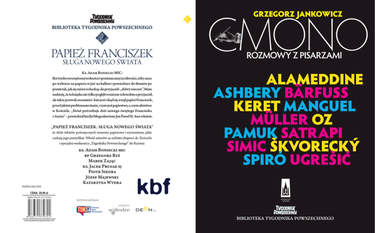 CMONO GRZEGORZ JANKOWICZ PAPIEŻ FRANCISZEK SŁUGA NOWEGO ŚWIATA Ks. Adam Boniecki MIC: Ileż trzeba wewnętrznej wolności i spontanicznej życzliwości, żeby zaraz po wyborze na papieża wyjść na balkon i powiedzieć do tłumów po prostu tak, jak się mówi wchodząc do przyjaciół: „dobry wieczór”. Mam nadzieję, że ta książka nie tylko pogłębi wrażenie odwiedzin u przyjaciół, ale także pozwoli zrozumieć: kim jest i skąd się wziął papież Franciszek, przed jakimi problemami stanie, czym jest papiestwo, a czym ubóstwo w Kościele. „Świat potrzebuje dziś nowego świętego Franciszka z Asyżu” – powiedział kiedyś błogosławiony Jan Paweł II. Ano właśnie. „PAPIEŻ FRANCISZEK. SŁUGA NOWEGO ŚWIATA” to zbiór tekstów poświęconych nowemu papieżowi i wyzwaniom, jakie czekają jego pontyfikat. Wśród autorów są wybitni eksperci ds. Kościoła i specjalni wysłannicy „Tygodnika Powszechnego” do Rzymu: INDEKS XXX XXX ks. Adam Boniecki mic bp Grzegorz Ryś Marek Zając ks. Jacek Prusak sj Piotr Sikora Józef Majewski Katarzyna Wydra PAPIEŻ FRANCISZEK. SŁUGA NOWEGO ŚWIATA BIBLIOTEKA TYGODNIKA POWSZECHNEGO ROZMOWY Z PISARZAMI ALAMEDDINE ASHBERY BÄRFUSS KERET MANGUEL MÜLLER OZ PAMUK SATRAPI SIMIC ŠKVORECKÝ SPIRÓ UGREŠIĆ PATRONI MEDIALNI BIBLIOTEKA TYGODNIKA POWSZECHNEGO Kraków to miasto książki i prawdziwa potęga wydawnicza. Działa tu ponad 100 wydawców publikujących dosłownie wszystko: od literatury sensacyjnej po wiersze noblistów, od romansu po podręczniki akademickie, od biografii po fantastykę. Książki krakowskich oficyn odnoszą sukcesy na krajowym rynku wydawniczym, otrzymują najważniejsze nagrody literackie, ale przede wszystkim stanowią znakomitą ofertę dla czytelnika, który w bogactwie tytułów i gatunków zawsze znajdzie coś dla siebie. To już druga edycja Wirtualnej Biblioteki. Tym razem proponujemy Ci książki najważniejszych gości tegorocznego Festiwalu Conrada i Targów Książki, a także najgorętsze nowości wydawnicze tej jesieni. Wśród nich z pewnością znajdziesz opowieść idealną dla siebie. A jeśli po przeczytaniu darmowego fragmentu książki nie będziesz w stanie się już od niej oderwać, z łatwością możesz nabyć e-booka klikając w link na końcu zeskanowanego fragmentu. Przy 2. odsłonie naszej akcji testujemy także możliwość pobrania audiobooka. Sprawdź, czy możesz pobrać Twoją ulubioną książkę w formacie dźwiękowym! Partnerzy Wirtualnej Biblioteki przygotowali także specjalną ofertę dla wszystkich, którzy kupią polecane w tej akcji właśnie u nich: • Publio oferuje 40% rabatu na każdy z zakupionych tą drogą tytułów • Virtualo dostępne u nich e-booki oferuje w promocyjnej cenie • Woblink każdemu, kto kupi e-booka z naszej akcji, podaruje kody rabatowe o łącznej wartości 50 zł uprawniające do zakupu kolejnych tytułów po niższej cenie. • Koobe każdemu, kto kupi u nich e-booka, oferuje kod zniżkowy na 30% na cały asortyment koobe.pl Szukaj linków do sklepów internetowych, w których dostępne są wybrane przez Ciebie e-booki, na końcu darmowych fragmentów! Wirtualna Biblioteka Wydawców to część programu Kraków Miasto Literatury. Akcję organizuje Krakowskie Biuro Festiwalowe. Partnerami akcji są: Instytut Książki oraz wydawnictwa i organizacje: a5, Agora, Bona, Czarne, Dodo Editor, Fundacja Przestrzeń Kobiet, Insignis Media, Karakter, Koobe, Krytyka Polityczna, Lokator, Muza, New Eastern Europe, Noir sur Blanc, Radio Kraków, Sine Qua Non, Skrzat, Stowarzyszenie Pisarzy Polskich, Świat Książki, W.A.B., WAM, Wielka Litera, Wydawnictwo Akademickie Dialog, Wydawnictwo Literackie, Wydawnictwo M, Wydawnictwo Otwarte, Znak, Znak Literanova, Znak Emotikon, a także Publio, Virtualo, Woblink i Koobe. Projekt dofinansowany jest ze środków Ministerstwa Kultury i Dziedzictwa Narodowego z programu Promocja Czytelnictwa. Więcej informacji na stronie qr.miastoliteratury.pl korekta Sylwia Frołow, Anna Szczepańska-Krasoń, Maciej Szklarczyk projekt graficzny i łamanie Marek K. Zalejski fotoedycja Marta Filipiuk-Michniewicz, Grażyna Makara copyright © by Grzegorz Jankowicz, 2013 copyright © for this edition by Wydawnictwo Poznańskie, 2013 copyright © for this edition by Tygodnik Powszechny, 2013 copyright © for layout by Marek K. Zalejski, 2013 isbn 978-83-7177-970-1 wydanie i, 2013 ZAMÓW TĘ KSIĄŻKĘ www.powszech.net/cmono » www.wydawnictwopoznanskie.com » www.literia.pl » W Bibliotece Tygodnika Powszechnego dotychczas ukazały się: 4 Grzegorz Jankowicz CMONO ROZMOWY Z PISARZAMI BIBLIOTEKA TYGODNIKA POWSZECHNEGO TOM III POZNAŃ – KRAKÓW 2013 5 cmono | szept opowieści 8 ALAMEDDINE ASHBERY BÄRFUSS KERET MANGUEL MÜLLER OZ PAMUK: SATRAPI SIMIC ŠKVORECKÝ SPIRÓ UGREŠIĆ SZEPT OPOWIEŚCI 9 z opowieści ę ś ć cmono |cszept I | s z e p t o p o w i e ś c i orhan pamuk: Czytanie i pisanie nigdy się nie kończą. Nasze umysły składają się z tekstów, a zatem nasz stosunek do świata polega na nieustającej lekturze. Patrzeć znaczy tyle, co czytać. GRZEGORZ JANKOWICZ: W swoich książkach – zarówno powieściach, jak i esejach – wielokrotnie odnosi się Pan do Josepha Conrada. Jedno z trzech mott do „Śniegu” pochodzi z jego powieści „W oczach Zachodu”. Zdanie to brzmi: „Jako człowiek Zachodu zaniepokoiłem się”. 10 ORHAN PAMUK: Podziwiam Conrada. Przez jakiś czas wydawałem jego książki w Turcji – cieszyły się sporym zainteresowaniem czytelników. Jest dwóch Conradów: jeden z „Jądra ciemności”, z „Nostromo”, z opowiadań. To Conrad kolonialny, który opowiada o przemocy w odległych koloniach europejskich, bada metafizyczne i materialne źródła zła. Ale jest też drugi Conrad – autor „W oczach Zachodu” czy „Tajnego agenta”, który pozostaje pod przemożnym wpływem Dostojewskiego: jest moralistą, humanistą, opisuje konsekwencje naszych wyborów ż