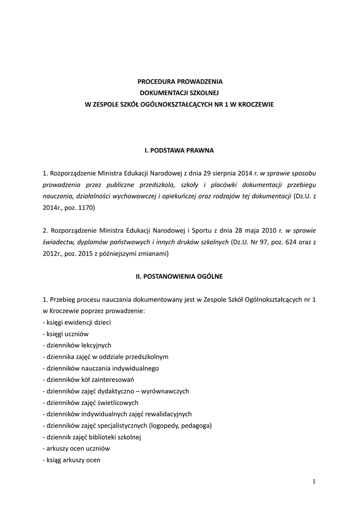 PROCEDURA PROWADZENIA DOKUMENTACJI SZKOLNEJ W ZESPOLE SZKÓŁ OGÓLNOKSZTAŁCĄCYCH NR 1 W KROCZEWIE I. PODSTAWA PRAWNA 1. Rozporządzenie Ministra Edukacji Narodowej z dnia 29 sierpnia 2014 r. w sprawie sposobu prowadzenia przez publiczne przedszkola, szkoły i placówki dokumentacji przebiegu nauczania, działalności wychowawczej i opiekuńczej oraz rodzajów tej dokumentacji (Dz.U. z 2014r., poz. 1170) 2. Rozporządzenie Ministra Edukacji Narodowej i Sportu z dnia 28 maja 2010 r. w sprawie świadectw, dyplomów państwowych i innych druków szkolnych (Dz.U. Nr 97, poz. 624 oraz z 2012r., poz. 2015 z późniejszymi zmianami) II. POSTANOWIENIA OGÓLNE 1. Przebieg procesu nauczania dokumentowany jest w Zespole Szkół Ogólnokształcących nr 1 w Kroczewie poprzez prowadzenie: - księgi ewidencji dzieci - księgi uczniów - dzienników lekcyjnych - dziennika zajęć w oddziale przedszkolnym - dzienników nauczania indywidualnego - dzienników kół zainteresowań - dzienników zajęć dydaktyczno – wyrównawczych - dzienników zajęć świetlicowych - dzienników indywidualnych zajęć rewalidacyjnych - dzienników zajęć specjalistycznych (logopedy, pedagoga) - dziennik zajęć biblioteki szkolnej - arkuszy ocen uczniów - ksiąg arkuszy ocen 1 2. Dokumentację przebiegu nauczania prowadzi się w sposób systematyczny i czytelny. 3. Sprostowania błędu i oczywistej pomyłki w dokumentacji dokonuje się przez skreślenie kolorem czerwonym nieprawidłowych wyrazów i czytelne wpisanie kolorem czerwonym nad skreślonymi wyrazami właściwych danych oraz wpisanie daty i złożenie czytelnego podpisu przez osobę dokonującą sprostowania. Sprostowania błędu w księdze ewidencji, w księdze uczniów oraz w arkuszach ocen dokonuje dyrektor szkoły, a w pozostałej dokumentacji osoba, która taki błąd lub omyłkę popełniła. 4. Obowiązkiem każdego nauczyciela korzystającego z dokumentacji przebiegu nauczania jest zabezpieczenie jej przed zagubieniem i zniszczeniem. Po każdych zajęciach dokumentacja składana jest osobiście przez nauczyciela w wyznaczonym do tego miejscu: w pokoju nauczycielskim (dotyczy dzienników lekcyjnych i dzienników zajęć) lub w sekretariacie (arkusze ocen). Zabrania się udostępniania dokumentacji uczniom lub innym nieupoważnionym osobom. Dzienniki zajęć i dzienniki lekcyjne są dokumentami niejawnymi i nie mogą być wynoszone poza teren szkoły. 5. Po zakończeniu roku szkolnego dzienniki oraz arkusze ocen składane są przez wychowawców i nauczycieli prowadzących inne zajęcia w sekretariacie szkoły, w terminie podanym przez dyrektora szkoły. Dokumentacja niepodlegająca dalszemu prowadzeniu przechowywana jest w archiwum szkoły. III POSTANOWIENIA SZCZEGÓŁOWE KSIĘGI EWIDENCJI DZIECI I KSIĘGI UCZNIÓW 1. Wpisów do Księgi ewidencji Dzieci i Księgi Uczniów dokonuje upoważniony przez dyrektora pracownik sekretariatu. Wpisów dokonuje się w oparciu o wymagania określone w Rozporządzeniu MEN z dnia 29 sierpnia 2014r. w sprawie sposobu prowadzenia przez publiczne przedszkola, szkoły i placówki dokumentacji przebiegu nauczania, działalności wychowawczej i opiekuńczej oraz rodzajów tej dokumentacji (Dz. U. z 2014r., poz. 1170) ARKUSZE OCEN 1. Arkusze ocen zakłada wychowawca klasy w terminie do 20 września każdego roku. 2 2. Na początku każdego roku szkolnego wychowawca wypełnia również arkusz zbiorczy klasy, który stanowi dokument zbiorczy do zakończenia księgi arkuszy uczniów za dany rok szkolny. Na arkuszu zbiorczym wychowawca wpisuje uczniów w kolejności wg numerów w dzienniku lekcyjnym. 3. Wpisów w arkuszu ocen ucznia dokonuje się na podstawie danych zawartych odpowiednio w księdze uczniów, dzienniku lekcyjnym, protokołach egzaminów klasyfikacyjnych i poprawkowych, protokołach sprawdzianów wiadomości i umiejętności, protokołach zebrań rady pedagogicznej, informacji o wyniku sprawdzianu lub egzaminu albo o zwolnieniu odpowiednio ze sprawdzianu lub egzaminu przez dyrektora okręgowej komisji egzaminacyjnej, a także innych dokumentach potwierdzających dane podlegające wpisowi. Nauczyciel wypełniający arkusz ocen ucznia potwierdza podpisem zgodność wpisów z dokumentem, na podstawie których ich dokonano. 4. W klasach I-III szkoły podstawowej roczne oceny klasyfikacyjne z zajęć edukacyjnych oraz roczne oceny klasyfikacyjne zachowania uczniów sporządzone komputerowo w postaci wydruku podpisanego przez wychowawcę klasy można dołączyć do arkusza ocen ucznia, co jest równoznaczne z wpisem do arkusza ocen. Zasada ta dotyczy również uczniów z upośledzeniem w stopniu umiarkowanym lub znacznym. 5. Arkusze uczniów wypełnia się pismem komputerowym, maszynowym lub ręcznym. 6. Podstawą wpisu o klasyfikowaniu, promowaniu lub ukończeniu szkoły przez ucznia jest uchwała rady pedagogicznej, której datę wpisuje się do arkusza ocen ucznia. 7. Do arkuszy ocen wpisujemy: *imiona i nazwiska uczniów, *datę i miejsce urodzenia, *numer PESEL *rok szkolny, w którym przyjęto ucznia do szkoły, *klasę, *numer z księgi uczniów, *adres zamieszkania ucznia, *imiona i nazwiska rodziców oraz adresy ich zamieszkania. 7. Oceny z zajęć edukacyjnych, ocenę zachowania, klasę, miesiąc urodzenia ucznia, miesiąc w dacie uchwały rady pedagogicznej i miesiąc wypełnienia arkusza ocen wpisuje się wyrazami w pełnym brzmieniu. 8. W rubryce, która nie jest wypełniona, wpisuje się poziomą kreskę, a w przypadku gdy kilka kolejnych rubryk nie jest wypełnianych, można je przekreślić ukośną kreską, przy czym w pierwszej i ostatniej wolnej rubryce wykonuje się poziome kreski (nie łączymy ukośnika z liniami poziomymi). 3 9. Na arkuszu powinny się znaleźć podłużna pieczęć szkoły oraz pieczątka i podpis dyrektora. 10. W przypadku zwolnienia ucznia z zajęć edukacyjnych wpisuje się ,,zwolniony/a” 11. Uczniowi, który nie uczęszczał na religię/ etykę w arkuszu ocen, w miejscu 