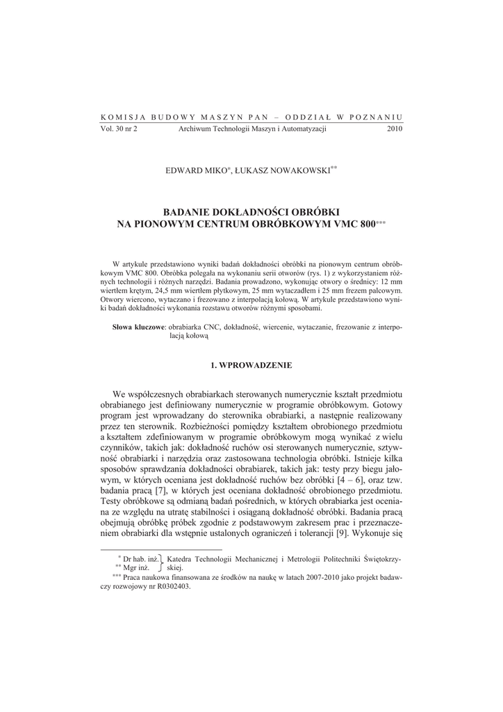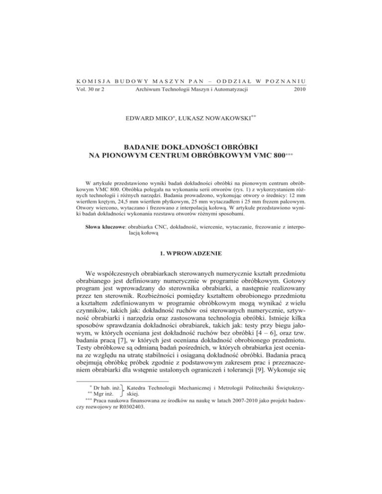 KOMISJA BUDOWY MASZYN PAN – ODDZIAà W POZNANIU Vol. 30 nr 2 Archiwum Technologii Maszyn i Automatyzacji 2010 EDWARD MIKO, àUKASZ NOWAKOWSKI BADANIE DOKàADNOĝCI OBRÓBKI NA PIONOWYM CENTRUM OBRÓBKOWYM VMC 800 W artykule przedstawiono wyniki badaĔ dokáadnoĞci obróbki na pionowym centrum obróbkowym VMC 800. Obróbka polegaáa na wykonaniu serii otworów (rys. 1) z wykorzystaniem róĪnych technologii i róĪnych narzĊdzi. Badania prowadzono, wykonując otwory o Ğrednicy: 12 mm wiertáem krĊtym, 24,5 mm wiertáem páytkowym, 25 mm wytaczadáem i 25 mm frezem palcowym. Otwory wiercono, wytaczano i frezowano z interpolacją koáową. W artykule przedstawiono wyniki badaĔ dokáadnoĞci wykonania rozstawu otworów róĪnymi sposobami. Sáowa kluczowe: obrabiarka CNC, dokáadnoĞü, wiercenie, wytaczanie, frezowanie z interpolacją koáową 1. WPROWADZENIE We wspóáczesnych obrabiarkach sterowanych numerycznie ksztaát przedmiotu obrabianego jest definiowany numerycznie w programie obróbkowym. Gotowy program jest wprowadzany do sterownika obrabiarki, a nastĊpnie realizowany przez ten sterownik. RozbieĪnoĞci pomiĊdzy ksztaátem obrobionego przedmiotu a ksztaátem zdefiniowanym w programie obróbkowym mogą wynikaü z wielu czynników, takich jak: dokáadnoĞü ruchów osi sterowanych numerycznie, sztywnoĞü obrabiarki i narzĊdzia oraz zastosowana technologia obróbki. Istnieje kilka sposobów sprawdzania dokáadnoĞci obrabiarek, takich jak: testy przy biegu jaáowym, w których oceniana jest dokáadnoĞü ruchów bez obróbki [4 – 6], oraz tzw. badania pracą [7], w których jest oceniana dokáadnoĞü obrobionego przedmiotu. Testy obróbkowe są odmianą badaĔ poĞrednich, w których obrabiarka jest oceniana ze wzglĊdu na utratĊ stabilnoĞci i osiąganą dokáadnoĞü obróbki. Badania pracą obejmują obróbkĊ próbek zgodnie z podstawowym zakresem prac i przeznaczeniem obrabiarki dla wstĊpnie ustalonych ograniczeĔ i tolerancji [9]. Wykonuje siĊ Dr hab. inĪ. Mgr inĪ. Katedra Technologii Mechanicznej i Metrologii Politechniki ĝwiĊtokrzyskiej. Praca naukowa finansowana ze Ğrodków na naukĊ w latach 2007-2010 jako projekt badawczy rozwojowy nr R0302403. 88 E. Miko, à. Nowakowski je z uĪyciem przedmiotów próbnych dostarczonych przez uĪytkownika. Ich wymiary i wymagania związane z dokáadnoĞcią obróbki są czĊsto opisane w normach dotyczących badaĔ okreĞlonych typów obrabiarek [7]. Materiaá i parametry skrawania są ustalane w wyniku uzgodnieĔ miĊdzy uĪytkownikiem i producentem [2]. Na specjalne Īyczenie uĪytkownika stosuje siĊ teĪ inne niĪ ujĊte w normach wymiary próbek i wymagania dokáadnoĞci. Badania, które naleĪy przeprowadziü, ustala uĪytkownik w porozumieniu z producentem. Z jednej strony trudno takie rozwiązanie uznaü za obiektywne, z drugiej natomiast uĪytkownik narzuca swoje wymagania wytwórcy i od niego zaleĪą kryteria i wskaĨniki oceny obrabiarki. PoniewaĪ celem stosowania obrabiarek jest uzyskiwanie przedmiotów o zadanych ksztaátach i wymiarach, próba pracą jest korzystniejsza, gdyĪ ma charakter kompleksowy, obejmuje bowiem wszystkie moĪliwe báĊdy, w tym sztywnoĞü obrabiarki, narzĊdzia i przedmiotu obrabianego [3, 9, 10]. W artykule przedstawiono wyniki badaĔ dokáadnoĞci wykonania rozstawu otworów róĪnymi sposobami. DokáadnoĞü tĊ oceniano przez pomiar przedmiotu próbnego wykonanego na obrabiarce CNC. Otrzymane wyniki umoĪliwią wprowadzanie ewentualnych korekt do programu i technologii obróbki, co pozwoli na lepsze wykorzystanie maszyny i uzyskanie wiĊkszej dokáadnoĞci wyrobów koĔcowych. 2. METODYKA I WARUNKI BADAē Celem badaĔ byáo uzyskanie informacji o wpáywie sposobu obróbki otworów na dokáadnoĞü wykonania ich rozstawu po obróbce na frezarce sterowanej numerycznie VMC 800 polskiej firmy FOP AVIA SA.Pierwsza czĊĞü badaĔ zostaáa wykonana w Laboratorium Obrabiarek Sterowanych Numerycznie Politechniki ĝwiĊtokrzyskiej. Za pomocą Programming Station iTNC530 przygotowano programy obróbkowe, które nastĊpnie przesáano do sterownika obrabiarki (sterownik HEIDENHAIN 530), na której wykonano obróbkĊ [1, 8]. Obróbka polegaáa na wykonaniu czterech serii po 11 otworów (rys. 1) z wykorzystaniem róĪnych narzĊdzi i sposobów obróbki. Otwory wykonano trzema sposobami: 1) otwory o Ğrednicy 12 mm wiercono wiertáem krĊtym, a o Ğrednicy 24,5 mm – wiertáem páytkowym, 2) otwory o Ğrednicy 25 mm wytaczano wytaczadáem, 3) otwory o Ğrednicy 25 mm frezowano z interpolacją koáową frezem palcowym 10 mm. Parametry obróbki dobrano zgodnie z zaleceniami producenta narzĊdzi. Zamieszczono je w tablicy 1. Badanie dokáadnoĞci obróbki na pionowym centrum obróbkowym VMC 800 89 Rys. 1. Sposób rozmieszczenia otworów w obrobionym przedmiocie próbnym Fig. 1. Arrangement of holes on the test workpiece Obróbka zostaáa tak zaplanowana, aby oceniü dokáadnoĞü wykonania rozstawu otworów w najazdach na pozycje do wykonania otworów w osi X. Drugą czĊĞü badaĔ, tj. pomiar rozstawu wykonanych otworów, prowadzono bezpoĞrednio po obróbce na obrabiarce z uĪyciem sondy przedmiotowej HEIDENHAIN TS-640. Pomiar byá oparty na bazie technologicznej, która byáa wykorzystywana podczas obróbki [8]. Pomiar rozstawu wykonanych otworów byá oparty na cyklu sondy pomiarowej „421”, w którym ustala siĊ punkt Ğrodkowy i ĞrednicĊ otworu (kieszeni okrągáej). Tablica 1 Parametry obróbkowe przyjĊte podczas badaĔ Machining parameters applied during the tests Nr Rodzaj narzĊdzia 1 2 3 4 Wiertáo krĊte I12 mm Wiertáo páytkowe I24,5 mm Wytaczadáo I25 mm Frez palcowy I10 mm do interpolacji koáowej R = 12,5 mm PrĊdkoĞü skrawania [m/min] Posuw [mm/obr] 100 250 160 120 0,15 0,08 0,03 0,1 3. WYNIKI BADAē W wyniku pomiarów wyznaczono wspóárzĊdne poáoĪenia oraz wartoĞci promieni wykonanych otworów. Przeanalizowano róĪnice poáoĪenia Ğrodka otworów pomiĊd