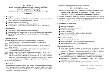 Regulamin RAJDU ROWEROWEGO na 25 km z GMINĄ KOŃSKIE „Początek przygody z Green Velo” organizowanego w ramach Koneckiego Pikniku Rowerowego Uczestników rajdu obowiązuje wpisowe w wysokości: 10 zł - osoby dorosłe 5 zł - dzieci i młodzież szkolna Zgłoszenia udziału w rajdzie wraz z wpisowym przyjmuje do dnia 14.09.2015 r.: 19 września 2015 r. Oddział PTTK w Końskich, ul. Partyzantów 1, 26-200 Końskie, tel. 41 372 3170, www.pttkkonskie.pl, [email protected] 1. Cel imprezy Otwarcie koneckiego odcinka Wschodniego Szlaku Rowerowego „Green Ze wzgledów technicznych organizator ogranicza liczbę uczestników do 250 osób. W przypadku wolnych miejsc zgłoszenia przyjmowane będą również podczas weryfikacji uczestników w dniu imprezy w godz. 8.45 - 9.00. Velo” o długości ok. 1900 km z Elbląga do Końskich. Popularyzacja turystyki rowerowej. Poznanie walorów krajoznawczych Gminy Końskie. Uczczenie 80-tej rocznicy powstania Oddziału PTK-PTTK w Końskich. 2. Organizatorzy Urząd Miasta i Gminy w Końskich, przy współpracy: Oddziału Polskiego Towarzystwa Turystyczno-Krajoznawczego w Końskich Regionalnej Organizacji Turystycznej Województwa Świętokrzyskiego w Kielcach 3. Przebieg imprezy 8.00-8.45 Weryfikacja zgłoszonych uczestników rajdu rowerowego w okolicy fontanny w zespole pałacowo-parkowym w Końskich. 9.00 Otwarcie imprezy. 9.15 Przejazd rowerzystów ulicą Południową i dalej przez Niebo i Piekło do Sielpi (13 km). 10.30 Konferencja prasowa przy Miejscu Obsługi Rowerzysty (MOR) obok Ośrodka Sportu i Rekreacji w Sielpi. 11.00 Wspólny powrót do Końskich ścieżką rowerową „Green Velo” (12 km). 12.00 Udział w Koneckim Pikniku Rowerowym – fontanna przy zespole pałacowo-parkowym w Końskich. W programie m.in.: pokaz akrobacji rowerowej w wykonaniu rekordzisty Guinnessa Krystiana Herby, stoiska rowerowe, konkursy z atrakcyjnymi nagrodami, występy artystyczne. 14.00 Zakończenie imprezy. 5. Świadczenia dla uczestników kamizelka odblaskowa, pamiątkowy certyfikat uczestnictwa, medal okolicznościowy, udział w konkursach, punkty do odznak KOT oraz Turysta Ziemi Koneckiej, odcisk pieczęci pamiątkowej. 6. Obowiązki uczestników posiadanie sprawnych rowerów, przestrzeganie Karty Turysty i przepisów ruchu drogowego, stosowanie się do postanowień organizatorów. 7. Postanowienia końcowe Trasa rajdu przebiega drogami o zróżnicowanej nawierzchni. Należy zwrócić szczególną uwagę na ubytki w asfalcie, koleiny, wystające kamienie i korzenie, niebezpieczne krawędzie jezdni i pobocza. Dodatkowym utrudnieniem może być duże natężenie ruchu. Uczestnicy rajdu biorą w nim udział na własne ryzyko, a organizatorzy nie biorą odpowiedzialności za zdarzenia losowe zaistniałe podczas imprezy. Organizatorzy ubezpieczają uczestników rajdu od następstw nieszczęśliwych wypadków. Interpretacja regulaminu należy do organizatorów i jest ostateczna. 4. Uczestnictwo Rajd Rowerowy z Gminą Końskie jest imprezą ogólnodostępną o charakterze turystyczno-promocyjnym. Uczestnikiem rajdu może być każda osoba, która ukończyła 18 lat oraz młodzież szkolna pod warunkiem sprawowania nad nią opieki przez nauczyciela lub rodzica. Do zobaczenia na szlaku „Green Velo” Organizatorzy RAJD ROWEROWY Z GMINĄ KOŃSKIE „Początek przygody z Green Velo” REGULAMIN Końskie, 19 września 2015 r.