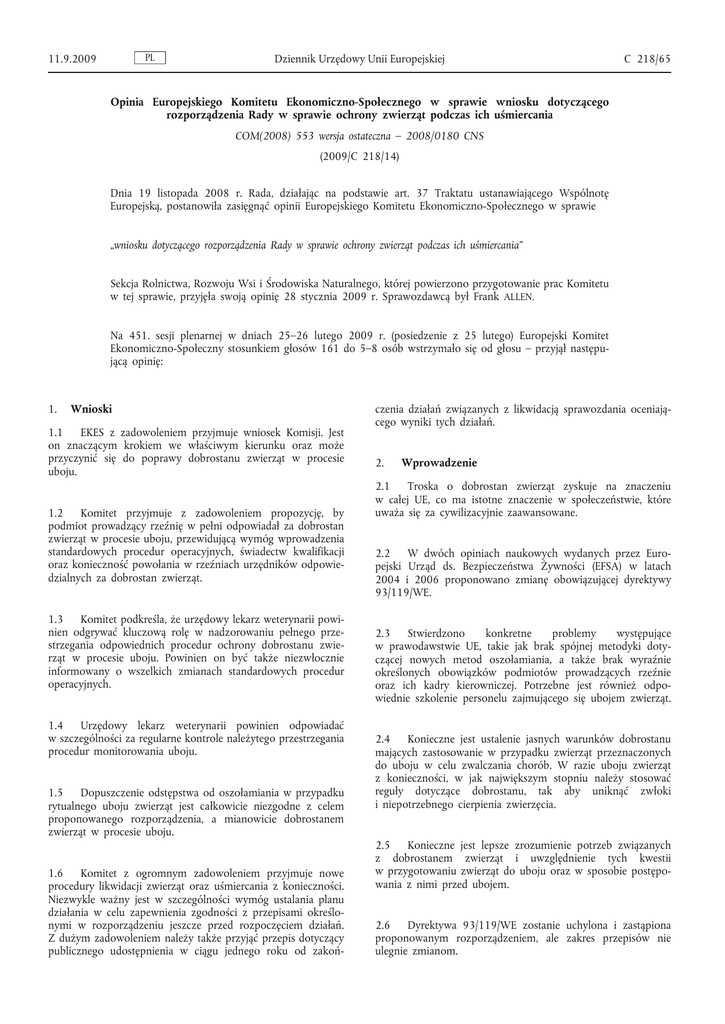 PL 11.9.2009 Dziennik Urzędowy Unii Europejskiej C 218/65 Opinia Europejskiego Komitetu Ekonomiczno-Społecznego w sprawie wniosku dotyczącego rozporządzenia Rady w sprawie ochrony zwierząt podczas ich uśmiercania COM(2008) 553 wersja ostateczna – 2008/0180 CNS (2009/C 218/14) Dnia 19 listopada 2008 r. Rada, działając na podstawie art. 37 Traktatu ustanawiającego Wspólnotę Europejską, postanowiła zasięgnąć opinii Europejskiego Komitetu Ekonomiczno-Społecznego w sprawie „wniosku dotyczącego rozporządzenia Rady w sprawie ochrony zwierząt podczas ich uśmiercania” Sekcja Rolnictwa, Rozwoju Wsi i Środowiska Naturalnego, której powierzono przygotowanie prac Komitetu w tej sprawie, przyjęła swoją opinię 28 stycznia 2009 r. Sprawozdawcą był Frank ALLEN. Na 451. sesji plenarnej w dniach 25–26 lutego 2009 r. (posiedzenie z 25 lutego) Europejski Komitet Ekonomiczno-Społeczny stosunkiem głosów 161 do 5–8 osób wstrzymało się od głosu – przyjął następu jącą opinię: 1. Wnioski 1.1 EKES z zadowoleniem przyjmuje wniosek Komisji. Jest on znaczącym krokiem we właściwym kierunku oraz może przyczynić się do poprawy dobrostanu zwierząt w procesie uboju. 1.2 Komitet przyjmuje z zadowoleniem propozycję, by podmiot prowadzący rzeźnię w pełni odpowiadał za dobrostan zwierząt w procesie uboju, przewidującą wymóg wprowadzenia standardowych procedur operacyjnych, świadectw kwalifikacji oraz konieczność powołania w rzeźniach urzędników odpowie dzialnych za dobrostan zwierząt. 1.3 Komitet podkreśla, że urzędowy lekarz weterynarii powi nien odgrywać kluczową rolę w nadzorowaniu pełnego prze strzegania odpowiednich procedur ochrony dobrostanu zwie rząt w procesie uboju. Powinien on być także niezwłocznie informowany o wszelkich zmianach standardowych procedur operacyjnych. 1.4 Urzędowy lekarz weterynarii powinien odpowiadać w szczególności za regularne kontrole należytego przestrzegania procedur monitorowania uboju. 1.5 Dopuszczenie odstępstwa od oszołamiania w przypadku rytualnego uboju zwierząt jest całkowicie niezgodne z celem proponowanego rozporządzenia, a mianowicie dobrostanem zwierząt w procesie uboju. 1.6 Komitet z ogromnym zadowoleniem przyjmuje nowe procedury likwidacji zwierząt oraz uśmiercania z konieczności. Niezwykle ważny jest w szczególności wymóg ustalania planu działania w celu zapewnienia zgodności z przepisami określo nymi w rozporządzeniu jeszcze przed rozpoczęciem działań. Z dużym zadowoleniem należy także przyjąć przepis dotyczący publicznego udostępnienia w ciągu jednego roku od zakoń czenia działań związanych z likwidacją sprawozdania oceniają cego wyniki tych działań. 2. Wprowadzenie 2.1 Troska o dobrostan zwierząt zyskuje na znaczeniu w całej UE, co ma istotne znaczenie w społeczeństwie, które uważa się za cywilizacyjnie zaawansowane. 2.2 W dwóch opiniach naukowych wydanych przez Euro pejski Urząd ds. Bezpieczeństwa Żywności (EFSA) w latach 2004 i 2006 proponowano zmianę obowiązującej dyrektywy 93/119/WE. 2.3 Stwierdzono konkretne problemy występujące w prawodawstwie UE, takie jak brak spójnej metodyki doty czącej nowych metod oszołamiania, a także brak wyraźnie określonych obowiązków podmiotów prowadzących rzeźnie oraz ich kadry kierowniczej. Potrzebne jest również odpo wiednie szkolenie personelu zajmującego się ubojem zwierząt. 2.4 Konieczne jest ustalenie jasnych warunków dobrostanu mających zastosowanie w przypadku zwierząt przeznaczonych do uboju w celu zwalczania chorób. W razie uboju zwierząt z konieczności, w jak największym stopniu należy stosować reguły dotyczące dobrostanu, tak aby uniknąć zwłoki i niepotrzebnego cierpienia zwierzęcia. 2.5 Konieczne jest lepsze zrozumienie potrzeb związanych z dobrostanem zwierząt i uwzględnienie tych kwestii w przygotowaniu zwierząt do uboju oraz w sposobie postępo wania z nimi przed ubojem. 2.6 Dyrektywa 93/119/WE zostanie uchylona i zastąpiona proponowanym rozporządzeniem, ale zakres przepisów nie ulegnie zmianom. C 218/66 PL Dziennik Urzędowy Unii Europejskiej 2.7 Proponowane we wniosku zastąpienie odnośnej dyrek tywy rozporządzeniem zapewni jednorodne i równoczesne stosowanie przepisów w całej UE, co jest zgodne z zasadami jednolitego rynku. 3. 11.9.2009 3.7 W załączniku I przedstawiono wykaz metod, zgodnie z którymi winno się odbywać oszołamianie, wraz ze szczegó łowym opisem związanych z nimi specyfikacji technicznych. Kontrole skuteczności procesu oszołamiania powinny być prze prowadzane na wystarczająco reprezentatywnej próbie zwierząt, aby proces przebiegał w sposób właściwy i jednolity. Wniosek Komisji 3.1 Rozporządzenie ustanawia przepisy dotyczące uśmier cania zwierząt utrzymywanych dla produkcji żywności, wełny, skóry, futer i innych produktów oraz przepisy dotyczące działań powiązanych. 3.2 Dopuszczone będzie odstępstwo w przypadku uśmier cania z konieczności, aby zapobiec niepotrzebnemu bólowi i cierpieniu zwierzęcia, lub w sytuacjach, w których bezwzględne zastosowanie się do tych przepisów spowodowa łoby natychmiastowe i poważne zagrożenie dla zdrowia i bezpieczeństwa ludzi. 3.3 Rozporządzenie nie będzie w przypadku zwierząt uśmiercanych: miało zastosowania 3.8 Wspólnotowe kodeksy dobrych praktyk dotyczących metod oszołamiania określonych w załączniku I można będzie przyjąć zgodnie z procedurą, o której mowa w art. 22 ust. 2. Procedura ta określona została decyzją Rady z 1999 r., która ustanawia warunki wykonywania przez Komisję przyznanych jej uprawnień wykonawczych za pośrednictwem komitetu regula cyjnego złożonego z przedstawicieli państw członkowskich, któremu przewodniczy przedstawiciel Komisji. 3.9 Podmioty są zobowiązane do sporządzenia i wdrożenia standardowych procedur operacyjnych, aby zapewnić zgodność uśmiercania i powiązanych działań z art. 3 