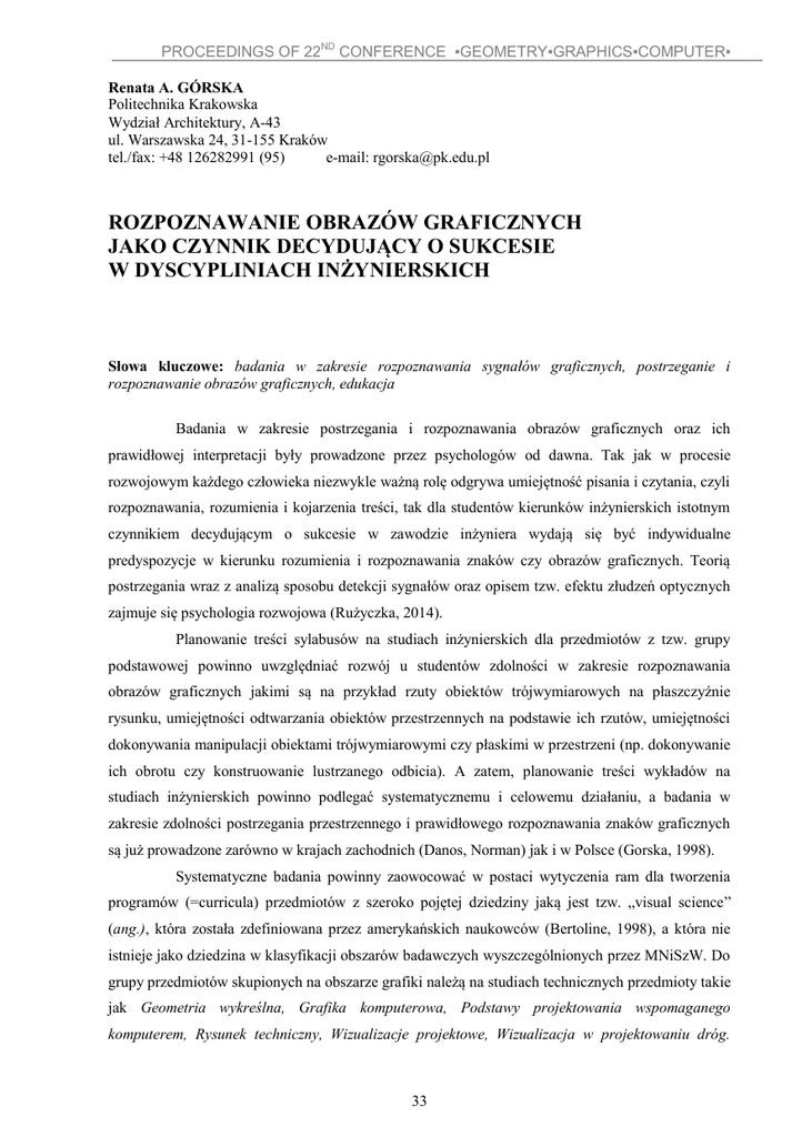 PROCEEDINGS OF 22ND CONFERENCE ▪GEOMETRY▪GRAPHICS▪COMPUTER▪ Renata A. GÓRSKA Politechnika Krakowska Wydział Architektury, A-43 ul. Warszawska 24, 31-155 Kraków tel./fax: +48 126282991 (95) e-mail: [email protected] ROZPOZNAWANIE OBRAZÓW GRAFICZNYCH JAKO CZYNNIK DECYDUJĄCY O SUKCESIE W DYSCYPLINIACH INŻYNIERSKICH Słowa kluczowe: badania w zakresie rozpoznawania sygnałów graficznych, postrzeganie i rozpoznawanie obrazów graficznych, edukacja Badania w zakresie postrzegania i rozpoznawania obrazów graficznych oraz ich prawidłowej interpretacji były prowadzone przez psychologów od dawna. Tak jak w procesie rozwojowym każdego człowieka niezwykle ważną rolę odgrywa umiejętność pisania i czytania, czyli rozpoznawania, rozumienia i kojarzenia treści, tak dla studentów kierunków inżynierskich istotnym czynnikiem decydującym o sukcesie w zawodzie inżyniera wydają się być indywidualne predyspozycje w kierunku rozumienia i rozpoznawania znaków czy obrazów graficznych. Teorią postrzegania wraz z analizą sposobu detekcji sygnałów oraz opisem tzw. efektu złudzeń optycznych zajmuje się psychologia rozwojowa (Rużyczka, 2014). Planowanie treści sylabusów na studiach inżynierskich dla przedmiotów z tzw. grupy podstawowej powinno uwzględniać rozwój u studentów zdolności w zakresie rozpoznawania obrazów graficznych jakimi są na przykład rzuty obiektów trójwymiarowych na płaszczyźnie rysunku, umiejętności odtwarzania obiektów przestrzennych na podstawie ich rzutów, umiejętności dokonywania manipulacji obiektami trójwymiarowymi czy płaskimi w przestrzeni (np. dokonywanie ich obrotu czy konstruowanie lustrzanego odbicia). A zatem, planowanie treści wykładów na studiach inżynierskich powinno podlegać systematycznemu i celowemu działaniu, a badania w zakresie zdolności postrzegania przestrzennego i prawidłowego rozpoznawania znaków graficznych są już prowadzone zarówno w krajach zachodnich (Danos, Norman) jak i w Polsce (Gorska, 1998). Systematyczne badania powinny zaowocować w postaci wytyczenia ram dla tworzenia programów (=curricula) przedmiotów z szeroko pojętej dziedziny jaką jest tzw. „visual science” (ang.), która została zdefiniowana przez amerykańskich naukowców (Bertoline, 1998), a która nie istnieje jako dziedzina w klasyfikacji obszarów badawczych wyszczególnionych przez MNiSzW. Do grupy przedmiotów skupionych na obszarze grafiki należą na studiach technicznych przedmioty takie jak Geometria wykreślna, Grafika komputerowa, Podstawy projektowania wspomaganego komputerem, Rysunek techniczny, Wizualizacje projektowe, Wizualizacja w projektowaniu dróg. 33 PROCEEDINGS OF 22ND CONFERENCE ▪GEOMETRY▪GRAPHICS▪COMPUTER▪ Tworzenie ram dla programów uwzględniających potrzeby studentów studiów inżynierskich jest niezwykle ważne w kontekście znalezienia wspólnego mianownika dla prowadzonych badań, którym jest kształcenie umiejętności rozpoznawania obrazów graficznych. Temat jest znany badaczom w wielu krajach świata (Barr i in., 1994; Bertoline, 1998; Danos i in.,2014; Wilmot, 1999), a także jest znany w środowisku polskim (Żakowska, 2001), jednakże rozpoznawany głównie przez psychologów, chociaż powinien być znany również w kręgach edukacyjnych na studiach inżynierskich. Celem niniejszej pracy jest dokonanie systemowej analizy badawczej dostępnej literatury w zakresie badań dotyczących tzw. „graphicacy” czyli umiejętności rozpoznawania znaków/obrazów graficznych i wykorzystania tych umiejętności w praktyce inżynierskiej, a następnie opracowanie kryteriów jakim powinny podlegać ramy programów studiów inżynierskich dla dostosowania ich do wymogu kształcenia oraz w efekcie osiągnięcia zdolności do prawidłowej interpretacji znaków graficznych przez przyszłych inżynierów, którzy są absolwentami kierunków technicznych. Literatura: [1] Barr R.E., Juricic D., Krueger T.J.: The role of graphics and modeling in concurrent engineering environment, EDGD 58(3), s. 12 – 21, 1994. [2] Bertoline G. R.: Visual science: an emerging discipline, Journal for Geometry and Graphics, Vol.2, No.2, s. 81-187, 1998. [3] Danos X., Barr R.E., Górska R.A., Norman E.: Curriculum planning for the development of graphicacy capability: three case studies from Europe and the USA, EJEE, Vol.39, No.6, s. 666-684, http://dx.doi.org/10.1080/03043797.2014.899324, 2014. [4] Sorby S.A., Górska R.A.: The effect of various courses and teaching methods on the Improvement of Spatial Ability, Proc. 8th ICEDGDG, Austin, Texas, s. 252-256, 1998. [5] Rużyczka A.: Sensory Impression, Signal Detection and Optic Illusion. Proc. 21 st conf. Geometry Graphics Computer, Gdańsk - Sopot 2014, Gliwice, 2014. [6] Wilmot D.: Graphicacy as a Form of Communication, South African Geographical Journal (Special Issue June) 81(2), s.91-95, 1999. [7] Żakowska L.: Wizualizacja w projektowaniu dróg: Aspekty bezpieczeństwa i estetyki, Wyd. Politechniki Krakowskiej, Zeszyty Naukowe Architektura nr 44, 2001. 34
