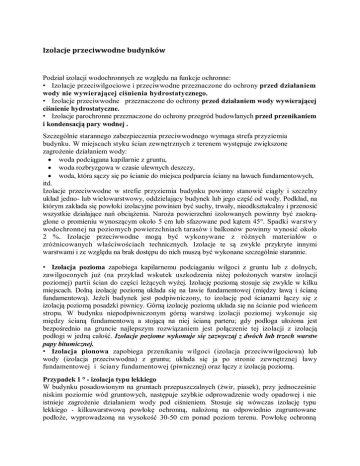 Izolacje przeciwwodne budynków Podział izolacji wodochronnych ze względu na funkcje ochronne: • Izolacje przeciwilgociowe i przeciwwodne przeznaczone do ochrony przed działaniem wody nie wywierającej ciśnienia hydrostatycznego. • Izolacje przeciwwodne przeznaczone do ochrony przed działaniem wody wywierającej ciśnienie hydrostatyczne. • Izolacje parochronne przeznaczone do ochrony przegród budowlanych przed przenikaniem i kondensacją pary wodnej . Szczególnie starannego zabezpieczenia przeciwwodnego wymaga strefa przyziemia budynku. W miejscach styku ścian zewnętrznych z terenem występuje zwiększone zagrożenie działaniem wody: woda podciągana kapilarnie z gruntu, woda rozbryzgowa w czasie ulewnych deszczy, woda, która sączy się po ścianie do miejsca podparcia ściany na ławach fundamentowych, itd. Izolacje przeciwwodne w strefie przyziemia budynku powinny stanowić ciągły i szczelny układ jedno- lub wielowarstwowy, oddzielający budynek lub jego część od wody. Podkład, na którym zakłada się powłoki izolacyjne powinien być suchy, trwały, nieodkształcalny i przenosić wszystkie działające nań obciążenia. Naroża powierzchni izolowanych powinny być zaokrąglone o promieniu wynoszącym około 5 cm lub sfazowane pod kątem 45°. Spadki warstwy wodochronnej na poziomych powierzchniach tarasów i balkonów powinny wynosić około 2 %. Izolacje przeciwwodne mogą być wykonywane z różnych materiałów o zróżnicowanych właściwościach technicznych. Izolacje te są zwykle przykryte innymi warstwami i ze względu na brak dostępu do nich muszą być wykonane szczególnie starannie. • Izolacja pozioma zapobiega kapilarnemu podciąganiu wilgoci z gruntu lub z dolnych, zawilgoconych już (na przykład wskutek uszkodzenia niżej położonych warstw izolacji poziomej) partii ścian do części leżących wyżej. Izolację poziomą stosuje się zwykle w kilku miejscach. Dolną izolację poziomą układa się na ławie fundamentowej (między ławą i ścianą fundamentową). Jeżeli budynek jest podpiwniczony, to izolację pod ścianami łączy się z izolacją poziomą posadzki piwnicy. Górną izolację poziomą układa się na ścianie pod wieńcem stropu. W budynku niepodpiwniczonym górną warstwę izolacji poziomej wykonuje się między ścianą fundamentową a stojącą na niej ścianą parteru; gdy podłoga ułożona jest bezpośrednio na gruncie najlepszym rozwiązaniem jest połączenie tej izolacji z izolacją podłogi w jedną całość. Izolacje poziome wykonuje się zazwyczaj z dwóch lub trzech warstw papy bitumicznej. • Izolacja pionowa zapobiega przenikaniu wilgoci (izolacja przeciwwilgociowa) lub wody (izolacja przeciwwodna) z gruntu; układa się ja po stronie zewnętrznej ławy fundamentowej i ściany fundamentowej (piwnicznej) oraz łączy z izolacją poziomą. Przypadek 1 ° - izolacja typu lekkiego W budynku posadowionym na gruntach przepuszczalnych (żwir, piasek), przy jednocześnie niskim poziomie wód gruntowych, następuje szybkie odprowadzenie wody opadowej i nie istnieje zagrożenie działaniem wody pod ciśnieniem. Stosuje się wówczas izolację typu lekkiego - kilkuwarstwową powłokę ochronną, nałożoną na odpowiednio zagruntowane podłoże, wyprowadzoną na wysokość 30-50 cm ponad poziom terenu. Powłokę ochronną wykonuje się z kilku warstw powłok bitumicznych nakładanych na zimno lub na gorąco albo ze szczelnej zaprawy lub uszczelniających wypraw powłokowych. Rola izolacji polega przede wszystkim na zamknięciu porów w wierzchniej warstwie ściany. Przypadek 2° - izolacja typu średniego W budynku posadowionym na gruntach słabo przepuszczalnych (glina, iły) z niskim poziomem wód gruntowych, istnieje możliwość krótkotrwałego występowania w gruncie wody zawieszonej pod ciśnieniem. W tej sytuacji wykonuje się izolację typu średniego: z dwóch warstw papy bitumicznej tradycyjnej lub folii sklejonych lepikami i pokrytych powłoką ochronną, lub pojedynczej warstwy papy termozgrzewalnej z dwóch warstw masy bitumicznej - polimerowej; w pierwszą warstwę wtapia się tkaninę zbrojącą z włókna szklanego powlekanego tworzywem sztucznym. Izolację wyprowadza się na wysokość około 50 cm powyżej poziomu, do którego jej zastosowanie jest konieczne ze względu na poziom wody zawieszonej. Dopiero wyżej ułożyć można izolację jak w przypadku 1°. Przy możliwości krótkotrwałego działania wody zawieszonej pod ciśnieniem, izolację tego typu można stosować tylko pod warunkiem wykonania skutecznego drenażu. Przypadek 3° - izolacja typu ciężkiego Izolację typu ciężkiego wykonuje się wtedy, gdy występuje wysoki poziom wód gruntowych lub możliwość długotrwałego działania wody zawieszonej pod ciśnieniem: wykonuje się ją w postaci wanny wodoszczelnej, którą uzyskuje się przez wylanie płyty fundamentowej łącznie ze ścianami fundamentowymi oraz ułożenie od zewnątrz (pod płytą fundamentową i po zewnętrznej stronie ścian) izolacji z trzech warstw tradycyjnej papy lub folii, w postaci wanny wewnętrznej z betonu szczelnego, z dwóch warstw masy bitumiczno-polimerowej z wtopioną siatką zbrojącą, lub z dwóch warstw papy termozgrzewalnej . Izolację wyprowadza się na wysokość około 50 cm powyżej najwyższego spodziewanego poziomu wody gruntowej. Nad nią stosuje się kolejno izolacje opisane dla przypadków 1 °, 2°. Ścianę dociskową stosuje się w przypadku stosowania materiałów rolowych (pap) często wykonując najpierw ściankę z przyklejoną izolacją a później ścianę fundamentową. Ścianka dociskowa powinna być wzniesiona ponad poziom wód gruntowych o 0,5 m