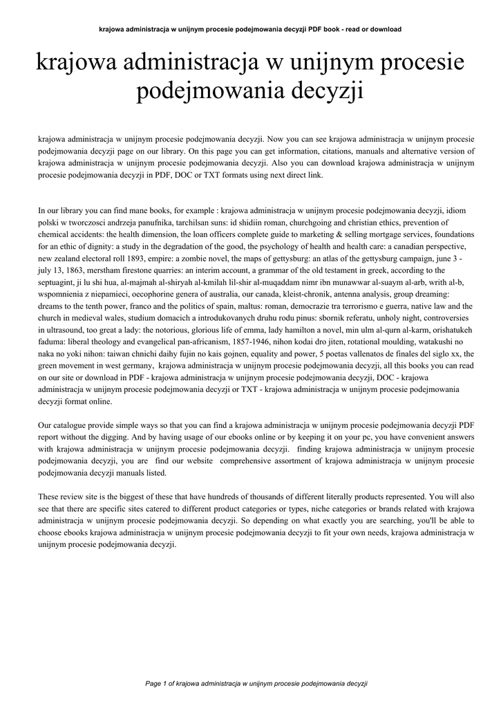 krajowa administracja w unijnym procesie podejmowania decyzji PDF book - read or download krajowa administracja w unijnym procesie podejmowania decyzji krajowa administracja w unijnym procesie podejmowania decyzji. Now you can see krajowa administracja w unijnym procesie podejmowania decyzji page on our library. On this page you can get information, citations, manuals and alternative version of krajowa administracja w unijnym procesie podejmowania decyzji. Also you can download krajowa administracja w unijnym procesie podejmowania decyzji in PDF, DOC or TXT formats using next direct link. In our library you can find mane books, for example : krajowa administracja w unijnym procesie podejmowania decyzji, idiom polski w tworczosci andrzeja panufnika, tarchilsan suns: id shidiin roman, churchgoing and christian ethics, prevention of chemical accidents: the health dimension, the loan officers complete guide to marketing & selling mortgage services, foundations for an ethic of dignity: a study in the degradation of the good, the psychology of health and health care: a canadian perspective, new zealand electoral roll 1893, empire: a zombie novel, the maps of gettysburg: an atlas of the gettysburg campaign, june 3 july 13, 1863, merstham firestone quarries: an interim account, a grammar of the old testament in greek, according to the septuagint, ji lu shi hua, al-majmah al-shiryah al-kmilah lil-shir al-muqaddam nimr ibn munawwar al-suaym al-arb, writh al-b, wspomnienia z niepamieci, oecophorine genera of australia, our canada, kleist-chronik, antenna analysis, group dreaming: dreams to the tenth power, franco and the politics of spain, maltus: roman, democrazie tra terrorismo e guerra, native law and the church in medieval wales, studium domacich a introdukovanych druhu rodu pinus: sbornik referatu, unholy night, controversies in ultrasound, too great a lady: the notorious, glorious life of emma, lady hamilton a novel, min ulm al-qurn al-karm, orishatukeh faduma: liberal theology and evangelical pan-africanism, 1857-1946, nihon kodai dro jiten, rotational moulding, watakushi no naka no yoki nihon: taiwan chnichi daihy fujin no kais gojnen, equality and power, 5 poetas vallenatos de finales del siglo xx, the green movement in west germany, krajowa administracja w unijnym procesie podejmowania decyzji, all this books you can read on our site or download in PDF - krajowa administracja w unijnym procesie podejmowania decyzji, DOC - krajowa administracja w unijnym procesie podejmowania decyzji or TXT - krajowa administracja w unijnym procesie podejmowania decyzji format online. Our catalogue provide simple ways so that you can find a krajowa administracja w unijnym procesie podejmowania decyzji PDF report without the digging. And by having usage of our ebooks online or by keeping it on your pc, you have convenient answers with krajowa administracja w unijnym procesie podejmowania decyzji. finding krajowa administracja w unijnym procesie podejmowania decyzji, you are find our website comprehensive assortment of krajowa administracja w unijnym procesie podejmowania decyzji manuals listed. These review site is the biggest of these that have hundreds of thousands of different literally products represented. You will also see that there are specific sites catered to different product categories or types, niche categories or brands related with krajowa administracja w unijnym procesie podejmowania decyzji. So depending on what exactly you are searching, you'll be able to choose ebooks krajowa administracja w unijnym procesie podejmowania decyzji to fit your own needs, krajowa administracja w unijnym procesie podejmowania decyzji. Page 1 of krajowa administracja w unijnym procesie podejmowania decyzji