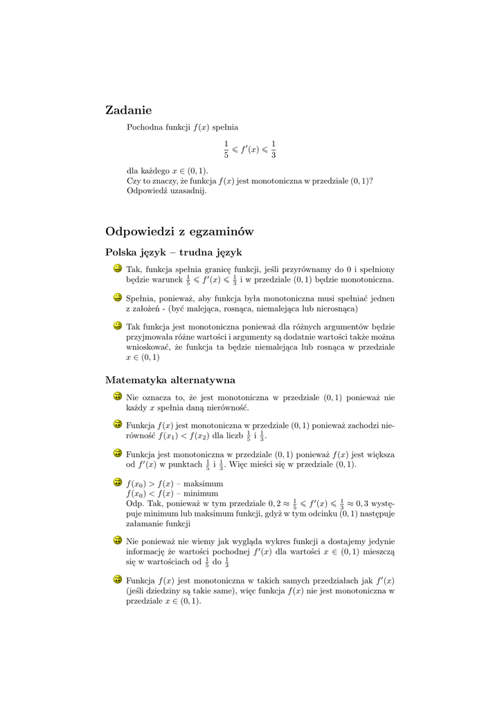 Zadanie Pochodna funkcji f (x) spełnia 1 1 ¬ f 0 (x) ¬ 5 3 dla każdego x ∈ (0, 1). Czy to znaczy, że funkcja f (x) jest monotoniczna w przedziale (0, 1)? Odpowiedź uzasadnij. Odpowiedzi z egzaminów Polska język – trudna język Tak, funkcja spełnia granicę funkcji, jeśli przyrównamy do 0 i spełniony będzie warunek 15 ¬ f 0 (x) ¬ 13 i w przedziale (0, 1) będzie monotoniczna. Spełnia, ponieważ, aby funkcja była monotoniczna musi spełniać jednen z założeń - (być malejąca, rosnąca, niemalejąca lub nierosnąca) Tak funkcja jest monotoniczna ponieważ dla różnych argumentów będzie przyjmowała różne wartości i argumenty są dodatnie wartości także można wnioskować, że funkcja ta będzie niemalejąca lub rosnąca w przedziale x ∈ (0, 1) Matematyka alternatywna Nie oznacza to, że jest monotoniczna w przedziale (0, 1) ponieważ nie każdy x spełnia daną nierówność. Funkcja f (x) jest monotoniczna w przedziale (0, 1) ponieważ zachodzi nierówność f (x1 ) < f (x2 ) dla liczb 15 i 13 . Funkcja jest monotoniczna w przedziale (0, 1) ponieważ f (x) jest większa od f 0 (x) w punktach 51 i 13 . Więc mieści się w przedziale (0, 1). f (x0 ) > f (x) – maksimum f (x0 ) < f (x) – minimum Odp. Tak, ponieważ w tym przedziale 0, 2 ≈ 15 ¬ f 0 (x) ¬ 13 ≈ 0, 3 występuje minimum lub maksimum funkcji, gdyż w tym odcinku (0, 1) następuje załamanie funkcji Nie ponieważ nie wiemy jak wygląda wykres funkcji a dostajemy jedynie informację że wartości pochodnej f 0 (x) dla wartości x ∈ (0, 1) mieszczą się w wartościach od 51 do 31 Funkcja f (x) jest monotoniczna w takich samych przedziałach jak f 0 (x) (jeśli dziedziny są takie same), więc funkcja f (x) nie jest monotoniczna w przedziale x ∈ (0, 1). Tak, ponieważ funkcja z pochodną się pokrywają. Jest monotoniczna gdyż w tym przedziale pochodna może mieć rożną wartość. Nie znaczy to, że funkcja f (x) jest monotoniczna w przedziale (0, 1). To, że nierówność 15 ¬ f 0 (x) ¬ 13 jest spełniona dla x ∈ (0, 1) mówi o tym, że pochodna w przedziale ( 15 , 13 ) istnieje jeżeli x ∈ (0, 1). Tak, ponieważ funkcja f (x) jest większa od zera. „Odpowiedź uzasadnij” – a co to może znaczyć? Monotoniczność: Funkcja f jest rosnąca w danym przedziale gdy dla dowolnych liczb x1 , x2 , takich, że x1 < x2 zachodzi f (x1 ) < f (x2 ). Funkcja f jest malejąca w danym przedziale gdy dla dowolnych liczb x1 , x2 , takich że x1 < x2 zachodzi f (x1 ) > (x2 ). odp: Funkcja f (x) jest monotoniczna, ponieważ Monotoniczność funkcji Funkcja f jest rosnąca w pewnym przedziale, gdy dla dowolnych liczb x1 , x2 z tego przedziału takich, że x1 < x2 zachodzi f (x1 ) < f (x2 ) Funkcja jest malejąca w pewnym przedziale, gdy dla dowolnych liczb x1 , x2 tego przedziału takich x1 > x2 zachodzi f (x1 > f (x2 ). TAK Tak. Funkcja f (x) jest rosnąca w przedziale (0, 1) Nie ogarniam Tak. funkcja jest monotoniczna, kiedy jest rosnąca, malejąca, nierosnąca i niemalejąca. bądź stała a tutaj spełnia choćby 1 z tych warunków. (Monotoniczność przedział, gdzie zawiera się D). funkcja jest monotoniczna ponieważ będzie w tym przedziale malejąca, stała lub rosnąca Tak, ponieważ monotoniczna funkcja, to taka, która ma określony porządek zbiorów, w tym przypadku x ∈ (0, 1) spełnia 51 ¬ f 0 (x) ¬ 31 Tak, ponieważ funkcji rośnie w danym przedziale funkcja osiąga minimum czyli jest malejąca. Oznacza to, że przyjmuje jedną z 4 wartości (maleje, rośnie, nierosnąca, niemalejąca). Każdy i x ∈ (0, 1) mieści się pomiędzy 15 a 13 . Funkcja f (x) jest monotoniczna w przedziale (0, 1) ponieważ x należą do niej punkty x ∈ (0, 1) ale z pochodnej czyli np. 1x który mieści się w przedziale 15 ¬ x ¬ 13 . Odpowiedź prawidłowa Tak, ponieważ w tym przedziale pochodna f 0 (x) jest większa od 0.