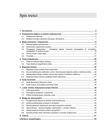 Spis treści 1. Od autorów ........................................................................................................................... 2 2. Podstawowe pojęcia w analizie statystycznej................................................................... 3 2.1 2.2 Podstawowe definicje ...................................................................................................................3 Rozkład normalny (Gaussa) (Gaussian distribution)....................................................................7 3. Błędy pomiarów i niepewność .......................................................................................... 13 3.1 3.2 3.3 3.4 3.5 Rodzaje błędów pomiarowych....................................................................................................13 Szacowanie niepewności pomiaru .............................................................................................15 Propagacja niepewności – propagacja błędów losowych (propagation of uncertainty, propagation of random errors)....................................................................................................18 Wynik pomiaru i jego zapis.........................................................................................................21 Przykłady ....................................................................................................................................21 4. Testy statystyczne ............................................................................................................. 26 4.1 4.2 Testy na wykrycie błędu grubego ...............................................................................................26 Testy istotności (significance tests) ............................................................................................29 5. Regresja liniowa................................................................................................................. 36 5.1 5.2 5.3 5.4 Regresja liniowa zwykła (linear regression) ...............................................................................36 Krzywa kalibracyjna (calibration curve). Wyznaczanie stężenia analitu w badanej próbce ......38 Metoda kilkukrotnego dodatku wzorca (the method of standard additions)...............................39 Regresja liniowa ważona (weighted linear regression) ..............................................................41 6. Karty kontrolne................................................................................................................... 45 6.1 6.2 Karta Shewharta (Shewhart Chart) ............................................................................................45 Karta CuSum (Cumulative Summing Chart) ..............................................................................46 7. e-stat: analiza statystyczna przez Internet....................................................................... 48 7.1 7.2 7.3 Informacje ogólne .......................................................................................................................48 Wymagania sprzętowe i systemowe ..........................................................................................48 Krótka charakterystyka modułów e-stat .....................................................................................48 8. Wstęp do chemometrii....................................................................................................... 51 8.1 8.2 8.3 8.4 8.5 8.6 Przygotowanie danych do obróbki chemometrycznej ................................................................51 Analiza podobieństwa (analysis of similarity) .............................................................................53 Metoda głównych składowych (principal component analysis) ..................................................54 Optymalizacja - metoda simpleksu (optimization – simplex method).........................................55 Rozpoznawanie obrazów (pattern recognition) ..........................................................................57 Sposób pomiaru ilości informacji uzyskanej w procesie analitycznym ......................................59 9. Tablice................................................................................................................................. 61 Literatura uzupełniająca......................................................................................................... 64