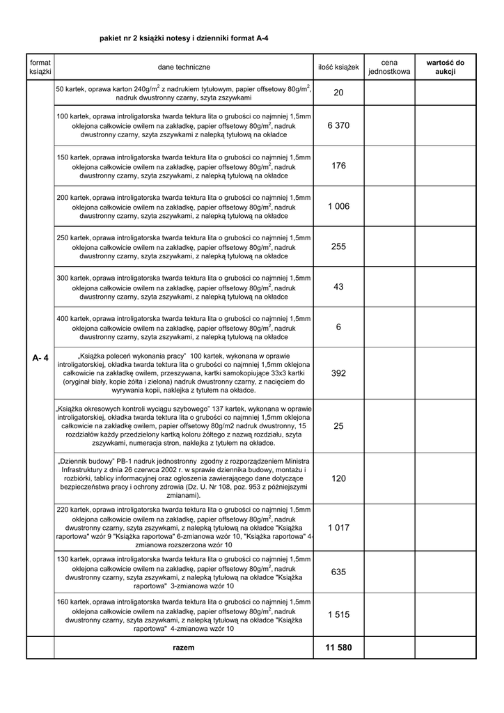 pakiet nr 2 ksiąŜki notesy i dzienniki format A-4 format ksiąŜki A- 4 dane techniczne ilość ksiąŜek 50 kartek, oprawa karton 240g/m2 z nadrukiem tytułowym, papier offsetowy 80g/m2, nadruk dwustronny czarny, szyta zszywkami 20 100 kartek, oprawa introligatorska twarda tektura lita o grubości co najmniej 1,5mm 2 oklejona całkowicie owilem na zakładkę, papier offsetowy 80g/m , nadruk dwustronny czarny, szyta zszywkami z nalepką tytułową na okładce 6 370 150 kartek, oprawa introligatorska twarda tektura lita o grubości co najmniej 1,5mm 2 oklejona całkowicie owilem na zakładkę, papier offsetowy 80g/m , nadruk dwustronny czarny, szyta zszywkami, z nalepką tytułową na okładce 176 200 kartek, oprawa introligatorska twarda tektura lita o grubości co najmniej 1,5mm 2 oklejona całkowicie owilem na zakładkę, papier offsetowy 80g/m , nadruk dwustronny czarny, szyta zszywkami, z nalepką tytułową na okładce 1 006 250 kartek, oprawa introligatorska twarda tektura lita o grubości co najmniej 1,5mm oklejona całkowicie owilem na zakładkę, papier offsetowy 80g/m2, nadruk dwustronny czarny, szyta zszywkami, z nalepką tytułową na okładce 255 300 kartek, oprawa introligatorska twarda tektura lita o grubości co najmniej 1,5mm oklejona całkowicie owilem na zakładkę, papier offsetowy 80g/m2, nadruk dwustronny czarny, szyta zszywkami, z nalepką tytułową na okładce 43 400 kartek, oprawa introligatorska twarda tektura lita o grubości co najmniej 1,5mm oklejona całkowicie owilem na zakładkę, papier offsetowy 80g/m2, nadruk dwustronny czarny, szyta zszywkami, z nalepką tytułową na okładce 6 „KsiąŜka poleceń wykonania pracy” 100 kartek, wykonana w oprawie introligatorskiej, okładka twarda tektura lita o grubości co najmniej 1,5mm oklejona całkowicie na zakładkę owilem, przeszywana, kartki samokopiujące 33x3 kartki (oryginał biały, kopie Ŝółta i zielona) nadruk dwustronny czarny, z nacięciem do wyrywania kopii, naklejka z tytułem na okładce. 392 „KsiąŜka okresowych kontroli wyciągu szybowego” 137 kartek, wykonana w oprawie introligatorskiej, okładka twarda tektura lita o grubości co najmniej 1,5mm oklejona całkowicie na zakładkę owilem, papier offsetowy 80g/m2 nadruk dwustronny, 15 rozdziałów kaŜdy przedzielony kartką koloru Ŝółtego z nazwą rozdziału, szyta zszywkami, numeracja stron, naklejka z tytułem na okładce. 25 „Dziennik budowy” PB-1 nadruk jednostronny zgodny z rozporządzeniem Ministra Infrastruktury z dnia 26 czerwca 2002 r. w sprawie dziennika budowy, montaŜu i rozbiórki, tablicy informacyjnej oraz ogłoszenia zawierającego dane dotyczące bezpieczeństwa pracy i ochrony zdrowia (Dz. U. Nr 108, poz. 953 z późniejszymi zmianami). 120 220 kartek, oprawa introligatorska twarda tektura lita o grubości co najmniej 1,5mm oklejona całkowicie owilem na zakładkę, papier offsetowy 80g/m2, nadruk dwustronny czarny, szyta zszywkami, z nalepką tytułową na okładce "KsiąŜka raportowa" wzór 9 "KsiąŜka raportowa" 6-zmianowa wzór 10, "KsiąŜka raportowa" 4zmianowa rozszerzona wzór 10 1 017 130 kartek, oprawa introligatorska twarda tektura lita o grubości co najmniej 1,5mm oklejona całkowicie owilem na zakładkę, papier offsetowy 80g/m2, nadruk dwustronny czarny, szyta zszywkami, z nalepką tytułową na okładce "KsiąŜka raportowa" 3-zmianowa wzór 10 635 160 kartek, oprawa introligatorska twarda tektura lita o grubości co najmniej 1,5mm oklejona całkowicie owilem na zakładkę, papier offsetowy 80g/m2, nadruk dwustronny czarny, szyta zszywkami, z nalepką tytułową na okładce "KsiąŜka raportowa" 4-zmianowa wzór 10 1 515 razem 11 580 cena jednostkowa wartość do aukcji