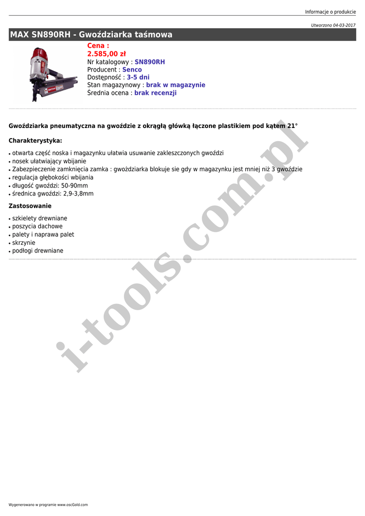 Informacje o produkcie Utworzono 04-03-2017 MAX SN890RH - Gwoździarka taśmowa Cena : 2.585,00 zł Nr katalogowy : SN890RH Producent : Senco Dostępność : 3-5 dni Stan magazynowy : brak w magazynie Średnia ocena : brak recenzji Gwoździarka pneumatyczna na gwoździe z okrągłą główką łączone plastikiem pod kątem 21° ● ● ● ● ● ● m .p l Charakterystyka: otwarta część noska i magazynku ułatwia usuwanie zakleszczonych gwoździ nosek ułatwiający wbijanie Zabezpieczenie zamknięcia zamka : gwożdziarka blokuje sie gdy w magazynku jest mniej niż 3 gwoździe regulacja głębokości wbijania długość gwoździ: 50-90mm średnica gwoździ: 2,9-3,8mm ● ● ● ● i- to ol s. ● szkielety drewniane poszycia dachowe palety i naprawa palet skrzynie podłogi drewniane co Zastosowanie Wygenerowano w programie www.oscGold.com