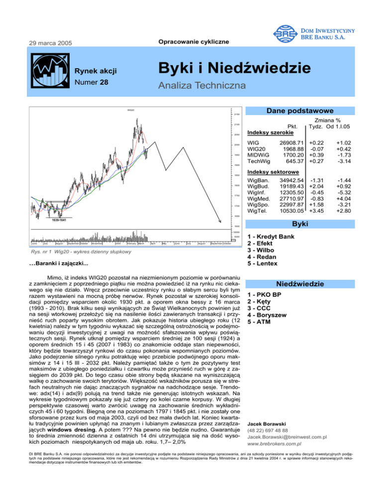 Byki i Niedźwiedzie BRE Bank BRE Bank Securities Opracowanie cykliczne 29 marca 2005 Rynek akcji Byki i Niedźwiedzie Numer 28 Analiza Techniczna WIG20 2150 2100 2050 2000 1950 Dane podstawowe Pkt. Indeksy szerokie WIG WIG20 MIDWiG TechWig Zmiana % Tydz. Od 1.I.05 26908.71 +0.22 1968.88 -0.07 1700.20 +0.39 645.37 +0.27 +1.02 +0.42 -1.73 -3.14 1900 1850 1800 1750 1700 Indeksy sektorowe WigBan. WigBud. WigInf. WigMed. WigSpo. WigTel. 34942.54 -1.31 19189.43 +2.04 12305.50 -0.45 27710.97 -0.83 22997.87 +1.58 10530.05 +3.45 -1.44 +0.92 -5.32 +4.04 -3.21 +2.80 1650 1639-1641 Byki 1600 10000 5000 x100 June July August September October November 2005 February March April May June July August September October Rys. nr 1 Wig20 - wykres dzienny słupkowy …Baranki i zajączki... Mimo, iż indeks WIG20 pozostał na niezmienionym poziomie w porównaniu z zamknięciem z poprzedniego piątku nie można powiedzieć iż na rynku nic ciekawego się nie działo. Wręcz przeciwnie uczestnicy rynku o słabym sercu byli tym razem wystawieni na mocną próbę nerwów. Rynek pozostał w szerokiej konsolidacji pomiędzy wsparciem okolic 1930 pkt. a oporem okna bessy z 16 marca (1993 - 2010). Brak kilku sesji wynikających ze Świąt Wielkanocnych powinien już na sesji wtorkowej przełożyć się na nasilenie ilości zawieranych transakcji i przynieść ruch poparty wysokim obrotem. Jak pokazuje historia ubiegłego roku (12 kwietnia) należy w tym tygodniu wykazać się szczególną ostrożnością w podejmowaniu decyzji inwestycyjnej z uwagi na możność sfałszowania wpływu poświątecznych sesji. Rynek utknął pomiędzy wsparciem średniej ze 100 sesji (1924) a oporem średnich 15 i 45 (2007 i 1983) co znakomicie oddaje stan niepewności, który będzie towarzyszył rynkowi do czasu pokonania wspomnianych poziomów. Jako podejrzenie silnego rynku potraktuję więc przebicie podwójnego oporu maksimów z 14 i 15 III - 2032 pkt. Należy pamiętać także o tym że pozytywny test maksimów z ubiegłego poniedziałku i czwartku może przynieść ruch w górę z zasięgiem do 2039 pkt. Do tego czasu obie strony będą skazane na wyniszczającą walkę o zachowanie swoich terytoriów. Większość wskaźników porusza się w strefach neutralnych nie dając znaczących sygnałów na nadchodzące sesje. Trendowe: adx(14) i adx(9) polują na trend także nie generując istotnych wskazań. Na wykresie tygodniowym pokazały się już cztery po kolei czarne korpusy. W długiej perspektywie czasowej warto zwrócić uwagę na zachowanie średnich wykładniczych 45 i 60 tygodni. Biegną one na poziomach 1797 i 1845 pkt. i nie zostały one sforsowane przez kurs od maja 2003, czyli od bez mała dwóch lat. Koniec kwartału tradycyjnie powinien upłynąć na znanym i lubianym zwłaszcza przez zarządzających windows dresing. A potem ??? Na pewno nie będzie nudno. Gwarantuje to średnia zmienność dzienna z ostatnich 14 dni utrzymująca się na dość wysokich poziomach niespotykanych od maja ub. roku. 1,7– 2,0% 1 - Kredyt Bank 2 - Efekt 3 - Wilbo 4 - Redan 5 - Lentex Niedźwiedzie 1 - PKO BP 2 - Kęty 3 - CCC 4 - Boryszew 5 - ATM Jacek Borawski (48 22) 697 48 88 [email protected] www.brebrokers.com.pl DI BRE Banku S.A. nie ponosi odpowiedzialności za decyzje inwestycyjne podjęte na podstawie niniejszego opracowania, ani za szkody poniesione w wyniku decyzji inwestycyjnych podjętych na podstawie niniejszego opracowania, które nie jest rekomendacją w rozumieniu Rozporządzenia Rady Ministrów z dnia 21 kwietnia 2004 r. w sprawie informacji stanowiących rekomendacje dotyczące instrumentów finansowych lub ich emitentów. Byki i Niedźwiedzie BRE Bank Byki Kredyt Bank (9.25000, 9.50000, 9.20000, 9.45000, +0.10000) 11.5 Kredyt Bank 11.0 Oczekiwany zasięg - 10.5 Ponieważ młot sprzed kilku dni został potwierdzony nie pozostaje nic innego jak założyć ruch wzrostowy z ustawioną obroną uwzględniającą także lukę startową z 29 grudnia 2004 r. czyli po zamknięciu dnia poniżej 8,75 zł. 10.0 9.5 Kurs - 9,45 zł. 9.0 8.5 8.0 x10 20000 September October November December 2005 February March Directnl Movement ADX (63.0000) 50 Efekt Kurs - 10,35 zł. Oczekiwany zasięg Efekt (10.4000, 10.6000, 10.2000, 10.3500, +0.05000) 16 15 14 13 Tak ukształtowany outsidebar na wyraźnie dojrzałym adx(9) to sugestia za korektą. Byki próbują wstąpić na wzrostową ścieżkę, ale też muszą pamiętać o obronie na poziomie 9,65 zł. intra-day. 12 11 10 30000 10000 September October November December 2005 February March Apr Directnl Movement ADX (63.0000) 50 Wilbo Kurs - 2,32 zł. Oczekiwany zasięg 3.1 3.0 2.9 2.8 2.7 2.6 Wilbo (2.30000, 2.33000, 2.30000, 2.32000, +0.02000) 2.5 2.4 2.3 2.2 x10 20000 September October November December 2005 February March Apr Shark-32 z sugestią do odwrócenia spadków. Adx(9) wybitnie wysoko i dojrzale jak na trend (63 pkt). Dla grających bezpiecznie ta sytuacja może być nie do przyjęcia, bo obrona dopiero po przebiciu 2,19 zł. dołem. Byki i Niedźwiedzie BRE Bank Directnl Movement ADX (65.0000) 50 Redan Kurs - 8,30 zł. Oczekiwany zasięg - Redan (8.05000, 8.35000, 8.00000, 8.30000, +0.25000) 15 14 13 12 Adx (9) na wysokości 65 pkt. oraz formacja „Snap Back Reversal” to sugestia za pojawieniem się ruchu korekcyjnego po silnej krótkoterminowej przecenie. Obrona po pokonaniu 8 zł. na koniec dnia. 11 10 9 8 September October November December 2005 February March Apr Directnl Movement ADX (68.0000) 50 Lentex Kurs - 18,50 zł. Oczekiwany zasięg Lentex (18.2500, 18.6500, 18.2500, 18.5000, +0.25000) 30 25 Byki w ładny sposób uzyskały krótkoterminową przewagę po dużej przecenie ostatnich tygodni. Pokonanie 17,75 zł. będzie sugestią że przewaga była tylko iluzoryczna. Adx (9) na poziomie 68 pkt. woła o korektę spadków. 20 x10 20000 2 8 22 29 6 13 20 27 3 10 17 24 31 7 14 21 28 7 14 21 28 4 November December 2005 February March April PORTFEL BYKÓW Nazwa spółki