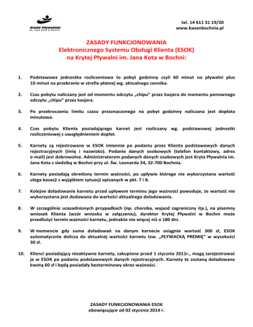 tel. 14 611 31 19/20 www.basenbochnia.pl ZASADY FUNKCJONOWANIA Elektronicznego Systemu Obsługi Klienta (ESOK) na Krytej Pływalni im. Jana Kota w Bochni: 1. Podstawowa jednostka rozliczeniowa to pobyt godzinny czyli 60 minut na pływalni plus 10 minut na przebranie w strefie płatnej wg. aktualnego cennika. 2. Czas pobytu naliczany jest od momentu odczytu „chipu” przez kasjera do momentu ponownego odczytu „chipu” przez kasjera. 3. Po przekroczeniu limitu czasu przeznaczonego na pobyt godzinny naliczana jest dopłata minutowa. 4. Czas pobytu Klienta posiadającego karnet jest rozliczany wg. podstawowej jednostki rozliczeniowej z uwzględnieniem dopłat. 5. Karnety są rejestrowane w ESOK imiennie po podaniu przez Klienta podstawowych danych rejestracyjnych (imię i nazwisko). Podanie danych osobowych (telefon kontaktowy, adres e-mail) jest dobrowolne. Administratorem podanych danych osobowych jest Kryta Pływalnia im. Jana Kota z siedzibą w Bochni przy ul. Św. Leonarda 34, 32-700 Bochnia. 6. Karnety posiadają określony termin ważności, po upływie którego nie wykorzystana wartość ulega kasacji z wyjątkiem sytuacji opisanych w pkt. 7 i 8. 7. Kolejne doładowanie karnetu przed upływem terminu jego ważności powoduje, że wartość nie wykorzystana jest dodawana do wartości aktualnego doładowania. 8. W szczególnie uzasadnionych przypadkach (np. choroba, wyjazd zagraniczny itp.), na pisemny wniosek Klienta (wzór wniosku w załączeniu), dyrektor Krytej Pływalni w Bochni może przedłużyć termin ważności karnetu, jednakże nie więcej niż o 180 dni. 9. W momencie gdy suma doładowań na danym karnecie osiągnie wartość 300 zł, ESOK automatycznie dolicza do aktualnej wartości karnetu tzw. „PŁYWACKĄ PREMIĘ” w wysokości 30 zł. 10. Klienci posiadający nieaktywne karnety, zakupione przed 1 stycznia 2011r., mogą zarejestrować je w ESOK po podaniu podstawowych danych rejestracyjnych. Karnety te zostaną doładowane kwotą 60 zł i będą posiadały bezterminowy okres ważności. ZASADY FUNKCJONOWANIA ESOK obowiązujące od 02 stycznia 2014 r.