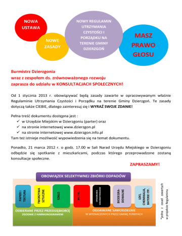 NOWA USTAWA NOWE ZASADY NOWY REGULAMIN UTRZYMANIA CZYSTOŚCI I PORZĄDKU NA TERENIE GMINY DZIERZGOŃ MASZ PRAWO GŁOSU Burmistrz Dzierzgonia wraz z zespołem ds. zrównoważonego rozwoju zaprasza do udziału w KONSULTACJACH SPOŁECZNYCH! Od 1 stycznia 2013 r. obowiązywać będą zasady zawarte w opracowywanym właśnie Regulaminie Utrzymania Czystości i Porządku na terenie Gminy Dzierzgoń. Te zasady dotyczą także CIEBIE, dlatego zainteresuj się i WYRAŹ SWOJE ZDANIE! Pełna treść dokumentu dostępna jest : w Urzędzie Miejskim w Dzierzgoniu (parter) oraz na stronie internetowej www.dzierzgon.pl na stronie internetowej www.dzierzgon.info.pl Tam też istnieje możliwość wypowiedzenia się na temat dokumentu. Ponadto, 21 marca 2012 r. o godz. 17.00 w Sali Narad Urzędu Miejskiego w Dzierzgoniu odbędzie się spotkanie z mieszkańcami, podczas którego przeprowadzone zostaną konsultacje społeczne. ZAPRASZAMY! ODBIERANE PRZEZ PRZEDSIĘBIORCĘ ODDAWANE SAMODZIELNIE ZGODNIE Z HARMONOGRAMEM W WYZNACZONYCH PRZEZ GMINĘ PUNKTACH *jedna z zasad zawartych w projekcie Regulaminu LEKI, CHEMIKALIA, BATERIE ITP. BIODEGRADOWALNE OPAKOWANIA WIELOMATERIAŁOWE METAL SZKŁO TWORZYWA SZTUCZNE PAPIER I TEKTURA OBOWIĄZEK SELEKTYWNEJ ZBIÓRKI ODPADÓW