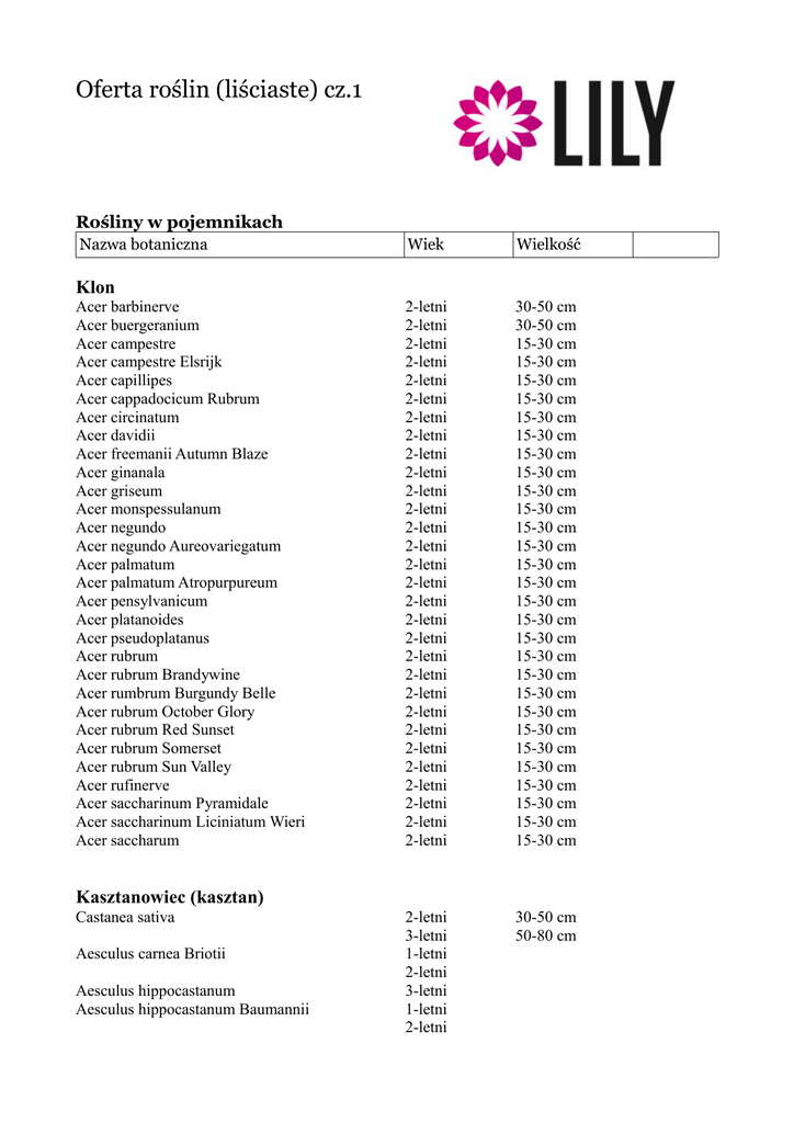 Oferta roślin (liściaste) cz.1 Rośliny w pojemnikach Nazwa botaniczna Wiek Wielkość 2-letni 2-letni 2-letni 2-letni 2-letni 2-letni 2-letni 2-letni 2-letni 2-letni 2-letni 2-letni 2-letni 2-letni 2-letni 2-letni 2-letni 2-letni 2-letni 2-letni 2-letni 2-letni 2-letni 2-letni 2-letni 2-letni 2-letni 2-letni 2-letni 2-letni 30-50 cm 30-50 cm 15-30 cm 15-30 cm 15-30 cm 15-30 cm 15-30 cm 15-30 cm 15-30 cm 15-30 cm 15-30 cm 15-30 cm 15-30 cm 15-30 cm 15-30 cm 15-30 cm 15-30 cm 15-30 cm 15-30 cm 15-30 cm 15-30 cm 15-30 cm 15-30 cm 15-30 cm 15-30 cm 15-30 cm 15-30 cm 15-30 cm 15-30 cm 15-30 cm 2-letni 3-letni 1-letni 2-letni 3-letni 1-letni 2-letni 30-50 cm 50-80 cm Klon Acer barbinerve Acer buergeranium Acer campestre Acer campestre Elsrijk Acer capillipes Acer cappadocicum Rubrum Acer circinatum Acer davidii Acer freemanii Autumn Blaze Acer ginanala Acer griseum Acer monspessulanum Acer negundo Acer negundo Aureovariegatum Acer palmatum Acer palmatum Atropurpureum Acer pensylvanicum Acer platanoides Acer pseudoplatanus Acer rubrum Acer rubrum Brandywine Acer rumbrum Burgundy Belle Acer rubrum October Glory Acer rubrum Red Sunset Acer rubrum Somerset Acer rubrum Sun Valley Acer rufinerve Acer saccharinum Pyramidale Acer saccharinum Liciniatum Wieri Acer saccharum Kasztanowiec (kasztan) Castanea sativa Aesculus carnea Briotii Aesculus hippocastanum Aesculus hippocastanum Baumannii Aesculus hippocastanum Pyramidale 1-letni 2-letni Berberys Berberis buxifolia Nana Berberis candidula Berberis frikartii Amstelveen Berberis frikartii Verrucandii Berberis hookeri Berberis Indian summer Berberis julianae Berberis julianae Dart's Superb Berberis Jytte Berberis media Parkjuweel Berberis media Red Jewel Berberis ottawensis Superba Berberis Stenophylla Berberis thunbergii Berberis thunbergii Atropurpurea Berberis thunbergii Atropurpurea Nana Berberis thunbergii Aurea Berberis thunbergii Bagatelle Berberis thunbergii Concord Berberis thunbergii Coronita Berberis thunbergii Dart's Red Lady Berberis thunbergii Erecta Berberis thunbergii Golden Nugget Berberis thunbergii Golden Ring Berberis thunbergii Golden Torch Berberis thunbergii Green Carpet Berberis thunbergii Harlequin Berberis thunbergii Kobold Berberis thunbergii Powwow Berberis thunbergii Red Carpet Berberis thunbergii Red Chief Berberis thunbergii Red Pillar Berberis thunbergii Red Rocket Berberis thunbergii Rose Glow 2-letni 3-letni 3-letni 3-letni 3-letni 2-letni 3-letni 3-letni 3-letni 2-letni 3-letni 2-letni 3-letni 2-letni 2-letni 2-letni 2-letni 2-letni 3-letni 2-letni 3-letni 2-letni 3-letni 2-letni 2-letni 2-letni 2-letni 2-letni 3-letni 2-letni 2-letni 3-letni 2-letni 3-letni 2-letni 3-letni 2-letni 3-letni 2-letni 3-letni 2-letni 3-letni 2-letni 2-letni 2-letni 2-letni 15-30 cm 15-30 cm 15-30 cm 15-30 cm 15-30 cm 15-30 cm 15-30 cm 15-30 cm 15-30 cm 12-25 cm 15-30 cm 15-30 cm 15-30 cm 15-30 cm 15-30 cm 15-30 cm 15-30 cm 15-30 cm 15-30 cm 15-30 cm 15-30 cm 15-30 cm 15-30 cm 15-30 cm 15-30 cm 15-30 cm 15-30 cm 15-30 cm 15-30 cm 15-30 cm 15-30 cm 15-30 cm 15-30 cm 15-30 cm 15-30 cm Berberis thunbergii Sunsation Berberis thunbergii verruculosa 3-letni 2-letni 3-letni 3-letni 15-30 cm 15-30 cm Brzoza Betula ermanii Betula humilis Betula maximowicziana Betula nigra Betula papyrifera Betula pendula 2-letni 2-letni 2-letni 2-letni 2-letni 2-letni 2-letni 50-80 cm 50-80 cm 50-80 cm 50-80 cm 50-80 cm 30-50 cm 50-80 cm Budleja Buddleja alternifolia Buddleja davidii African Queen Buddleja davidii Bicolor Buddleja davidii Black Knight Buddleja davidii Cardinal Buddleja davidii Dart's Ornamental White Buddleja davidii Dart's Papillon Blue Buddleja davidii Ellens Blue Buddleja davidii Empire Blue Buddleja davidii Fascinating Buddleja davidii Ile de France Buddleja davidii Nahno Blue Buddleja davidii Nanho Purple Buddleja davidii Nanho White Buddleja davidii Peace Buddleja davidii Pink Delight Buddleja davidii Purple Prince Buddleja davidii Royal Red Buddleja davidii Santana 2-letni 1-letni 1-letni 1-letni 1-letni 1-letni 1-letni 1-letni 1-letni 1-letni 1-letni 1-letni 1-letni 1-letni 1-letni 1-letni 1-letni 1-letni 1-letni Bukszpan Buxus microphylla Herrenhausen Buxus sempervirens arborescens Buxus sempervirens Blauer Hein 3-letni 3-letni 3-letni 10-15 cm 10-15 cm 10-15 cm 2-letni 2-letni 1-letni 2-letni 2-letni 1-letni 2-letni 1-letni 30-50 cm 50-80 cm 30-50 cm 50-80 cm 80-120 cm 30-50 cm 50-80 cm 30-50 cm Grab Carpinus betulus Carpinus betulus Fastigiata Carpinus betulus Fastigiata Monument Carpinus betulus Frans Fontaine Carpinus betulus Lucas 2-letni 2-letni 1-letni 2-letni 50-80 cm 80-120 cm 30-50 cm 50-80 cm 2-letni 2-letni 2-letni 2-letni 1-letni 2-letni 2-letni 2-letni 2-letni 2-letni 2-letni 2-letni 2-letni 1-letni 2-letni 1-letni 1-letni 1-letni 1-letni 1-letni 1-letni 1-letni 2-letni 2-letni 2-letni 2-letni 2-letni 2-letni 2-letni 2-letni 30-50 cm 50-80 cm 30-50 cm 30-50 cm 30-50 cm 30-50 cm 30-50 cm 30-50 cm 30-50 cm 30-50 cm 30-50 cm 30-50 cm 30-50 cm 30-50 cm 30-50 cm 30-50 cm 30-50 cm 30-50 cm 30-50 cm 30-50 cm 30-50 cm 30-50 cm 30-50 cm 50-80 cm 30-50 cm 30-50 cm 30-50 cm 30-50 cm 30-50 cm 30-50 cm 1-letni 1-letni 1-letni 1-letni 1-letni 1-letni 2-letni 2-letni 1-letni 30-50 cm 50-80 cm 50-80 cm 50-80 cm 50-80 cm 50-80 cm 30-50 cm 50-80 cm 50-80 cm Dereń Cornus alba Cornus alba Aurea Cornus alba Elegantissima Cornus alba Kesselringii Cornus alba Siberian Pearls Cornus alba Sibirica Cornus alba Sibirica Variegata Cornus alba Späthii Cornus alternfiolia Cornus controversa Cornus florida Cornus kousa Cornus kousa China Girl Cornus kousa chinesis Cornus kousa Claudia Cornus kousa Kreuzdame Cornus kousa Milky Way Cornus kousa Satomi Cornus kousa Schmetterling Cornus kousa White Fountain Cornus kousa Wieting's Select Cornus mas Cornus officinalis Cornus sanguinea Cornus sanguinea Midwinter Fire Cornus sericea Budds Yellow Cornus sericea Flaviramea Cornus sericea White Gold Leszczyna Corylus avellana Contorta Corylus avellana Hallesche R