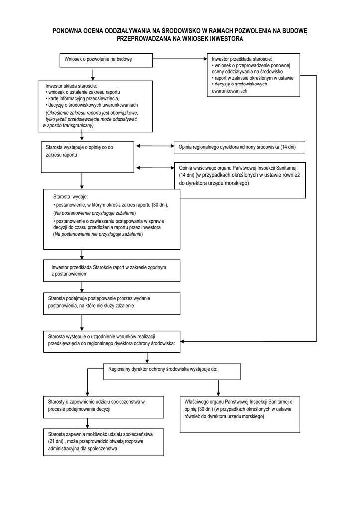 PONOWNA OCENA ODDZIAŁYWANIA NA ŚRODOWISKO W RAMACH POZWOLENIA NA BUDOWĘ PRZEPROWADZANA NA WNIOSEK INWESTORA Wniosek o pozwolenie na budowę Inwestor składa staroście: • wniosek o ustalenie zakresu raportu • kartę informacyjną przedsięwzięcia, • decyzję o środowiskowych uwarunkowaniach (Określenie zakresu raportu jest obowiązkowe, tylko jeżeli przedsięwzięcie może oddziaływać w sposób transgraniczny) Starosta występuje o opinię co do zakresu raportu Inwestor przedkłada staroście: • wniosek o przeprowadzenie ponownej oceny oddziaływania na środowisko • raport w zakresie określonym w ustawie • decyzję o środowiskowych uwarunkowaniach Opinia regionalnego dyrektora ochrony środowiska (14 dni) Opinia właściwego organu Państwowej Inspekcji Sanitarnej (14 dni) (w przypadkach określonych w ustawie również do dyrektora urzędu morskiego) Starosta wydaje: • postanowienie, w którym określa zakres raportu (30 dni), (Na postanowienie przysługuje zażalenie) • postanowienie o zawieszeniu postępowania w sprawie decyzji do czasu przedłożenia raportu przez inwestora (Na postanowienie nie przysługuje zażalenie) Inwestor przedkłada Staroście raport w zakresie zgodnym z postanowieniem Starosta podejmuje postępowanie poprzez wydanie postanowienia, na które nie służy zażalenie Starosta występuje o uzgodnienie warunków realizacji przedsięwzięcia do regionalnego dyrektora ochrony środowiska: Regionalny dyrektor ochrony środowiska występuje do: Starosty o zapewnienie udziału społeczeństwa w procesie podejmowania decyzji Starosta zapewnia możliwość udziału społeczeństwa (21 dni) , może przeprowadzić otwartą rozprawę administracyjną dla społeczeństwa Właściwego organu Państwowej Inspekcji Sanitarnej o opinię (30 dni) (w przypadkach określonych w ustawie również do dyrektora urzędu morskiego) Starosta przekazuje regionalnemu dyrektorowi ochrony środowiska zgłoszone przez społeczeństwo uwagi i wnioski oraz protokół z rozprawy, jeśli została przeprowadzona Regionalny dyrektor ochrony środowiska analizuje zgromadzony materiał i wydaje postanowienie w sprawie uzgodnienia warunków realizacji przedsięwzięcia (45 dni) (Na postanowienie nie przysługuje zażalenie) Starosta analizuje zgromadzony materiał i wydaje decyzję o pozwoleniu na budowę (Od decyzji można się odwołać) Starosta podaje do publicznej wiadomości informację o wydaniu decyzji i o możliwościach zapoznania się z jej treścią oraz z dokumentacją sprawy