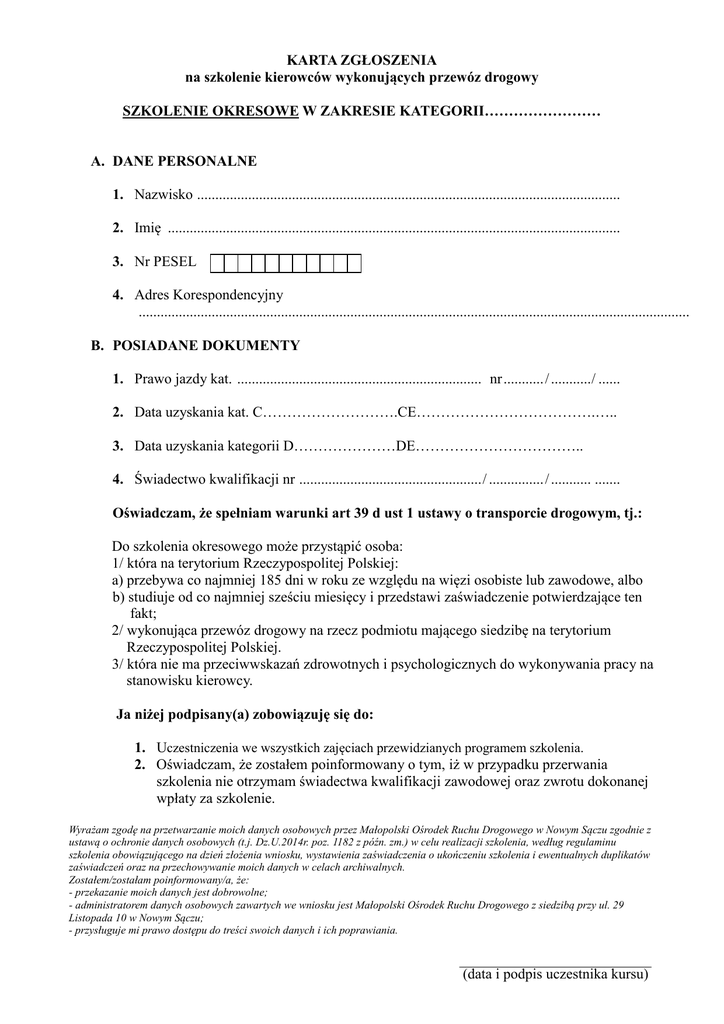 KARTA ZGŁOSZENIA na szkolenie kierowców wykonujących przewóz drogowy SZKOLENIE OKRESOWE W ZAKRESIE KATEGORII…………………… A. DANE PERSONALNE 1. Nazwisko .................................................................................................................... 2. Imię ............................................................................................................................ 3. Nr PESEL 4. Adres Korespondencyjny ....................................................................................................................................................... B. POSIADANE DOKUMENTY 1. Prawo jazdy kat. ................................................................... nr ........... / ........... / ...... 2. Data uzyskania kat. C……………………….CE……………………………….….. 3. Data uzyskania kategorii D…………………DE…………………………….. 4. Świadectwo kwalifikacji nr .................................................. / ............... / ........... ....... Oświadczam, że spełniam warunki art 39 d ust 1 ustawy o transporcie drogowym, tj.: Do szkolenia okresowego może przystąpić osoba: 1/ która na terytorium Rzeczypospolitej Polskiej: a) przebywa co najmniej 185 dni w roku ze względu na więzi osobiste lub zawodowe, albo b) studiuje od co najmniej sześciu miesięcy i przedstawi zaświadczenie potwierdzające ten fakt; 2/ wykonująca przewóz drogowy na rzecz podmiotu mającego siedzibę na terytorium Rzeczypospolitej Polskiej. 3/ która nie ma przeciwwskazań zdrowotnych i psychologicznych do wykonywania pracy na stanowisku kierowcy. Ja niżej podpisany(a) zobowiązuję się do: 1. Uczestniczenia we wszystkich zajęciach przewidzianych programem szkolenia. 2. Oświadczam, że zostałem poinformowany o tym, iż w przypadku przerwania szkolenia nie otrzymam świadectwa kwalifikacji zawodowej oraz zwrotu dokonanej wpłaty za szkolenie. Wyrażam zgodę na przetwarzanie moich danych osobowych przez Małopolski Ośrodek Ruchu Drogowego w Nowym Sączu zgodnie z ustawą o ochronie danych osobowych (t.j. Dz.U.2014r. poz. 1182 z późn. zm.) w celu realizacji szkolenia, według regulaminu szkolenia obowiązującego na dzień złożenia wniosku, wystawienia zaświadczenia o ukończeniu szkolenia i ewentualnych duplikatów zaświadczeń oraz na przechowywanie moich danych w celach archiwalnych. Zostałem/zostałam poinformowany/a, że: - przekazanie moich danych jest dobrowolne; - administratorem danych osobowych zawartych we wniosku jest Małopolski Ośrodek Ruchu Drogowego z siedzibą przy ul. 29 Listopada 10 w Nowym Sączu; - przysługuje mi prawo dostępu do treści swoich danych i ich poprawiania. (data i podpis uczestnika kursu)