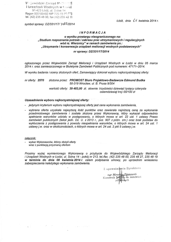 ogłoszonegoprzez WojewÓdzki Zarząd Melioracji i Urządzeń Wodnych w Łodzi w dniu 05 marca