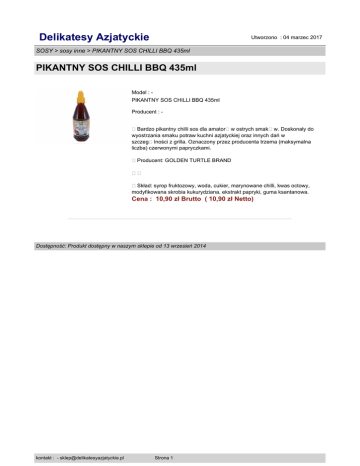 Delikatesy Azjatyckie Utworzono : 04 marzec 2017 SOSY > sosy inne > PIKANTNY SOS CHILLI BBQ 435ml PIKANTNY SOS CHILLI BBQ 435ml Model : PIKANTNY SOS CHILLI BBQ 435ml Producent : Bardzo pikantny chilli sos dla amator�w ostrych smak�w. Doskonały do wyostrzania smaku potraw kuchni azjatyckiej oraz innych dań w szczeg�lności z grilla. Oznaczony przez producenta trzema (maksymalna liczba) czerwonymi papryczkami. Producent: GOLDEN TURTLE BRAND � Skład: syrop fruktozowy, woda, cukier, marynowane chilli, kwas octowy, modyfikowana skrobia kukurydziana, ekstrakt papryki, guma ksantanowa. Cena : 10,90 zł Brutto ( 10,90 zł Netto) Dostępność: Produkt dostępny w naszym sklepie od 13 wrzesień 2014 kontakt : - [email protected] Strona 1