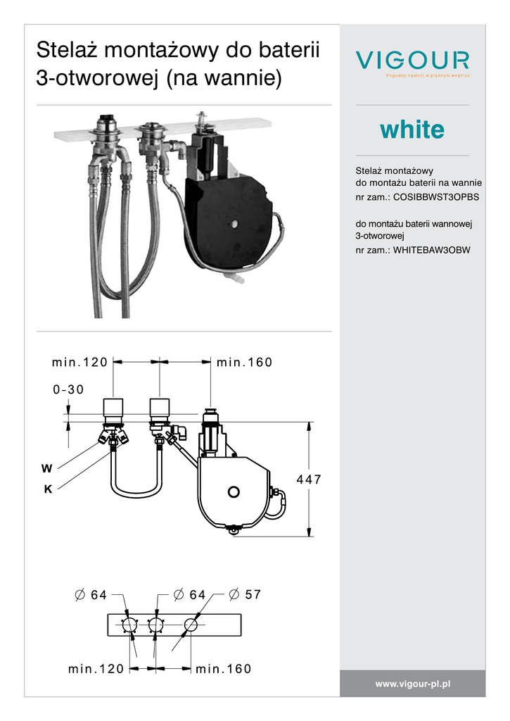 Stelaż montażowy do baterii 3-otworowej (na wannie) white Stelaż montażowy do montażu baterii na wannie nr zam.: COSIBBWST3OPBS do montażu baterii wannowej 3-otworowej nr zam.: WHITEBAW3OBW www.vigour-pl.pl
