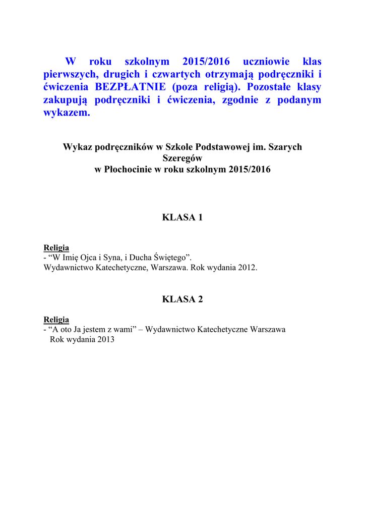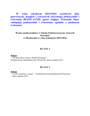 W roku szkolnym 2015/2016 uczniowie klas pierwszych, drugich i czwartych otrzymają podręczniki i ćwiczenia BEZPŁATNIE (poza religią). Pozostałe klasy zakupują podręczniki i ćwiczenia, zgodnie z podanym wykazem. Wykaz podręczników w Szkole Podstawowej im. Szarych Szeregów w Płochocinie w roku szkolnym 2015/2016 KLASA 1 Religia - “W Imię Ojca i Syna, i Ducha Świętego”. Wydawnictwo Katechetyczne, Warszawa. Rok wydania 2012. KLASA 2 Religia - “A oto Ja jestem z wami” – Wydawnictwo Katechetyczne Warszawa Rok wydania 2013 KLASA 3 Podręczniki - Wydawnictwo Nowa Era Nowe Już w szkole . Szkoła na miarę. Klasa 3. 1. Podręcznik do edukacji wczesnoszkolnej w klasie 3, część 1 i 2 – Małgorzata Ewa Piotrowska, Maria Alicja Szymańska Rok wydania 2014 2. Ćwiczenia do edukacji wczesnoszkolnej w klasie 3, część 1, 2, 3, 4 Małgorzata Ewa Piotrowska, Maria Alicja Szymańska, Maria Szreder, Barbara Stępień, E.Hryszkiewicz, M.Jasny, E.Sidorowicz-Adamska, W.Walat, W.Lib 3. Matematyka, klasa 3, część 1, 2, 3, 4 – Krystyna Bielenica, Maria Bura, Małgorzata Kwil, Bogusława Lankiewicz. 5. Liczę coraz lepiej – zeszyt D K. Bielenica, M.Kwil, B.Lankiewicz 6. Piszę coraz lepiej – zeszyt D Bożena Kotulska Język angielski - NEW HAPPY HOUSE 3 – podręcznik dla szkoły podstawowej - NEW HAPPY HOUSE 3 – zeszyt ćwiczeń Stella Maidment, Lorena Roberts – Wydawnictwo Oxford Religia - “Kto spożywa moje Ciało, ma życie” – Wydawnictwo Katechetyczne Warszawa. Rok wydania 2014 Informatyka - Informatyka Europejczyka. Nauka i zabawa z komputerem w edukacji wczesnoszkolnej. Poziom 3 (wydanie II). Rok wydania 2012 Autorzy: Danuta Kiałka, Katarzyna Kiałka – Wydawnictwo Helion Edukacja KLASA 4 9. Religia - “Jestem Chrześcijaninem” – Wydawnictwo Katechetyczne Warszawa. Rok wydania 2013 KLASA 5 1. Język polski - Agnieszka Łuczak, Anna Murdzek – Język polski 5. Między nami. Podręcznik (nowa wersja) Gdańskie Wydawnictwo Oświatowe. Rok wydania 2015 - Agnieszka Łuczak, Anna Murdzek – Język polski 5. Między nami. Zeszyt ćwiczeń część 1 i 2. (nowa wersja) Gdańskie Wydawnictwo Oświatowe. 2. Historia - Grzegorz Wojciechowski „Wczoraj i dziś” – podręcznik do historii i społeczeństwa dla klasay 5 Wyd. Nowa Era - Tomasz Maćkowski - Zeszyt ucznia, klasa 5 – „Wczoraj i dziś ” - Wyd. Nowa Era 3. Matematyka - Podręcznik - Matematyka 5. Matematyka z plusem - M. Dobrowolska, M. Karpiński, P. Zarzycki, M. Jucewicz . Gdańskie Wydawnictwo Oświatowe. Rok wydania 2013 - Matematyka 5. Zeszyt ćwiczeń. Liczby całkowite i ułamki. Część 1 i 2, Geometria M.Dobrowolska, P.Zarzycki, A.Mysior, Z.Bolałek, S.Wojtan. Gdańskie Wydawnictwo Oświatowe. Rok wydania 2013 - K. Zarzycka, P. Zarzycki – Matematyka 5. Zbiór zadań. Gdańskie Wydawnictwo Oświatowe 4. Język angielski - Steps in English 2 - podręcznik – M.Szpotowicz, T.Falla, T.Palczak, P.A.Davies - Steps in English 2 – ćwiczenia - Sylvia Wheeldon, Paul Shipton Wydawnictwo Oxford University Press. Rok wydania 2011 5. Muzyka - K.Jakóbczak-Drążek, U.Smoczyńska, A.Sołtysik – „Klucz do muzyki” podręcznik dla klasy 5 szkoły podstawowej - zeszyt ćwiczeń do klasy 5 „Klucz do muzyki” 6. Plastyka - podręcznik zakupiony w klasie IV - Barbara Neubart – zeszyt ćwiczeń Plastyka 5, Wyd. WSiP rok wyd. 2012 7. Przyroda - Ewa Gromek, Ewa Kłos, Wawrzyniec Kofta, Ewa Laskowska, Andrzej Melson – Przyrodo, witaj! – podręcznik, klasa 5, Wyd. WSiP. Rok wydania 2013 - Ewa Gromek, Ewa Kłos,Wawrzyniec Kofta, Ewa Laskowska, Andrzej Melson – Przyrodo, witaj! – zeszyt ćwiczeń, klasa 5, Wyd. WSiP. Rok wydania 2013 - Ewa Gromek, Ewa Kłos,Wawrzyniec Kofta, Ewa Laskowska, Andrzej Melson – zeszyt „zajęcia warsztatowe” dla szkoły podstawowej „Przyrodo, witaj! 5. Wyd. WSiP. Rok wydania 2013 Atlas do przyrody (4-6) Wyd. WSiP (kontynuacja z klasy 4) 8. Zajęcia techniczne - Lech Łabecki, Marta Łabecka – Jak to działa?. Podręcznik z ćwiczeniami do zajęć technicznych dla klas 4-6 .Wyd. Nowa Era - Lech Łabecki, Marta Łabecka – Jak to działa? Rysunek techniczny. Zajęcia techniczne dla klas 4-6. Wyd. Nowa Era (kontynuacja z kl.IV) 9. Religia - “Wierzę w Jednego Boga”- Wydawnictwo Katechetyczne Warszawa. Rok wydania 2014. 10. Zajęcia komputerowe - Danuta Kiałka, Katarzyna Kiałka, Informatyka Europejczyka. Podręcznik do zajęć komputerowych dla szkoły podstawowej, kl. 5. Edycja: Windows 7… Wydawnictwo „Helion Edukacja”. Rok wydania 2013 KLASA 6 1. Język polski - Agnieszka Łuczak, Anna Murdzek – Między nami. Język polski 6 Podręcznik + Multipodręcznik Gdańskie Wydawnictwo Oświatowe. Rok wydania (dostępne w księgarni) - Agnieszka Łuczak, Anna Murdzek – „Język polski 6. Między nami. Zeszyt ćwiczeń”, Gdańskie Wydawnictwo Oświatowe cz. 1 i cz. 2. Rok wydania 2014 lub 2015 - Beata Fiszer, Małgorzata Hajduk „Język polski. Kalendarz szóstoklasisty” Gdańskie Wydawnictwo Oświatowe, rok wydania 2014 lub 2015 2. Historia - Grzegorz Wojciechowski „Wczoraj i dziś” – Podręcznik do historii i społeczeństwa dla klasy 6. Wyd. Nowa Era - Tomasz Maćkowski - Zeszyt ucznia – „Wczoraj i dziś ”cz. 1 i 2 - Wyd. Nowa Era 3. Matematyka - Matematyka 6. Matematyka z plusem – M.Dobrowolska, M.Jucewicz, M.Karpiński, P.Zarzycki.- Gdańskie Wydawnictwo Oświatowe. Rok wydania 2014 - Matematyka 6. Zeszyt ćwiczeń. Liczby całkowite i ułamki. Część 1 i 2, Geometria M.Dobrowolska, P.Zarzycki, M.Jucewicz, Z.Bolałek, A.Demby, A.Sokołowska . Gdańskie Wydawnictwo Oświatowe. Rok wydania 2014 - Matematyka 6.Zbiór Zadań – K.Zarzycka, P.Zarzycki – Gdańskie Wydawnictwo Oświatowe - Matematyka. Kalendarz szóstoklasisty. Nowa wersja. Praca zbiorowa. Gdańskie Wydawnictwo Oświatowe. 4. Język angielski - Steps in English 3 - podręcznik – T.Falla, P.A.Davies Sylvia Wheeldon, Paul Shipton - Steps in English 3 