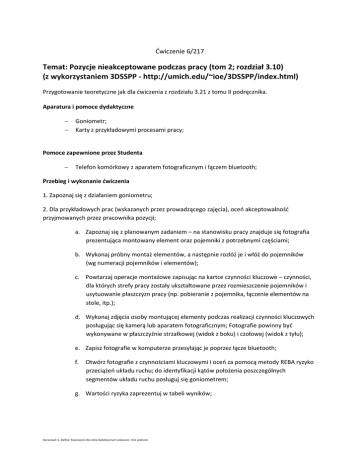 Ćwiczenie 6/217 Temat: Pozycje nieakceptowane podczas pracy (tom 2; rozdział 3.10) (z wykorzystaniem 3DSSPP - http://umich.edu/~ioe/3DSSPP/index.html) Przygotowanie teoretyczne jak dla ćwiczenia z rozdziału 3.21 z tomu II podręcznika. Aparatura i pomoce dydaktyczne Goniometr; Karty z przykładowymi procesami pracy; Pomoce zapewnione przez Studenta Telefon komórkowy z aparatem fotograficznym i łączem bluetooth; Przebieg i wykonanie ćwiczenia 1. Zapoznaj się z działaniem goniometru; 2. Dla przykładowych prac (wskazanych przez prowadzącego zajęcia), oceń akceptowalność przyjmowanych przez pracownika pozycji; a. Zapoznaj się z planowanym zadaniem – na stanowisku pracy znajduje się fotografia prezentująca montowany element oraz pojemniki z potrzebnymi częściami; b. Wykonaj próbny montaż elementów, a następnie rozłóż je i włóż do pojemników (wg numeracji pojemników i elementów); c. Powtarzaj operacje montażowe zapisując na kartce czynności kluczowe – czynności, dla których strefy pracy zostały ukształtowane przez rozmieszczenie pojemników i usytuowanie płaszczyzn pracy (np. pobieranie z pojemnika, łączenie elementów na stole, itp.); d. Wykonaj zdjęcia osoby montującej elementy podczas realizacji czynności kluczowych posługując się kamerą lub aparatem fotograficznym; Fotografie powinny być wykonywane w płaszczyźnie strzałkowej (widok z boku) i czołowej (widok z tyłu); e. Zapisz fotografie w komputerze przesyłając je poprzez łącze bluetooth; f. Otwórz fotografie z czynnościami kluczowymi i oceń za pomocą metody REBA ryzyko przeciążeń układu ruchu; do identyfikacji kątów położenia poszczególnych segmentów układu ruchu posługuj się goniometrem; g. Wartości ryzyka zaprezentuj w tabeli wyników; Opracował: G. Dahlke; Kopiowanie dla celów dydaktycznych wskazane i mile widziane h. Wybierz jedną czynność kluczową o największej wartości ryzyka i dokonaj jej oceny za pomocą programu 3DSSPP – instrukcje posługiwania się programem przekaże osoba prowadząca zajęcia; Zapoznaj się z aplikacją 3DSSPP dostępną w komputerze na stanowisku wskazanym przez prowadzącego zajęcia; Odwzoruj pozycję osoby badanej w programie 3DSSPP; i. Kąty segmentów układu ruchu wprowadź w stopniach na podstawie pomiaru goniometrem; ii. Pamiętaj o określeniu punktów podparcia (pozycja stojąca lub siedząca (z oparciem lub bez)); iii. Zadaj siły działające na ręce (oszacuj ich wartość i wskaż kierunek); iv. Zapisz wartości sił i momentów sił otrzymane w raporcie; v. Oceń ich wartości wg zaleceń programu 3DSSPP; Zapisz wartości sił i momentów sił działających na krążki międzykręgowe kręgosłupa oraz inne segmenty układu ruchu. 3. Określ przyczyny przyjmowanych nieakceptowanych pozycji; 4. Wypisz w punktach koncepcje zmian prewencyjnych zastosowanych na stanowisku; Zaproponuj zmiany ustawień stołu i zapisz parametry ustawień na załączonej „Karcie zapisu działań korekcyjnych”. 5. Zapisz wnioski i uwagi. Horst W. M., Horst N., Ergonomia z elementami bezpieczeństwa i ochrony w pracy. Wprowadzenie, Wydawnictwo Politechniki Poznańskiej, 2011 Horst W. M., Horst N., Ergonomia z elementami bezpieczeństwa i ochrony zdrowia w pracy. Zasady i wymagania związane z indywidualnymi cechami człowieka, Wydawnictwo Politechniki Poznańskiej, 2011 ISO 11226 Ergonomics - Evaluation of static working postures PN-EN 1005+A1 Bezpieczeństwo maszyn - Możliwości fizyczne człowieka: Część 4: Ocena pozycji pracy i ruchów w relacji do maszyny (2009 r.); Część 5: Ocena ryzyka dotycząca czynności wykonywanych z dużą częstością powtórzeń (2007 r.) Opracował: G. Dahlke; Kopiowanie dla celów dydaktycznych wskazane i mile widziane Stół montażowy do badań pozycji przy pracy Uwaga! Zmiany ustawienia stołu można dokonywać tylko pod nadzorem osoby prowadzącej (jeśli uzna to za konieczne) oraz w rękawicach ochronnych. Zmian ustawień mogą dokonywać wyłącznie jednocześnie trzy osoby. Należy zachowywać szczególną ostrożność. Opracował: G. Dahlke; Kopiowanie dla celów dydaktycznych wskazane i mile widziane Karta zapisu działań korekcyjnych Wpisz proponowane wymiary ustawień stołu w kratkach nad liniami wymiarowymi (podaj wartości w mm) A – wysokość położenia półki III; D - odległość pozioma półki III B – wysokość położenia półki II; E – Odległość pozioma półki II C – wysokość położenia półki I; Opracował: G. Dahlke; Kopiowanie dla celów dydaktycznych wskazane i mile widziane Karta wyników pomiarów - REBA Tabela 1. Zestawienie czynności wykonywanych na badanym stanowisku i oceny ryzyka wg metody REBA (źródło: na podstawie pomiarów zespołu badawczego) Lp. Nazwa czynności 1 2 Nazwa linii oraz cechy pracownika Student I Student II Student III Student IV 3 4 5 6 1. 2. 3. 4. 5. 6. 7. Ocena wg REBA 8. 9. 10. 11. 12. 13. 14. 15. 16. 17. 18. Tabela 2. Skala ocen wg metody REBA Skala ocen według REBA 1 Ryzyko pomijal ne 2 3 4 5 6 7 8 9 10 Ryzyko niskie Średnie ryzyko Duże ryzyko Zmiany mogą być konieczne Konieczne monitorowanie ryzyka Konieczne badania i wdrożenie zmian Opracował: G. Dahlke; Kopiowanie dla celów dydaktycznych wskazane i mile widziane Zmiany zalecane 11+ Bardzo duże ryzyko Konieczne natychmia stowe zmiany Tabela 3. Przyczyny poziomów wartości ryzyka ergonomicznego wg metody REBA dla badanego stanowiska oraz sposoby prewencji narażeń układu ruchu Lp. Nazwa czynności Wartość ryzyka według REBA 1 1. 2 3 Wartości cząstkowe z części A metody REBA Wartości cząstkowe z części B metody REBA 4 5 Przyczyny poziomu wartości ryzyka dla kluczowych czynności Sposoby prewencji dla kluczowych czynności 6 8 – – 2. – – 3. – – 4. – – Opracował: G. Dahlke; Kopiowanie dla celów dydaktycznych wskazane i mile widziane Opracował: G. Dahlke; Kopiowanie dla celów dydaktycznych wskazane i mile widzia