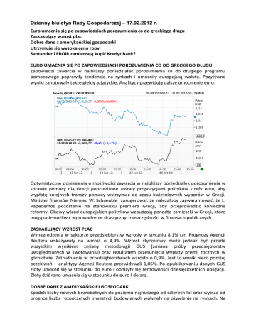 Dzienny biuletyn Rady Gospodarczej – 17.02.2012 r. Euro umacnia się po zapowiedziach porozumienia co do greckiego długu Zaskakujący wzrost płac Dobre dane z amerykaoskiej gospodarki Utrzymuje się wysoka cena ropy Santander i EBOiR zamierzają kupid Kredyt Bank? EURO UMACNIA SIĘ PO ZAPOWIEDZIACH POROZUMIENIA CO DO GRECKIEGO DŁUGU Zapowiedzi zawarcia w najbliższy poniedziałek porozumienia co do drugiego programu pomocowego poprawiły tendencje na rynkach i umocniły europejską walutę. Pozytywne wyniki zanotowały także giełdy azjatyckie. Analitycy przewidują dalsze umocnienie euro. Optymistyczne doniesienia o możliwości zawarcia w najbliższy poniedziałek porozumienia w sprawie pomocy dla Grecji poprzedzone zostały propozycjami polityków strefy euro, aby wypłatę kolejnych transzy pomocy wstrzymad do czasu kwietniowych wyborów w Grecji. Minister finansów Niemiec W. Schaeuble zasugerował, że należałoby zagwarantowad, że L. Papedemos pozostanie na stanowisku premiera Grecji, aby przeprowadzid konieczne reformy. Obawy wśród europejskich polityków wzbudzają ponadto zamieszki w Grecji, które mogą uniemożliwid wprowadzenie drastycznych oszczędności w finansach publicznych. ZASKAKUJĄCY WZROST PŁAC Wynagrodzenia w sektorze przedsiębiorstw wzrosły w styczniu 8,1% r/r. Prognozy Agencji Reutera wskazywały na wzrost o 4,9%. Wzrost styczniowy może jednak byd przede wszystkim wynikiem zmiany metodologii GUS (zmiana próby przedsiębiorstw uwzględnianych w kwotowaniu) oraz rezultatem przesunięcia wypłaty premii rocznych w górnictwie. Zatrudnienie w przedsiębiorstwach wzrosło o 0,9%. Jest to wynik nieco poniżej oczekiwao – analitycy Agencji Reutera przewidywali 1,05%. Po opublikowaniu danych GUS złoty umocnił się w stosunku do euro i obniżyły się rentowności dziesięcioletnich obligacji. Złoty dziś rano umacnia się w stosunku do euro I dolara. DOBRE DANE Z AMERYKAOSKIEJ GOSPODARKI Spadek liczby nowych bezrobotnych do poziomu najniższego od czterech lat oraz wyższa od prognoz liczba rozpoczętych inwestycji budowlanych wpłynęły na ożywienie na rynkach. Na Dzienny biuletyn Rady Gospodarczej – 17.02.2012 r. dzisiejszej sesji zyskiwały akcje notowane na azjatyckich giełdach. Analitycy przewidują, ze europejskie giełdy podążą dziś w ślad za rynkiem dalekowschodnim. Dow Jones Industrial zyskał na ostatniej sesji 0,96% a Nikkei -1,58% UTRZYMUJE SIĘ WYSOKA CENA ROPY Cena ropy Brent utrzymuje się powyżej 120 USD za baryłkę. Rynki obawiają się spadku podaży surowca w wyniku embarga nałożonego na Iran oraz spodziewają się wzrostu popytu, jeżeli dojdzie do poprawy sytuacji Grecji w wyniku porozumienia co do programu pomocowego. Na amerykaoskim rynku cena ropa wzrosła do rekordowego poziomu 102,41 USD za baryłkę. SANTANDER WRAZ EBOIR ZAMIERZAJĄ KUPID KREDYT BANK? Nieoficjalne źródła Reutersa informują, że jeden z największych hiszpaoskich kredytodawców zamierza wraz EBOiR kupid od belgijskich właścicieli Kredyt Bank. Wyniki finansowe Kredyt Banku miały pogorszyd się w związku z załamaniem na hiszpaoskim rynku nieruchomości. Przejmując Kredyt Bank, Santander stałby się trzecim bankiem w Polsce. Po ogłoszeniu planów Santandera akcje Kredyt Banku chwilowo podrożały o 6%, aby pod koniec sesji wrócid do poziomu zamknięcia z poprzedniego dnia. Dziś: Strefa euro: bilans płatniczy, Wielka Brytania: styczniowa sprzedaż detaliczna, USA: inflacja konsumencka, Niemcy: inflacja producencka, GUS: produkcja przemysłowa Dane: -0,69 Zmiana w por. z 10.02.12 (w %) -0,24 Zmiana w por. z 30.12.11 (w %) 8,15 -17,23 Zmiana w por. z 31.12.10 (w %) -15,48 6751,96 -0,09 0,88 14,47 -8,46 -2,35 CAC40 3393,25 0,09 0,60 7,39 -14,79 -10,82 DJI 12904,08 0,96 0,80 5,62 3,94 11,46 Nikkei 225* 9384,17 1,58 0,26 4,88 10,98 -4,40 0,81 9,04 -4,46 -8,26 -1,23 MSCI AC World 326,58 Zmiana w por. z 30.12.11 (w %) -6,05 Zmiana w por. z 30.06.11 (w %) 5,39 Zmiana w por. z 31.12.10 (w %) 6,15 Kurs zamknięcia 16.02.12 Zmiana dzienna (w %) WIG20 2319,33 DAX Indeks Zmiana w por. z 30.06.11 (w %) *17.02.12 Waluty Kurs 17.02.12 Zmiana w por. do zamknięcia 16.02 (w %) EUR-PLN 4,19 -0,36 Zmiana w por. z 10.02.12 (w %) -0,66 CHF-PLN 3,47 -0,49 -0,64 -5,46 6,53 9,63 USD-PLN 3,19 -0,71 -0,33 -7,37 16,36 7,86 EUR-USD 1,31 -0,02 -0,52 1,30 -9,41 -1,93 EUR-CHF 1,21 0,02 -0,18 -0,70 -1,01 -3,49 EUR-HUF 291 -0,11 -1,32 -7,60 9,28 4,64 CHF-USD 1,09 -0,06 -0,36 1,99 -8,50 1,62 Współpraca: Departament Analiz Strategicznych KPRM