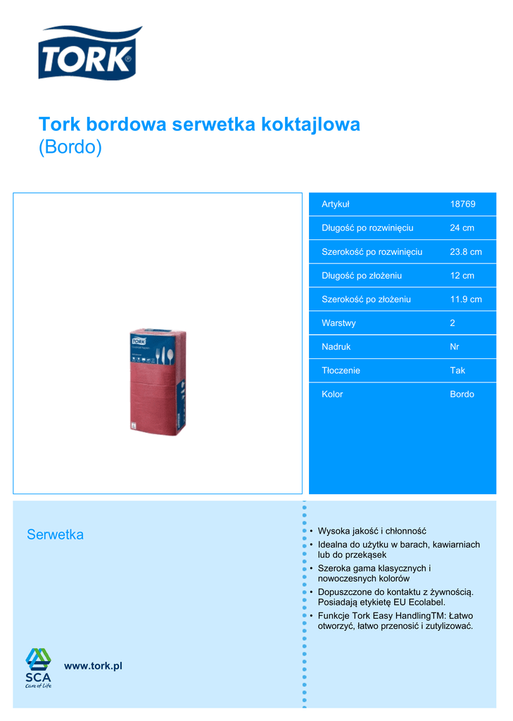 Tork bordowa serwetka koktajlowa (Bordo) Serwetka www.tork.pl Artykuł 18769 Długość po rozwinięciu 24 cm Szerokość po rozwinięciu 23.8 cm Długość po złożeniu 12 cm Szerokość po złożeniu 11.9 cm Warstwy 2 Nadruk Nr Tłoczenie Tak Kolor Bordo • Wysoka jakość i chłonność • Idealna do użytku w barach, kawiarniach lub do przekąsek • Szeroka gama klasycznych i nowoczesnych kolorów • Dopuszczone do kontaktu z żywnością. Posiadają etykietę EU Ecolabel. • Funkcje Tork Easy HandlingTM: Łatwo otworzyć, łatwo przenosić i zutylizować. Informacje o opakowaniu Opakowanie pojedyncze Opakowanie transportowe Paleta EAN 7322540058123 9011111187697 7322540135442 Sztuki 200 1200 93600 Opakowania pojedyncze - 6 468 Wysokość 120 mm 141 mm 1983 mm Szerokość 120 mm 258 mm 800 mm Długość 240 mm 608 mm 1200 mm Objętość 3.5 dm3 22.1 dm3 1.7 m3 Waga netto 377 g 2.3 kg 176.43 kg Waga brutto 382 g 2.7 kg 209.27 kg Rodzaj opakowania - Carton - Dopasowane serwetki i produkty do nakrycia stołu 18351 19004 Alternatywne produkty Certyfikaty produktu Kontakt SCA Hygiene Sp. z o.o. ul. Puławska 435A 02-801 Warszawa, Polska Tel.: +48 22 543 75 00 Faks: +48 22 543 75 01 Tork jest marką grupy SCA, Svenska Cellulosa Aktiebolaget. Grupa SCA oferuje artykuły higieniczne oraz produkty pochodzenia drzewnego w ponad 100 krajach. Więcej informacji można znaleźć pod adresem www.sca.com www.tork.pl 478156