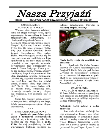 Nasza Przyjaźń 1935 XI - BIULETYN PARAFII ŚW. MIKOŁAJA Styczeń 2016 Nr 371 SZCZĘŚLIWEGO NOWEGO 2016 ROKU! Właśnie takie życzenia składamy sobie na progu Nowego Roku, zgoła zapominając, że szczęśliwy to inaczej błogosławiony. Zatrzymajmy się chwilę nad błogosławieństwem… Kto może błogosławić, uczynić szczęśliwym? Tylko ten, kto ma władzę. Tylko ten, kto umie stwarzać. Tylko Bóg (por. Romano Guardini, Znaki święte). Błogosławiąc, Bóg oddaje Siebie. Wszechmogący zwraca się ku nam, patrzy na nas z miłością, a z Jego ręki płynie do nas moc, która użyźnia, powoduje wzrost, naprawia, uzdrawia. Potwierdzenie tego odnajdujemy na kartach Pisma Świętego. Prorocy raz po raz dodają otuchy, prosząc, abyśmy trwali przy Bogu i nie przestawali Mu ufać. Zacytujmy proroka Sofoniasza: „Nie bój się, Syjonie! Niech nie słabną twe ręce! Pan, twój Bóg jest pośród ciebie, Mocarz, który daje zbawienie.” (So 3, 16). Izajasz dodaje: „Ci, co zaufali Panu, odzyskują siły, otrzymują skrzydła jak orły: biegną bez zmęczenia, bez znużenia idą”(Iz 40,31). Skoro tak, życzmy sobie, abyśmy w Nowym Roku zbliżyli się do Boga, źródła prawdziwego szczęścia i błogosławieństwa. *** SPOTKANIA OPŁATKOWE Spotkanie parafialne połączone z radosnym kolędowaniem odbędzie się w środę 6 stycznia. Rozpocznie się ono Mszą św. o godz. 15.00. Po niej przejdziemy do sali w piwnicach budynku plebanii na radosne kolędowanie. Uświetni je rodzinny zespół Jesteśmy. Niech każdy czuje się osobiście zaproszony. Spotkanie dla Klubu Seniora, Bractwa św. Anny i Parafialnego Koła Przyjaciół Radia Maryja pod hasłem „Otwarci na miłosierdzie” odbędzie się w czwartek 14 stycznia o godz. 16.00 w sali kolumnowej na wikarówce. Zaprasza opiekun, Ksiądz Prałat Antoni Sołtysik. *** ZAMYŚLENIA NAD BOŻYM MIŁOSIERDZIEM W Roku Jubileuszowym proponujemy cykl kazań ks. dra Edwarda Pasteczki, które mają nam przybliżyć tajemnicę Bożego Miłosierdzia. *** Zetknięcie Bożej miłości z nędzą człowieka Jest wiele określeń i definicji Bożego miłosierdzia. Jedna z nich mówi, że miłosierdzie to zetknięcie Bożej miłości z nędzą człowieka. Właśnie w noc Bożego Narodzenia „niebo łączy się z ziemią, sprawy ludzkie ze sprawami Bożymi” (por. hymn Exsul- tet), Bóg staje się człowiekiem. Miłość wcielona łączy się z zagubionym i zranionym przez grzech człowiekiem. Wziąć Dzieciątko Jezus na swoje ręce Św. Faustyna tak pisze o przeżyciu, które miała w noc Bożego Narodzenia. Kiedy przyszłam na Pasterkę, zaraz z początkiem mszy św. cała pogrążyłam się w głębokim skupieniu, w którym widziałam szopkę betlejemską, napełnioną wielką jasnością. Najświętsza Panna owijała w pieluszki Jezusa, pogrążona w wielkiej miłości, jednak św. Józef jeszcze spał; dopiero kiedy Matka Boża ułożyła Jezusa w żłóbku, wtenczas jasność Boża zbudziła Józefa, który też się modlił. Jednak po chwili zostałam sam na sam z małym Jezusem, który wyciągnął do mnie swe rączęta, a ja zrozumiałam, aby Go wziąć na ręce swoje. Jezus przytulił swą główkę do serca mojego, a głębokim swym spojrzeniem dał mi poznać, że dobrze mu przy sercu moim („Dzienniczek”, 1442). Dwa aspekty Bożego miłosierdzia Bóg dał nam swojego Syna przez ręce Maryi. Faustyna rozumiała, że we Wcieleniu Bóg objawia nam tajemnicę swojej miłości, która w zetknięciu z ludzką nędzą staje się objawieniem Bożego miłosierdzia. Liturgia Bożego Narodzenia ukazuje nam dwa aspekty Bożego miłosierdzia. Pierwszy - to przebaczająca i oczyszczająca miłość, która wyzwala nas z niewoli grzechu: „Jezus Chrystus, będąc niewidzialnym Bogiem, ukazał się naszym oczom w ludzkim ciele, zrodzony przed wiekami zaczął istnieć w czasie, aby podźwignąć wszystko, co grzech poniżył, odnowić całe stworzenie i zbłąkaną ludzkość doprowadzić do Królestwa niebieskiego” (2. Prefacja o Bożym Narodzeniu). Drugi aspekt Bożego Miłosierdzia to porywająca siła, która jednoczy nas z miłującym Bogiem: „Albowiem przez tajemnicę Wcielonego Słowa, zajaśniał oczom naszej duszy nowy blask Twojej światłości, abyśmy poznając Boga w widzialnej postaci, zostali przezeń porwani do umiłowania rzeczy niewidzialnych” (1. Prefacja o Bożym Narodzeniu). Jezus przyszedł wszystko nam darować Jezus przyszedł na ten świat, aby nas zbawić, aby wszystko nam darować. To jest największe objawienie Bożego miłosierdzia - Jezus wcielony, Syn Boga żywego. Miłosierdzie bardzo współbrzmi z czasownikiem „darować”. I znowu widzimy tu dwa aspekty, o których mówi nam liturgia. „Darować”- znaczy przebaczyć, oczyścić, uwolnić od winy, zgładzić grzechy. Bardzo ważny komponent Bożego miłosierdzia - ale nie jedyny. Al2 bowiem „darować” znaczy również obdarować. Miłosierdzie to nie tylko zgładzenie grzechów, ale także obsypanie łaskami, abyśmy „poznając Chrystusa w widzialnej postaci, zostali przezeń porwani do umiłowania rzeczy niewidzialnych”. Bóg wybawia z sytuacji bez wyjścia Dwa tysiące lat temu - w świecie cywilizacji grecko-rzymskiej - nie było miejsca na Boże Narodzenie. Maryja z Józefem znaleźli grotę poza miastem. Tam przyszedł na świat Zbawiciel, Jezus, którego imię oznacza: „Bóg zbawia”. Najpierw mocy tego imienia, w którym jest nasze wybawienie, doświadczył św. Józef. Przeżywał sytuację - po ludzku patrząc - bez wyjścia. Oto jego Oblubienica, której absolutnie ufał i wierzył w Jej czystość i niewinność, była w stanie błogosławionym. Nie potrafił znaleźć odpowiedzi na dręczące go pytania. Ale Bóg zmiłował się nad tym mężem sprawiedliwym i objawił mu prawdę o Dziecku, które się poczęło z Ducha Świętego. Bóg wybawił Józefa z sytuacji, która wydawała mu się nie do rozwiązania: poślubion