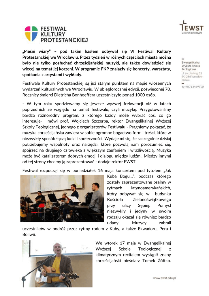 „Pieśni wiary” – pod takim hasłem odbywał się VI Festiwal Kultury Protestanckiej we Wrocławiu. Przez tydzień w różnych częściach miasta można było nie tylko posłuchać chrześcijańskiej muzyki, ale także dowiedzieć się więcej na temat jej korzeni. W programie FKP znalazły się koncerty, warsztaty, spotkania z artystami i wykłady. Festiwale Kultury Protestanckiej są już stałym punktem na mapie wiosennych wydarzeń kulturalnych we Wrocławiu. W ubiegłorocznej edycji, poświęconej 70. Rocznicy śmierci Dietricha Bonhoeffera uczestniczyło ponad 1000 osób. - W tym roku spodziewamy się jeszcze wyższej frekwencji niż w latach poprzednich ze względu na temat festiwalu, czyli muzykę. Przygotowaliśmy bardzo różnorodny program, z którego każdy może wybrać coś, co go interesuje- mówi prof. Wojciech Szczerba, rektor Ewangelikalnej Wyższej Szkoły Teologicznej, jednego z organizatorów Festiwalu - Pragniemy pokazać, że muzyka chrześcijańska zawiera w sobie ogromne bogactwo form i treści, które w niezwykły sposób łączą ludzi i społeczności. Wydaje mi się, że szczególnie dzisiaj potrzebujemy wspólnoty oraz narzędzi, które pozwolą nam porozumieć się, spojrzeć na drugiego człowieka z większym zaufaniem i wrażliwością. Muzyka może być katalizatorem dobrych emocji i dialogu między ludźmi. Między innymi od tej strony chcemy ją zaprezentować - dodaje rektor EWST. Festiwal rozpoczął się w poniedziałek 16 maja koncertem pod tytułem „Jak Kuba Bogu…”, podczas którego zostały zaprezentowane psalmy w rytmach latynoamerykańskich, który odbywał się w budynku Kościoła Zielonoświątkowego przy ulicy Sępiej. Pomysł niezwykły i jedyny w swoim rodzaju okazał się również bardzo udany. Muzycy zabrali uczestników w podróż przez rytmy rodem z Kuby, a także Ekwadoru, Peru i Boliwii. We wtorek 17 maja w Ewangelikalnej Wyższej Szkole Teologicznej z klimatycznym recitalem wystąpił znany chrześcijański pieśniarz Tomek Żółtko. Koncert był pełen wzruszeń, a artysta poprowadził słuchaczy przez świat poezji i muzyki. 18 maja miał miejsce wieczór refleksyjno-muzyczny „Pieśni nad pieśniami. Muzyka pamięcią wiary”. Podczas spotkania, które stanowiło również oficjalne otwarcie VI Festiwalu Kultury Protestanckiej, zaprezentowano tradycje muzyczne istniejące w czterech nurtach wyznaniowych, tj. w ewangelickim, prawosławnym, rzymskokatolickim oraz ewangelikalnym. Uczestnicy spotkania zostali wprowadzeni w tematykę spotkania przez pana Stanisława Rybarczyka – przewodniczącego Zarządu Fundacji „Dzielnica Wzajemnego Szacunku Czterech Wyznań”. Wieczór był interesujący również dla osób interesujących się historią i literaturą. W ewangelickiej parafii Opatrzności Bożej odbyło się zorganizowane przez Towarzystwo Bonhoefferowskie, we współpracy z Papieskim Wydziałem Teologicznym, spotkanie z autorem książki o Comeniusie, ks. Manfredem Richterem. W czwartek 19 maja o roli muzyki i sztuki nawet w najcięższych chwilach mówił Adam Rajczyba, podczas wykładu „Muzyka i sztuka wobec zagłady na przykładzie Alice Herz-Sommer”. Wieczorem tego dnia odbyło się ciekawe spotkanie z Natalią NiemenOtrembą i Mateuszem Otrembą (Mate. O). Goście czwartego dnia VI Festiwalu Kultury Protestanckiej mówili o znaczeniu twórczości chrześcijańskiego artysty w dobie popkultury, o swojej drodze do Boga i z Bogiem oraz oczywiście o muzyce. Przez dwa dni trwały warsztaty wokalne prowadzone w Centrum Ewangelickim przez Julietę Gonzalez, podczas których uczestnicy poznawali między innymi chorał gregoriański i chorał luterański z pierwszych lat Reformacji. Wydarzenie nawiązujące do muzyki protestanckiej nie mogłoby zaistnieć bez postaci Jana Sebastiana Bacha. To właśnie on był bohaterem wykładu dr Andrzeja Wątorskiego, zorganizowanego w piątek 20 maja, w ramach spotkań Międzykulturowej Akademii Trzeciego Wieku. Wieczorem tego samego dnia na premierowym koncercie nowej płyty Mate.O „Pieśni naszych Ojców” wspólnie bawiło się kilkaset osób. Nowe utwory spotkały się z ogromnym uznaniem uczestników, którzy w komentarzach w mediach społecznościowych zachęcają muzyków do rozwinięcia tego projektu. Również w piątkowy wieczór wystąpił zespół Be The Light Band. W ramach FKP nie zabrakło też charakterystycznego dla nurtu ewangelikalnego uwielbienia – koncert o takim charakterze odbył się w sobotę 21 maja, w I Kościele Chrześcijan Baptystów. Festiwal zakończył się w niedzielę 22 kwietnia, uroczystym nabożeństwem w parafii ewangelickiej Opatrzności Bożej we Wrocławiu. Oprawę muzyczną nabożeństwa zapewnił chór Capella Ecumenica pod dyr. Adama Rajczyby. Organizatorami Festiwalu są Parafia Ewangelicko-Luterańska Opatrzności Bożej we Wrocławiu, EWST Centrum Edukacyjne i Społeczność Chrześcijańska we Wrocławiu. Partnerzy: Miasto Wrocław, Kościół Chrześcijan Baptystów I zbór we Wrocławiu, Kościół Zielonoświątkowy Zbór Antiochia we Wrocławiu, Be the Light Band, Towarzystwo Bonhoefferowskie, Fundacja Dom Pokoju, Towarzystwo im. Edyty Stein, Papieski Wydział Teologiczny we Wrocławiu. Patronat honorowy nad całością VI FKP objęli JE ksiądz biskup Waldemar Pytel z Kościoła Ewangelicko-Augsburskiego oraz prezydent Wrocławia Rafał Dutkiewicz. Patronat medialny: Ekumenizm.pl, Miesięcznik Ewangelicki, Dekada Reformacji, Kosciol.pl. Szczegóły dotyczące Festiwalu oraz pełny jego program i informacje o poszczególnych wydarzeniach znajdują się na stronie festiwalowej http://www.fkp.wroclaw.pl.