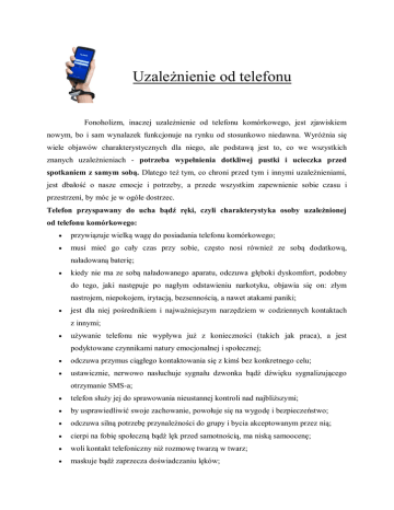 Uzależnienie od telefonu Fonoholizm, inaczej uzależnienie od telefonu komórkowego, jest zjawiskiem nowym, bo i sam wynalazek funkcjonuje na rynku od stosunkowo niedawna. Wyróżnia się wiele objawów charakterystycznych dla niego, ale podstawą jest to, co we wszystkich znanych uzależnieniach - potrzeba wypełnienia dotkliwej pustki i ucieczka przed spotkaniem z samym sobą. Dlatego też tym, co chroni przed tym i innymi uzależnieniami, jest dbałość o nasze emocje i potrzeby, a przede wszystkim zapewnienie sobie czasu i przestrzeni, by móc je w ogóle dostrzec. Telefon przyspawany do ucha bądź ręki, czyli charakterystyka osoby uzależnionej od telefonu komórkowego: przywiązuje wielką wagę do posiadania telefonu komórkowego; musi mieć go cały czas przy sobie, często nosi również ze sobą dodatkową, naładowaną baterię; kiedy nie ma ze sobą naładowanego aparatu, odczuwa głęboki dyskomfort, podobny do tego, jaki następuje po nagłym odstawieniu narkotyku, objawia się on: złym nastrojem, niepokojem, irytacją, bezsennością, a nawet atakami paniki; jest dla niej pośrednikiem i najważniejszym narzędziem w codziennych kontaktach z innymi; używanie telefonu nie wypływa już z konieczności (takich jak praca), a jest podyktowane czynnikami natury emocjonalnej i społecznej; odczuwa przymus ciągłego kontaktowania się z kimś bez konkretnego celu; ustawicznie, nerwowo nasłuchuje sygnału dzwonka bądź dźwięku sygnalizującego otrzymanie SMS-a; telefon służy jej do sprawowania nieustannej kontroli nad najbliższymi; by usprawiedliwić swoje zachowanie, powołuje się na wygodę i bezpieczeństwo; odczuwa silną potrzebę przynależności do grupy i bycia akceptowanym przez nią; cierpi na fobię społeczną bądź lęk przed samotnością, ma niską samoocenę; woli kontakt telefoniczny niż rozmowę twarzą w twarz; maskuje bądź zaprzecza doświadczaniu lęków; płaci bardzo wysokie rachunki telefoniczne; niekiedy odczuwa smutek, nudę, brak apetytu. Dzwonię, klikam, gram, wymieniam, czyli rodzaje uzależnień od telefonu komórkowego: Uzależnieni od SMS-ów Osoby te odczuwają przymus wysyłania i odbierania wiadomości tekstowych. Ich nastrój zależy od liczby otrzymanych danego dnia SMS-ów. Potrafią wysłać nawet po kilkaset wiadomości dziennie. Zdarza się, że wysyłają one SMS-y nie tylko do osób znajdujących się w pobliżu, ale nawet do samych siebie (np. z komputera). W wyniku tak intensywnego posługiwania się klawiaturą aparatu często jest ona bardzo zużyta, a na kciuku osoby uzależnionej pojawia się charakterystyczny odcisk. Uzależnieni od nowych modeli Osoba uzależniona bardzo często nabywa nowe modele telefonów, by stać się posiadaczką jak najmodniejszego i wyposażonego w wiele nowoczesnych funkcji aparatu. Wydaje ona na to duże sumy i ciągle śledzi udoskonalenia pojawiające się na rynku telefonii komórkowej. "Komórkowi ekshibicjoniści" Osoby te przy wyborze telefonu przywiązują ogromną wagę do jego wyglądu (koloru i stylistyki) oraz do ceny. Posługują się telefonem w taki sposób, by wszyscy wokół mieli okazję jemu i posiadanym przez niego funkcjom się przyjrzeć. Rozmawiają przez telefon bardzo głośno, a gdy dzwoni, zwlekają z odebraniem. Potrafią też prosić, by dzwonić do nich, gdy znajdują się w miejscu publicznym. Często cechuje je niska samoocena, a posiadany model aparatu utożsamiają ze swoją pozycją społeczną. Gracze Uzależnienie to przejawia się szczególnym zainteresowaniem dla gier znajdujących się w telefonie. Osoby uzależnione traktują aparat jak konsolę do gier. Grają tak długo, aż uda im się pobić nowy rekord, ściągają coraz to nowe gry. SWT SWT to syndrom wyłączonego telefonu. Osoby nań cierpiące obawiają się wyłączyć choć na chwilę swój telefon. W sytuacji braku dostępu do aparatu przeżywają stan jak po odstawieniu narkotyków. By zabezpieczyć się przed tym, zwykle noszą ze sobą dodatkową, naładowaną baterię, często nie wyłączają telefonu nawet na noc, a gdy ktoś je obudzi, to i tak są gotowe podjąć rozmowę czy odpowiedzieć na SMS-a. Telefoniczna samotność, czyli o skutkach uzależnienie od telefonu komórkowego, szczególnie u osób młodych, skutkuje postępującym wycofywaniem się ze świata zewnętrznego. Osoba uzależniona coraz bardziej unika bezpośrednich kontaktów międzyludzkich i coraz więcej czasu spędza samotnie. By nie odczuwać dotkliwego poczucia osamotnienia, zaczyna jeszcze intensywniej korzystać z telefonu - wysyłając SMS-y czy grając w gry. Tym samym ucieka od podejmowania prób nawiązywania znajomości, gdyż wysyłanie i odbieranie SMS-ów daje jej poczucie posiadania rozległej sieci kontaktów. Są to jednak często znajomości pozorne, w których nie wytwarza się głębsza więź. W sytuacji, gdy człowiek poszukuje pomocy czy zwyczajnego kontaktu, nieraz okazuje się, że nie może na te osoby liczyć, co powoduje zburzenie złudzeń i popadnięcie w kryzys. Ponadto ograniczanie się do kontaktu telefonicznego odcina osobę uzależnioną od posługiwania się i odczytywania u drugiej osoby emocji. W SMS-ie nie przekażesz przeżyć, bo ogranicza Cię limit znaków, rozmówca nie usłyszy Twojego przejętego, radosnego czy smutnego głosu, a nawet jeśli rozmawiasz z nim przez telefon, to nie spojrzysz mu wymownie w oczy, ani nie uśmiechniesz się do niego krzepiąco. Tracisz tym samym jakąś warstwę bliskości w swojej komunikacji. Fonoholizm pociąga za sobą również konsekwencje typowe dla wszystkich uzależnień: zanik innych zainteresowań, gwałtowne wahania nastroju, zaburzenia snu i odżywania, nadużywanie leków i narkotyków, popadnięcie w długi z tytułu nadmiernie wysokich rachunków telefonicznych, konflikty z bliskimi, kłopoty w życiu zawodowym. Kluczem do uporania się z fonoholizmem, podobnie jak przy innych uzależnieniach, jest dotarcie do proble