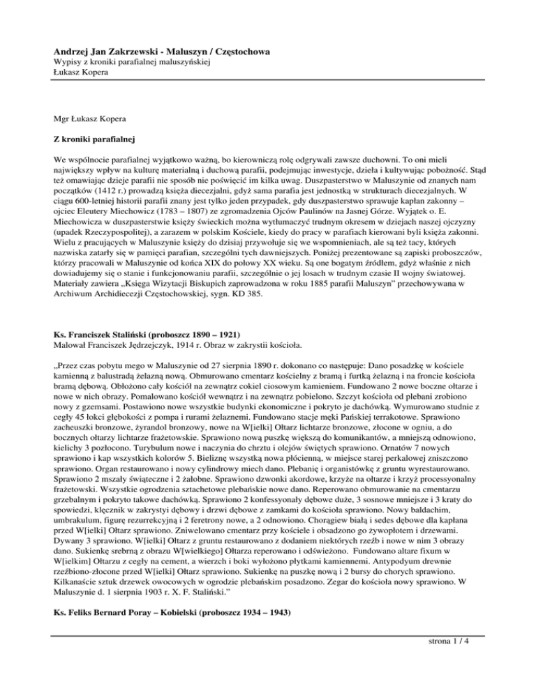 Andrzej Jan Zakrzewski - Maluszyn / Częstochowa Wypisy z kroniki parafialnej maluszyńskiej Łukasz Kopera Mgr Łukasz Kopera Z kroniki parafialnej We wspólnocie parafialnej wyjątkowo ważną, bo kierowniczą rolę odgrywali zawsze duchowni. To oni mieli największy wpływ na kulturę materialną i duchową parafii, podejmując inwestycje, dzieła i kultywując pobożność. Stąd też omawiając dzieje parafii nie sposób nie poświęcić im kilka uwag. Duszpasterstwo w Maluszynie od znanych nam początków (1412 r.) prowadzą księża diecezjalni, gdyż sama parafia jest jednostką w strukturach diecezjalnych. W ciągu 600-letniej historii parafii znany jest tylko jeden przypadek, gdy duszpasterstwo sprawuje kapłan zakonny – ojciec Eleutery Miechowicz (1783 – 1807) ze zgromadzenia Ojców Paulinów na Jasnej Górze. Wyjątek o. E. Miechowicza w duszpasterstwie księży świeckich można wytłumaczyć trudnym okresem w dziejach naszej ojczyzny (upadek Rzeczypospolitej), a zarazem w polskim Kościele, kiedy do pracy w parafiach kierowani byli księża zakonni. Wielu z pracujących w Maluszynie księży do dzisiaj przywołuje się we wspomnieniach, ale są też tacy, których nazwiska zatarły się w pamięci parafian, szczególni tych dawniejszych. Poniżej prezentowane są zapiski proboszczów, którzy pracowali w Maluszynie od końca XIX do połowy XX wieku. Są one bogatym źródłem, gdyż właśnie z nich dowiadujemy się o stanie i funkcjonowaniu parafii, szczególnie o jej losach w trudnym czasie II wojny światowej. Materiały zawiera „Księga Wizytacji Biskupich zaprowadzona w roku 1885 parafii Maluszyn” przechowywana w Archiwum Archidiecezji Częstochowskiej, sygn. KD 385. Ks. Franciszek Staliński (proboszcz 1890 – 1921) Malował Franciszek Jędrzejczyk, 1914 r. Obraz w zakrystii kościoła. „Przez czas pobytu mego w Maluszynie od 27 sierpnia 1890 r. dokonano co następuje: Dano posadzkę w kościele kamienną z balustradą żelazną nową. Obmurowano cmentarz kościelny z bramą i furtką żelazną i na froncie kościoła bramą dębową. Obłożono cały kościół na zewnątrz cokiel ciosowym kamieniem. Fundowano 2 nowe boczne ołtarze i nowe w nich obrazy. Pomalowano kościół wewnątrz i na zewnątrz pobielono. Szczyt kościoła od plebani zrobiono nowy z gzemsami. Postawiono nowe wszystkie budynki ekonomiczne i pokryto je dachówką. Wymurowano studnie z cegły 45 łokci głębokości z pompa i rurami żelaznemi. Fundowano stacje męki Pańskiej terrakotowe. Sprawiono zacheuszki bronzowe, żyrandol bronzowy, nowe na W[ielki] Ołtarz lichtarze bronzowe, złocone w ogniu, a do bocznych ołtarzy lichtarze frażetowskie. Sprawiono nową puszkę większą do komunikantów, a mniejszą odnowiono, kielichy 3 pozłocono. Turybulum nowe i naczynia do chrztu i olejów świętych sprawiono. Ornatów 7 nowych sprawiono i kap wszystkich kolorów 5. Bieliznę wszystką nowa płócienną, w miejsce starej perkalowej zniszczono sprawiono. Organ restaurowano i nowy cylindrowy miech dano. Plebanię i organistówkę z gruntu wyrestaurowano. Sprawiono 2 mszały świąteczne i 2 żałobne. Sprawiono dzwonki akordowe, krzyże na ołtarze i krzyż processyonalny frażetowski. Wszystkie ogrodzenia sztachetowe plebańskie nowe dano. Reperowano obmurowanie na cmentarzu grzebalnym i pokryto takowe dachówką. Sprawiono 2 konfessyonały dębowe duże, 3 sosnowe mniejsze i 3 kraty do spowiedzi, klęcznik w zakrystyi dębowy i drzwi dębowe z zamkami do kościoła sprawiono. Nowy baldachim, umbrakulum, figurę rezurrekcyjną i 2 feretrony nowe, a 2 odnowiono. Chorągiew białą i sedes dębowe dla kapłana przed W[ielki] Ołtarz sprawiono. Zniwelowano cmentarz przy kościele i obsadzono go żywopłotem i drzewami. Dywany 3 sprawiono. W[ielki] Ołtarz z gruntu restaurowano z dodaniem niektórych rzeźb i nowe w nim 3 obrazy dano. Sukienkę srebrną z obrazu W[wielkiego] Ołtarza reperowano i odświeżono. Fundowano altare fixum w W[ielkim] Ołtarzu z cegły na cement, a wierzch i boki wyłożono płytkami kamiennemi. Antypodyum drewnie rzeźbiono-złocone przed W[ielki] Ołtarz sprawiono. Sukienkę na puszkę nową i 2 bursy do chorych sprawiono. Kilkanaście sztuk drzewek owocowych w ogrodzie plebańskim posadzono. Zegar do kościoła nowy sprawiono. W Maluszynie d. 1 sierpnia 1903 r. X. F. Staliński.” Ks. Feliks Bernard Poray – Kobielski (proboszcz 1934 – 1943) strona 1 / 4 Andrzej Jan Zakrzewski - Maluszyn / Częstochowa Wypisy z kroniki parafialnej maluszyńskiej Łukasz Kopera „[1934 r.] Po wyprowadzeniu się Ks. Hamerlinga nastał na probostwie w Maluszynie Ks. Bonawentura Metler i Ks. Romuald Kapkowski jako wikariusz. Ks. Bonawentura Metler nastał do Maluszyna z Kruszyny dnia 23 Maja 1932 roku, a dnia 10 lipca 1934 roku, zamienił się na probostwo Parzymiechy z Ks. Feliksem Bernard Poraj Kobielskim. Zamiana powstała zupełnie dobrowolnie jako między kolegami jednokursowymi w seminarium. Ks. Feliks Bernard Poraj Kobielski, zastał dachy w plebanii i we wszystkich budynkach plebańskich w bardzo opłakanym stanie. Cała plebania oraz budynki zostały z gruntu wyremontowane. Do kościoła przybył jeden obraz na ołtarz oraz jedenaście komży. (…) [1927 r.] Wyremontowano organy kościelne kosztem 1000 zł. Postawiono organistówkę i budynki ekonomiczne murowane, kosztem 8000 złotych. Odmalowano kościół z ołtarzami wewnętrznie i zewnątrz kosztem około 5000 złotych. [1936 r.] Ks. Kapkowski prawie własnym kosztem przystawił przy organistówce salę dla Akcji Katolickiej murowaną... Dnia 20 kwietnia 1936 roku Ks. Wikary zawiózł starze figury, obrazy i różną starzyznę z tutejszego skarbca kościelnego, pochodzącą ze starego, byłego kościoła do Częstochowy do muzeum diecezji. [1937 r.] Pani hrabina Joanna Stanisławowa Potocka z Maluszyna ofiarowała dziesięć komży dla ministrantów. [Antoni] Przesłański malarz z Maluszyna ofiarował dwa obra