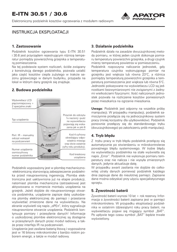 E-ITN 30.51 / 30.6 Elektroniczny podzielnik kosztów ogrzewania z modułem radiowym INSTRUKCJA EKSPLOATACJI 1. Zastosowanie 3. Działanie podzielnika Podzielnik kosztów ogrzewania typu E-ITN 30.51 i 30.6 jest przyrządem rejestrującym różnicę temperatur pomiędzy powierzchnią grzejnika a temperaturą pomieszczenia. Na tej podstawie system rozliczeń, ściśle związany z konstrukcją danego podzielnika, pozwala ustalić jaka część kosztów ciepła zużytego w trakcie sezonu grzewczego w danym budynku, przypada na lokal w którym dany grzejnik się znajduje. Podzielnik działa na zasadzie dwuczujnikowej metody pomiaru, w której jeden czujnik dokonuje pomiaru temperatury powierzchni grzejnika, a drugi czujnik mierzy temperaturę powietrza w pomieszczeniu. Podzielnik rozpoczyna naliczanie jednostek, gdy temperatura czujnika wykonującego pomiar na grzejniku jest większa lub równa 23°C, a różnica pomiędzy temperaturą powierzchni grzejnika a temperaturą pomieszczenia jest większa lub równa 5°C. Jednostki pokazywane na wyświetlaczu LCD są jednostkami bezwymiarowymi nie związanymi z żadnymi wielkościami fizycznymi. Ilość naliczonych jednostek pozwala na rozliczenie kosztów poniesionych przez mieszkańca na ogrzanie mieszkania. 2. Budowa podzielnika Wyświetlacz LCD pięciomiejscowy + 2 specjalne znaki Typ urządzenia Port IR – manualny odczyt wskazań na podczerwień Numer urządzenia osmiocyfrowy numer podzielnika Przycisk do odczytu 1x nacisnij i puść na wyswietlaczu pojawiają się wskazania jak w pkt 6 Kod 4 cyfrowy określający odpowiednio miesiąc oraz dwie ostatnie cyfry roku produkcji. Kod kreskowy urządzena Podzielnik wyposażony jest w plombę mechaniczno-elektroniczną stanowiącą zabezpieczenie podzielnika przed nieuprawnioną ingerencją. Plomba elektroniczna jest uaktywniona już na etapie produkcji, natomiast plomba mechaniczna (zatrzaskowa) jest aktywowana w momencie montażu urządzenia na grzejnik. Jeżeli dojdzie do nieuprawnionego otwarcia podzielnika, urządzenie zapisze datę uszkodzenia plomby elektronicznej do pamięci i przestanie wyświetlać zmierzone dane na wyświetlaczu. Na ekranie wyświetli się napis „oPEn“, który sygnalizuje nieuprawnione otwarcie urządzenia. Podzielnik kontynuuje pomiary i przesyłanie danych! Informacje o uszkodzonej plombie elektronicznej są dostępne w przesyłanych danych przez moduł radiowy, a także przez interfejs IR na podczerwień. Urządzenie jest zasilane baterią litową i wyposażone jest w 16 bitowy mikrokontroler z bardzo niskim poborem energii, a także w moduł radiowy. Uwaga: Podzielnik jest odporny na wszelkie próby manipulacji. W przypadku manipulacji, podzielnik samoczynnie przełącza się na jednoczujnikowy system pracy (mniej korzystny dla użytkowników). Podzielnik ponownie przełączy się do standardowego trybu (dwuczujnikowego) po zakończeniu prób manipulacji. 4. Tryb błędu Z trybu pracy w tryb błędu podzielnik przełączy się automatycznie po stwierdzeniu w mikrokontrolerze poważnego błędu systemowego. W trybie błędu na wyświetlaczu podzielnika na stałe wyświetla się napis „Error”. Podzielnik nie wykonuje pomiaru temperatury oraz nie nalicza i nie wysyła zmierzonych danych, jedynie aktualizuje datę. W przypadku awarii zasilania nie dojdzie do całkowitej utraty danych ponieważ podzielnik każdego dnia zapisuje dane do nieulotnej pamięci. Zapisane dane można odzyskać przy użyciu specjalistycznego sprzętu. 5. Żywotność baterii Żywotność baterii wynosi 10 lat + rok rezerwy. Informacja o żywotności baterii zapisana jest w pamięci mikrokontrolera. W przypadku eksploatacji podzielnika w ostatnim (dziesiątym) roku pracy baterii, na wyświetlaczu pojawi się migający symbol „BAT”. Po upływie tego czasu symbol „BAT” będzie trwale wyświetlony. 6. Odczytywanie wskazań podzielnika Legenda 6.1. Odczyt wskazań z wyswietlacza Krótkie naciśnięcie przycisku Pozycje menu na wyświetlaczu zmieniają się regularnie co 6 sekund Brak naciśnięcia przycisku w przeciągu 20 sekund Brak naciśnięcia przycisku w przeciągu ~1,5 minuty powoduje przejście wyświetlacza w stan uśpienia (wyświetlacz wyłączony) *)Wyświetlanie pozycji może być wyłączone podczas konfiguracji urządzenia. Podzielnik 30.51 Wyświetlacz wyłączony 3.12. test wyświetlacza aktualna data 6.2. Odczyt radiowy u 1.12. data początku rocznego okresu rozliczeniowego 1258SM pomiar podzielnika za poprzedni roczny okres rozliczeniowy 22.7°_CSM średnia temperatura pomieszczenia za poprzedni roczny okres rozliczeniowy 526 pomiar podzielnika za bieżący roczny okres rozliczeniowy Podzielnik 30.6 Wyświetlacz wyłączony 2245 6.2.1. Dane wysyłane radiowo przez podzielnik pomiar podzielnika za aktualny roczny okres rozliczeniowy 4458SM pomiar za poprzedni roczny okres rozliczeniowy ...5.8. pomiar za aktualny miesięczny okres rozliczeniowy .2.1.5.8.SM pomiar za poprzedni miesięczny okres rozliczeniowy -3600 numer seryjny podzielnika – część wyższa 0060- numer seryjny podzielnika – część niższa 53.3°C temperatura czujnika na grzejniku * 32.7°CSM Dzięki wyposażeniu podzielnika w zintegrowany moduł radiowy, wskazania urządzenia mogą być zdalnie odczytywane przez inkasenta bez potrzeby wchodzenia do mieszkania. Tym samym nie jest wymagana obecność użytkownika w mieszkaniu w trakcie odczytu wskazań. Zmierzone dane są nadawane w krótkich ramkach o czasie nadawania: • Podzielnik 30.51 ~ 5ms z częstotliwością nadawania co 30 sek przez pierwszy miesiąc i co 240 sek przez pozostałe 11 miesięcy okresu rocznego • Podzielnik 30.6 ~ 5 ms z częstotliwością nadawania od 44s (okres rozliczeniowy) do 12 minut (okres letni). Moc nadajnika radiowego wynosi 1 mW. temperatura czujnika otoczenia * u 1.2. data początku rocznego okresu rozliczeniowego * 10.12. aktualna data * 12-45 aktualny czas * – Numer seryjny podzielnika – Data początku okr