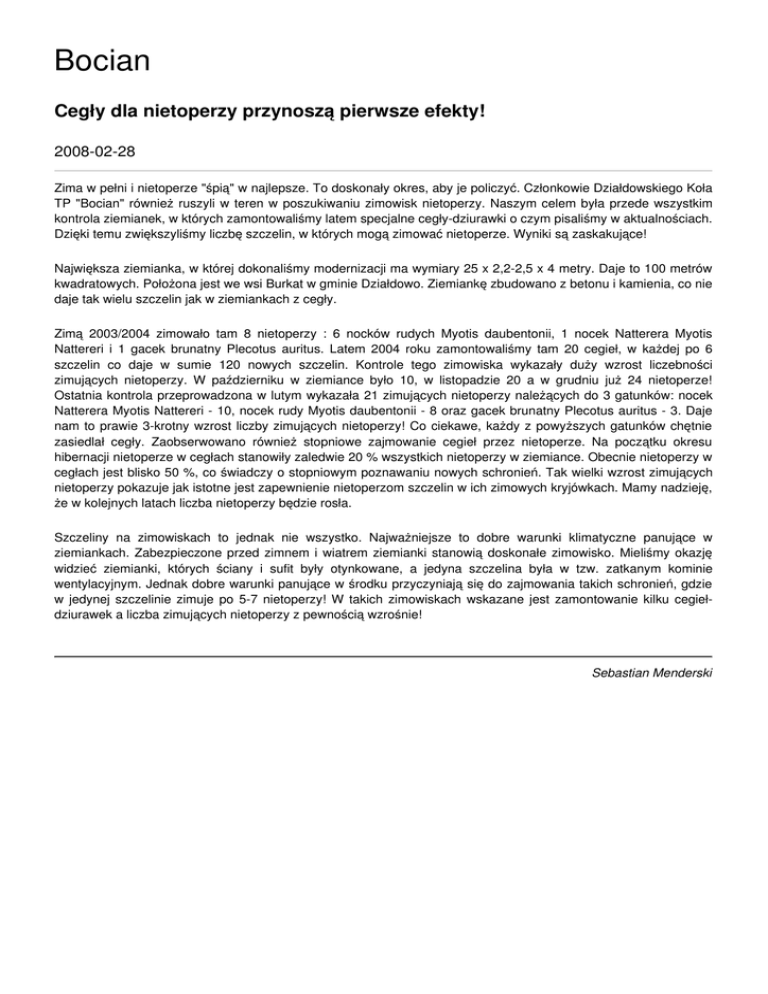 Bocian Cegły dla nietoperzy przynoszą pierwsze efekty! 2008-02-28 Zima w pełni i nietoperze "śpią" w najlepsze. To doskonały okres, aby je policzyć. Członkowie Działdowskiego Koła TP "Bocian" również ruszyli w teren w poszukiwaniu zimowisk nietoperzy. Naszym celem była przede wszystkim kontrola ziemianek, w których zamontowaliśmy latem specjalne cegły-dziurawki o czym pisaliśmy w aktualnościach. Dzięki temu zwiększyliśmy liczbę szczelin, w których mogą zimować nietoperze. Wyniki są zaskakujące! Największa ziemianka, w której dokonaliśmy modernizacji ma wymiary 25 x 2,2-2,5 x 4 metry. Daje to 100 metrów kwadratowych. Położona jest we wsi Burkat w gminie Działdowo. Ziemiankę zbudowano z betonu i kamienia, co nie daje tak wielu szczelin jak w ziemiankach z cegły. Zimą 2003/2004 zimowało tam 8 nietoperzy : 6 nocków rudych Myotis daubentonii, 1 nocek Natterera Myotis Nattereri i 1 gacek brunatny Plecotus auritus. Latem 2004 roku zamontowaliśmy tam 20 cegieł, w każdej po 6 szczelin co daje w sumie 120 nowych szczelin. Kontrole tego zimowiska wykazały duży wzrost liczebności zimujących nietoperzy. W październiku w ziemiance było 10, w listopadzie 20 a w grudniu już 24 nietoperze! Ostatnia kontrola przeprowadzona w lutym wykazała 21 zimujących nietoperzy należących do 3 gatunków: nocek Natterera Myotis Nattereri - 10, nocek rudy Myotis daubentonii - 8 oraz gacek brunatny Plecotus auritus - 3. Daje nam to prawie 3-krotny wzrost liczby zimujących nietoperzy! Co ciekawe, każdy z powyższych gatunków chętnie zasiedlał cegły. Zaobserwowano również stopniowe zajmowanie cegieł przez nietoperze. Na początku okresu hibernacji nietoperze w cegłach stanowiły zaledwie 20 % wszystkich nietoperzy w ziemiance. Obecnie nietoperzy w cegłach jest blisko 50 %, co świadczy o stopniowym poznawaniu nowych schronień. Tak wielki wzrost zimujących nietoperzy pokazuje jak istotne jest zapewnienie nietoperzom szczelin w ich zimowych kryjówkach. Mamy nadzieję, że w kolejnych latach liczba nietoperzy będzie rosła. Szczeliny na zimowiskach to jednak nie wszystko. Najważniejsze to dobre warunki klimatyczne panujące w ziemiankach. Zabezpieczone przed zimnem i wiatrem ziemianki stanowią doskonałe zimowisko. Mieliśmy okazję widzieć ziemianki, których ściany i sufit były otynkowane, a jedyna szczelina była w tzw. zatkanym kominie wentylacyjnym. Jednak dobre warunki panujące w środku przyczyniają się do zajmowania takich schronień, gdzie w jedynej szczelinie zimuje po 5-7 nietoperzy! W takich zimowiskach wskazane jest zamontowanie kilku cegiełdziurawek a liczba zimujących nietoperzy z pewnością wzrośnie! Sebastian Menderski