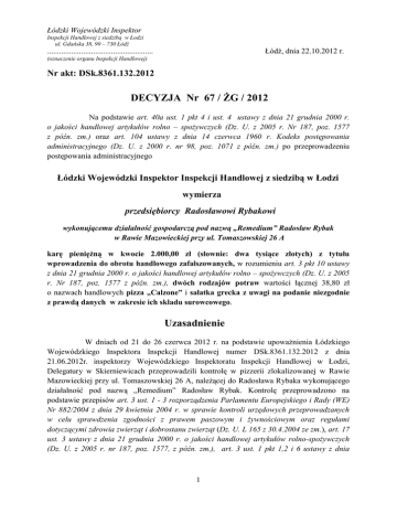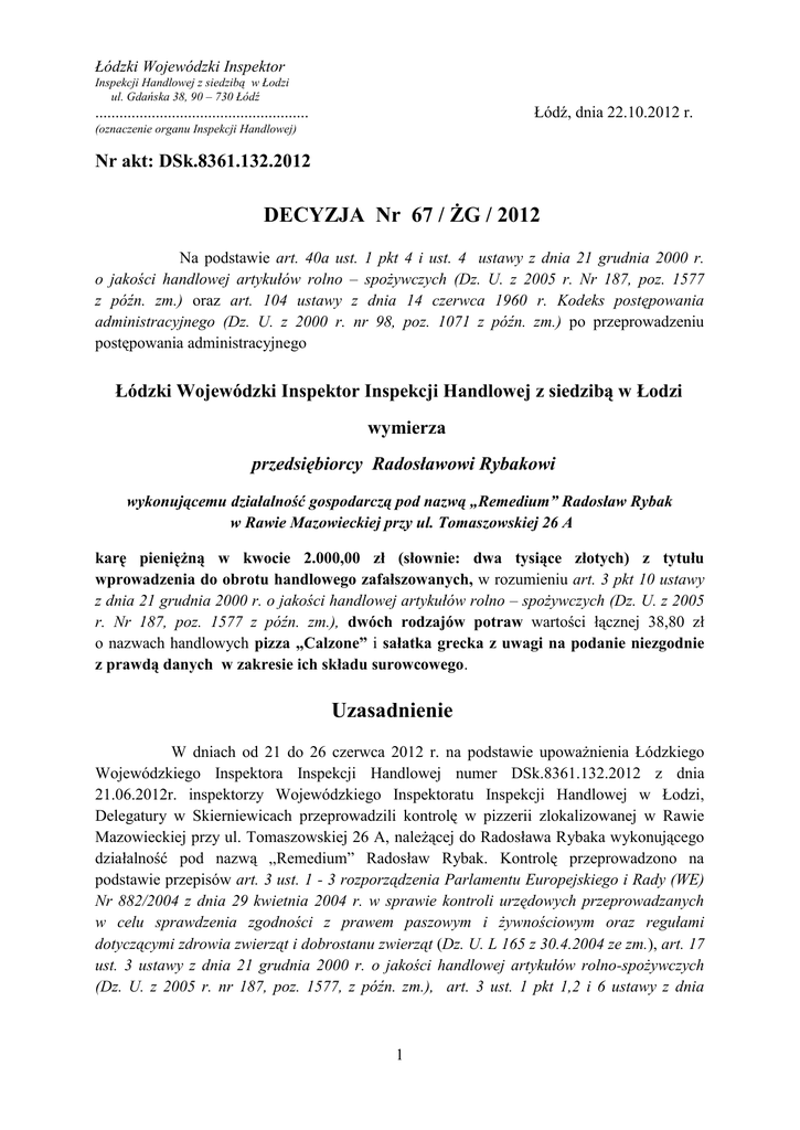 Łódzki Wojewódzki Inspektor Inspekcji Handlowej z siedzibą w Łodzi ul. Gdańska 38, 90 – 730 Łódź Łódź, dnia 22.10.2012 r. ..................................................... (oznaczenie organu Inspekcji Handlowej) Nr akt: DSk.8361.132.2012 DECYZJA Nr 67 / ŻG / 2012 Na podstawie art. 40a ust. 1 pkt 4 i ust. 4 ustawy z dnia 21 grudnia 2000 r. o jakości handlowej artykułów rolno – spożywczych (Dz. U. z 2005 r. Nr 187, poz. 1577 z późn. zm.) oraz art. 104 ustawy z dnia 14 czerwca 1960 r. Kodeks postępowania administracyjnego (Dz. U. z 2000 r. nr 98, poz. 1071 z późn. zm.) po przeprowadzeniu postępowania administracyjnego Łódzki Wojewódzki Inspektor Inspekcji Handlowej z siedzibą w Łodzi wymierza przedsiębiorcy Radosławowi Rybakowi wykonującemu działalność gospodarczą pod nazwą „Remedium” Radosław Rybak w Rawie Mazowieckiej przy ul. Tomaszowskiej 26 A karę pieniężną w kwocie 2.000,00 zł (słownie: dwa tysiące złotych) z tytułu wprowadzenia do obrotu handlowego zafałszowanych, w rozumieniu art. 3 pkt 10 ustawy z dnia 21 grudnia 2000 r. o jakości handlowej artykułów rolno – spożywczych (Dz. U. z 2005 r. Nr 187, poz. 1577 z późn. zm.), dwóch rodzajów potraw wartości łącznej 38,80 zł o nazwach handlowych pizza „Calzone” i sałatka grecka z uwagi na podanie niezgodnie z prawdą danych w zakresie ich składu surowcowego. Uzasadnienie W dniach od 21 do 26 czerwca 2012 r. na podstawie upoważnienia Łódzkiego Wojewódzkiego Inspektora Inspekcji Handlowej numer DSk.8361.132.2012 z dnia 21.06.2012r. inspektorzy Wojewódzkiego Inspektoratu Inspekcji Handlowej w Łodzi, Delegatury w Skierniewicach przeprowadzili kontrolę w pizzerii zlokalizowanej w Rawie Mazowieckiej przy ul. Tomaszowskiej 26 A, należącej do Radosława Rybaka wykonującego działalność pod nazwą „Remedium” Radosław Rybak. Kontrolę przeprowadzono na podstawie przepisów art. 3 ust. 1 - 3 rozporządzenia Parlamentu Europejskiego i Rady (WE) Nr 882/2004 z dnia 29 kwietnia 2004 r. w sprawie kontroli urzędowych przeprowadzanych w celu sprawdzenia zgodności z prawem paszowym i żywnościowym oraz regułami dotyczącymi zdrowia zwierząt i dobrostanu zwierząt (Dz. U. L 165 z 30.4.2004 ze zm.), art. 17 ust. 3 ustawy z dnia 21 grudnia 2000 r. o jakości handlowej artykułów rolno-spożywczych (Dz. U. z 2005 r. nr 187, poz. 1577, z późn. zm.), art. 3 ust. 1 pkt 1,2 i 6 ustawy z dnia 1 15 grudnia 2000 r. o Inspekcji Handlowej (Dz. U. z 2009 r. Nr 151, poz. 1219 z późn. zm.) w obecności osoby upoważnionej do reprezentowania przedsiębiorcy (…). Inspektorzy występując w charakterze nabywców zakupili pizzę „Calzone” w cenie 23,90 zł i sałatkę grecką w cenie 14,90 zł. Przedmiotowe potrawy zostały wyprodukowane na zamówienie w dniu 21 czerwca 2012 r. w pizzerii zlokalizowanej w Rawie Mazowieckiej przy ul. Tomaszowskiej 26 A, należącej do Radosława Rybaka wykonującego działalność pod nazwą „Remedium” Radosław Rybak. Zamówienie zostało złożone w oparciu o dane zawarte w kartach menu dostępnych w sali konsumpcyjnej. Zgodnie z zawartą w nich deklaracją w skład pizzy „Calzone” wchodziły ser, szynka, kabanos, bekon, salami, zaś w skład sałatki greckiej wchodziły sałata lodowa, ogórek, papryka, pomidor, oliwki czarne i zielone, cebula czerwona, feta, sos vinegrette, pieczywo czosnkowe. W toku czynności kontrolnych stwierdzono, że na stanie magazynowym placówki nie było dwóch surowców deklarowanych w kartach menu to jest sera i „sera Feta”. Znajdowały się natomiast inne surowce - wyrób seropodobny pod nazwą „JAVOR” w ilości 23 kg, wyprodukowany przez Spółdzielnię Mleczarską „MLEKOVITA”, Wysokie Mazowieckie, ul. Ludowa 122 oraz ser sałatkowo-kanapkowy półtłusty „LUXMILK” w ilości 2 opakowań, wyprodukowany dla „Biedronki” przez Spółdzielnię Mleczarską „MLEKOVITA” Wysokie Mazowieckie, ul. Ludowa 122, które jak oświadczyła (pismo z dnia 26 czerwca 2012 r.) osoba upoważniona do reprezentowania strony (…) były wykorzystane do wyprodukowania pizzy „Calzone” i sałatki greckiej. Ujawniony w toku kontroli przypadek zafałszowania artykułów rolno – spożywczych nie miał charakteru jednostkowego. Jak oświadczyła (…) w okresie od 15 kwietnia 2012 r. do 21 czerwca 2012 r. do produkcji pizzy zamiast deklarowanego w kartach menu sera wykorzystywany był wyrób seropodobny pod nazwą „JAVOR”, zaś do produkcji sałatki greckiej (wprowadzonej do oferty handlowej od dnia 15 kwietnia 2012r.) zamiast deklarowanego sera Feta wykorzystywano ser sałatkowo-kanapkowy półtłusty „LUXMILK”. Strona w miesiącu czerwcu 2012 r. dokonała zakupu: 180,92 kg wyrobu seropodobnego „JAVOR” (ustalono na podstawie okazanych 5 faktur wystawionych w okresie od 05 do 21 czerwca 2012 r. przez firmę „SUPPORT’ Piotr Kotaniec, Jankowice 43, 26-420 Nowe Miasto nad Pilicą); 11 sztuk sera sałatkowo-kanapkowego półtłustego „LUXMILK” (ustalono na podstawie 3 paragonów wystawionych w dniach 01, 06 i 12 czerwca 2012 r. przez sklep „Biedronka” nr 2781, „Jeronimo Martins Dystrybucja” S. A. w Rawie Mazowieckiej, ul. Słowackiego 6). Nieprawidłowości zostały udokumentowane w protokole kontroli z dnia 21 czerwca 2012r. (numer akt DSk.8361.132.2012) i protokole oględzin numer 1 i 2 z dnia 21 czerwca 2012 r. Ujawnione nieprawidłowości w zakresie oznakowania potraw, polegające na podaniu niezgodnie z prawdą danych w zakresie składu surowcowego świadczyły o ich zafałszowaniu w rozumieniu art. 3 pkt 10 ustawy z dnia 21 grudnia 2000 r. o jakości 2 handlowej artykułów rolno – spożywczych (Dz. U. z 2005 r. Nr 187, poz. 1577 z późn. zm.), zwanej dalej „ustawą o jakości”. W związku z powyższym w dniu 23 sierpnia 2012 r. zostało wszczęte z urzędu postępowanie administracyjne w przedmiocie wymierzenia, na podstawie art. 40 a ust. 1 pkt 4 ustawy o ja
